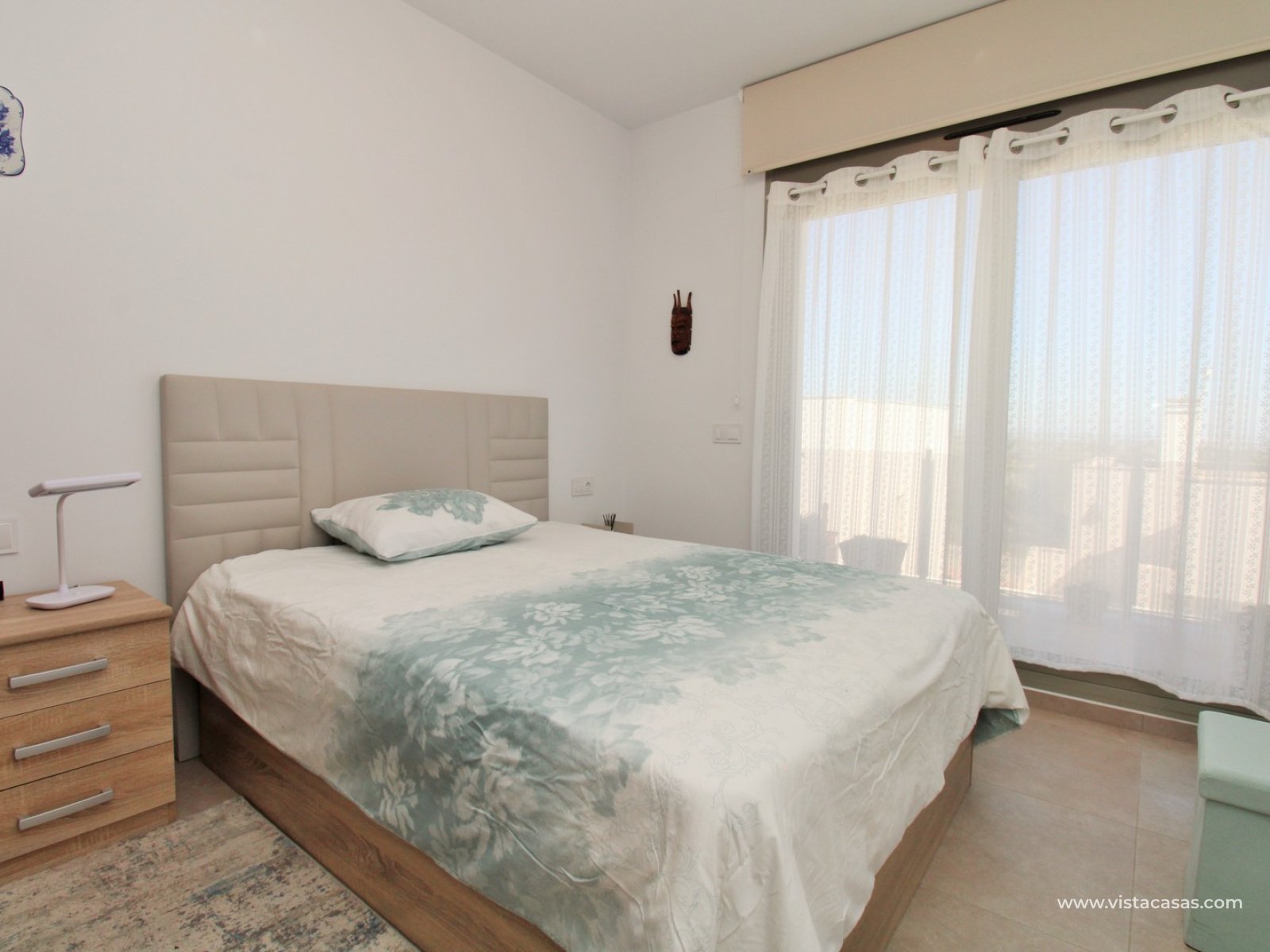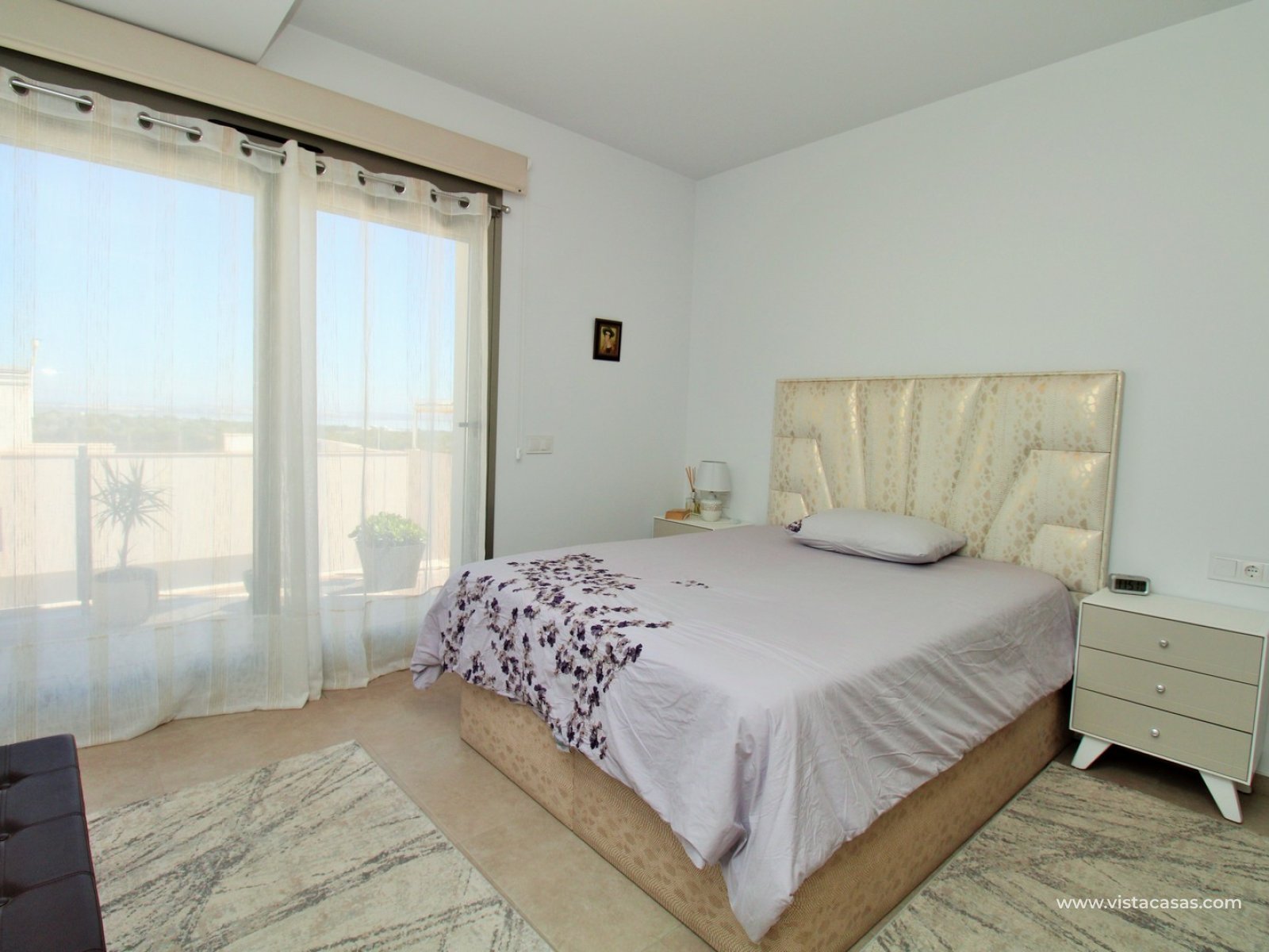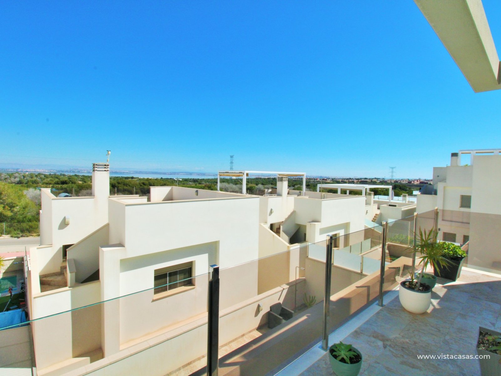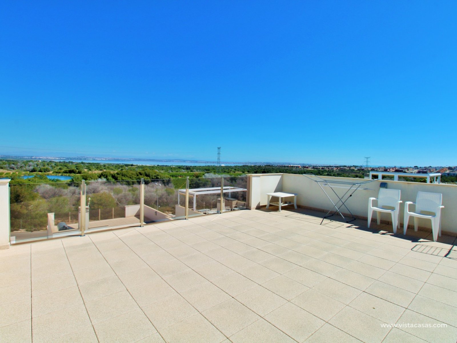 Upstairs, there are two spacious double bedrooms, both offering en-suite bathrooms with walk-in showers and access to a private balcony. From the landing, you can access the impressive roof solarium, enjoying all-day sunshine and open views towards the Torrevieja salt lakes.
