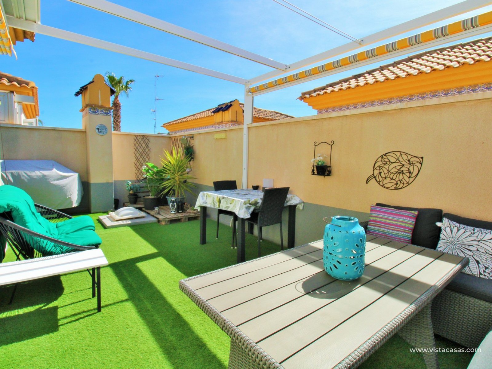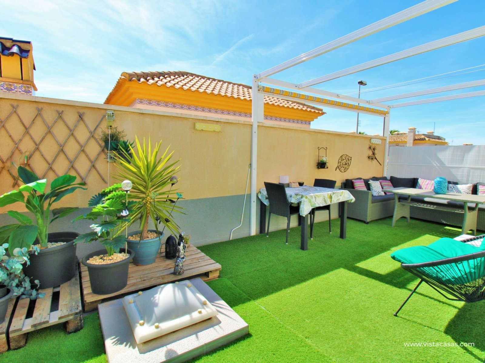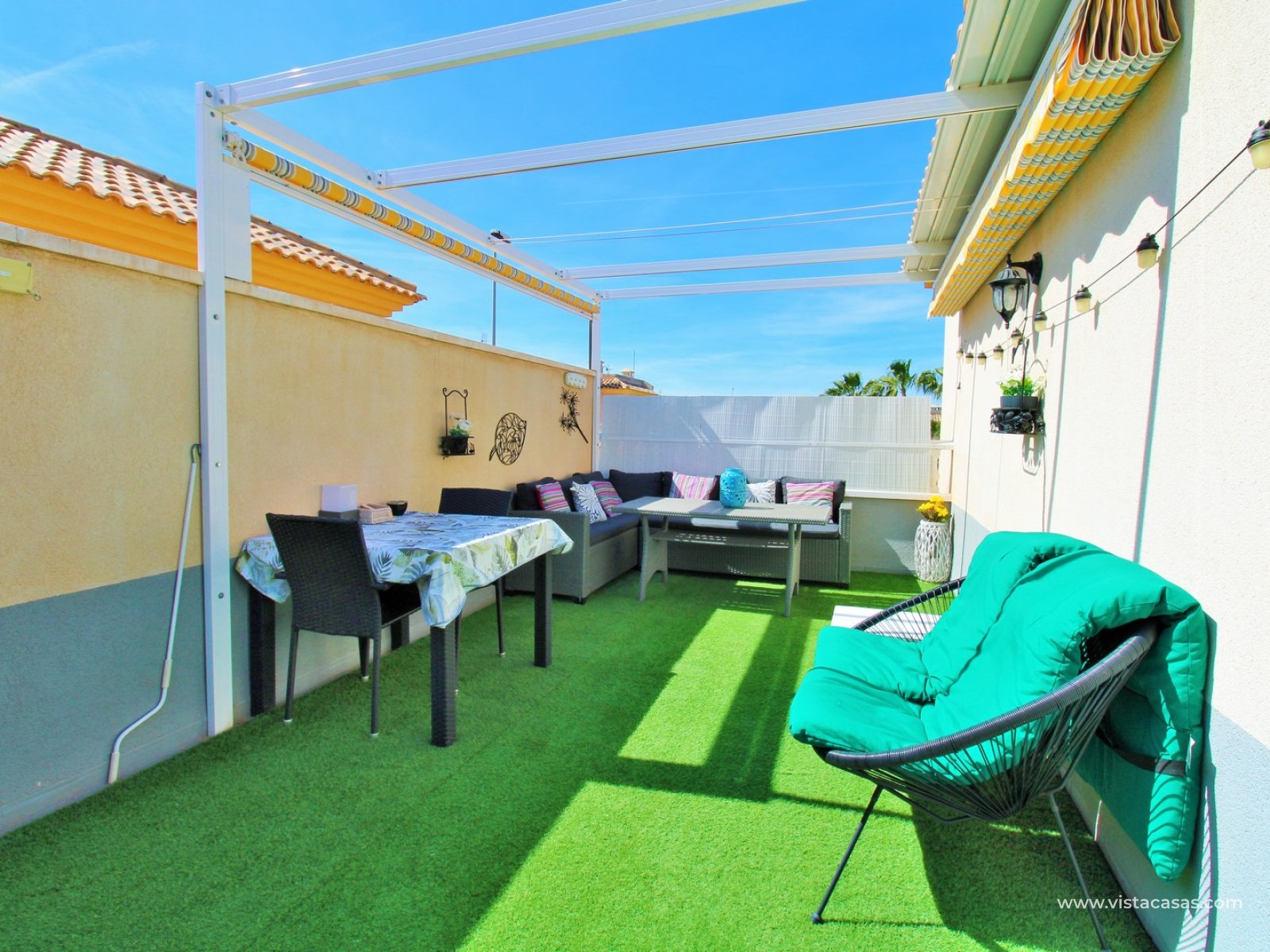 Upstairs, you will find the master bedroom with fitted wardrobes and a second bathroom with walk-in shower. From the landing, there is direct access to the private L-shaped solarium, which has been set up as a cosy outdoor space with seating area, retractable awnings, and artificial grass.