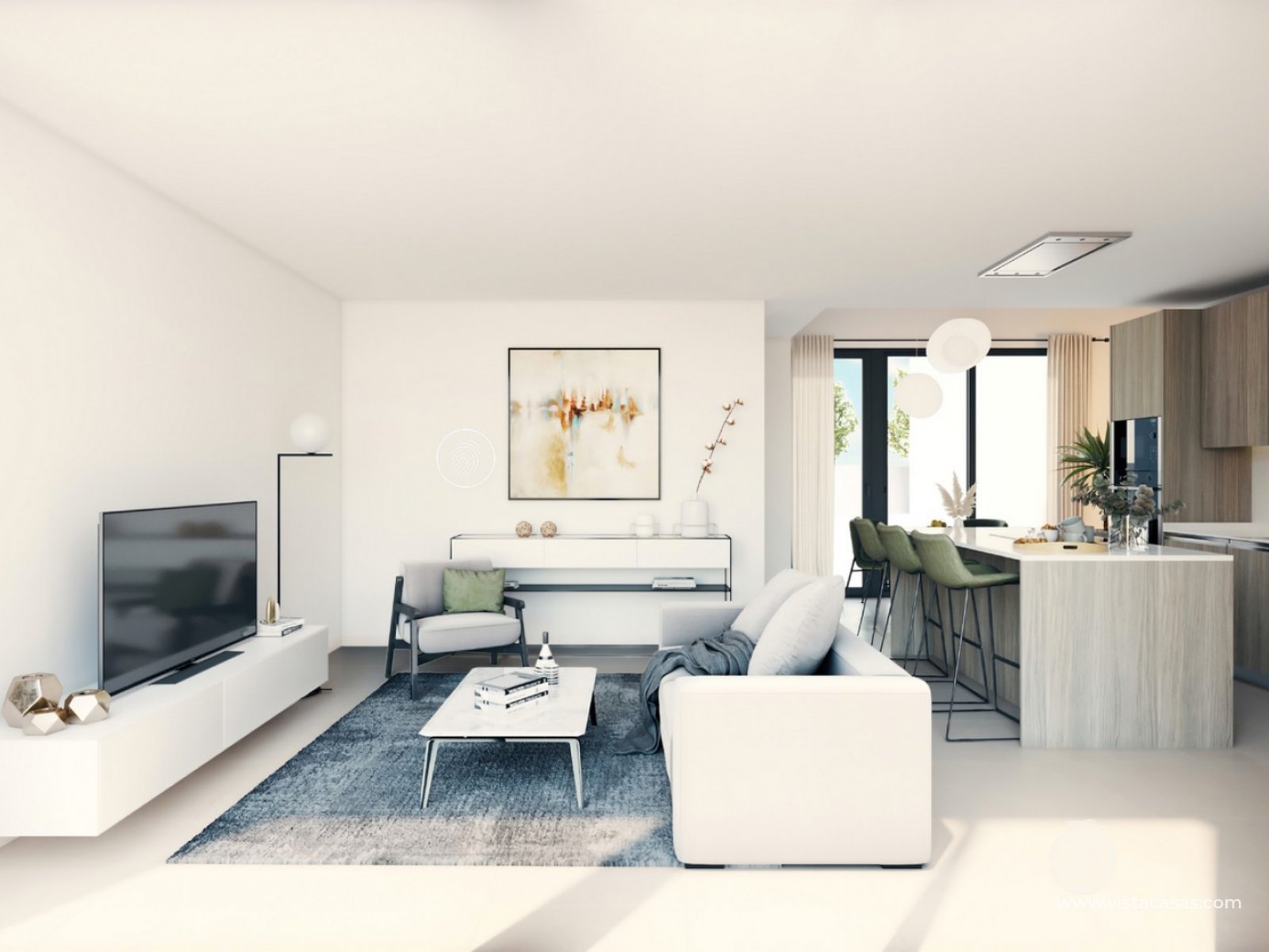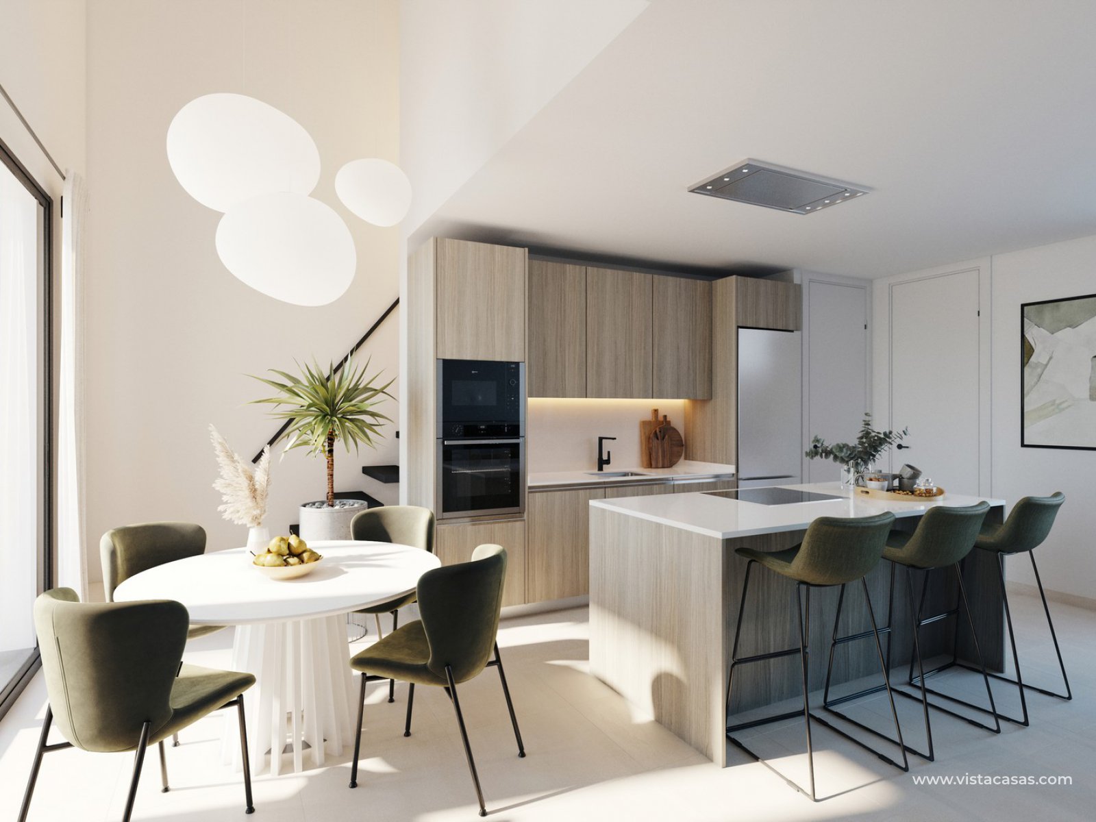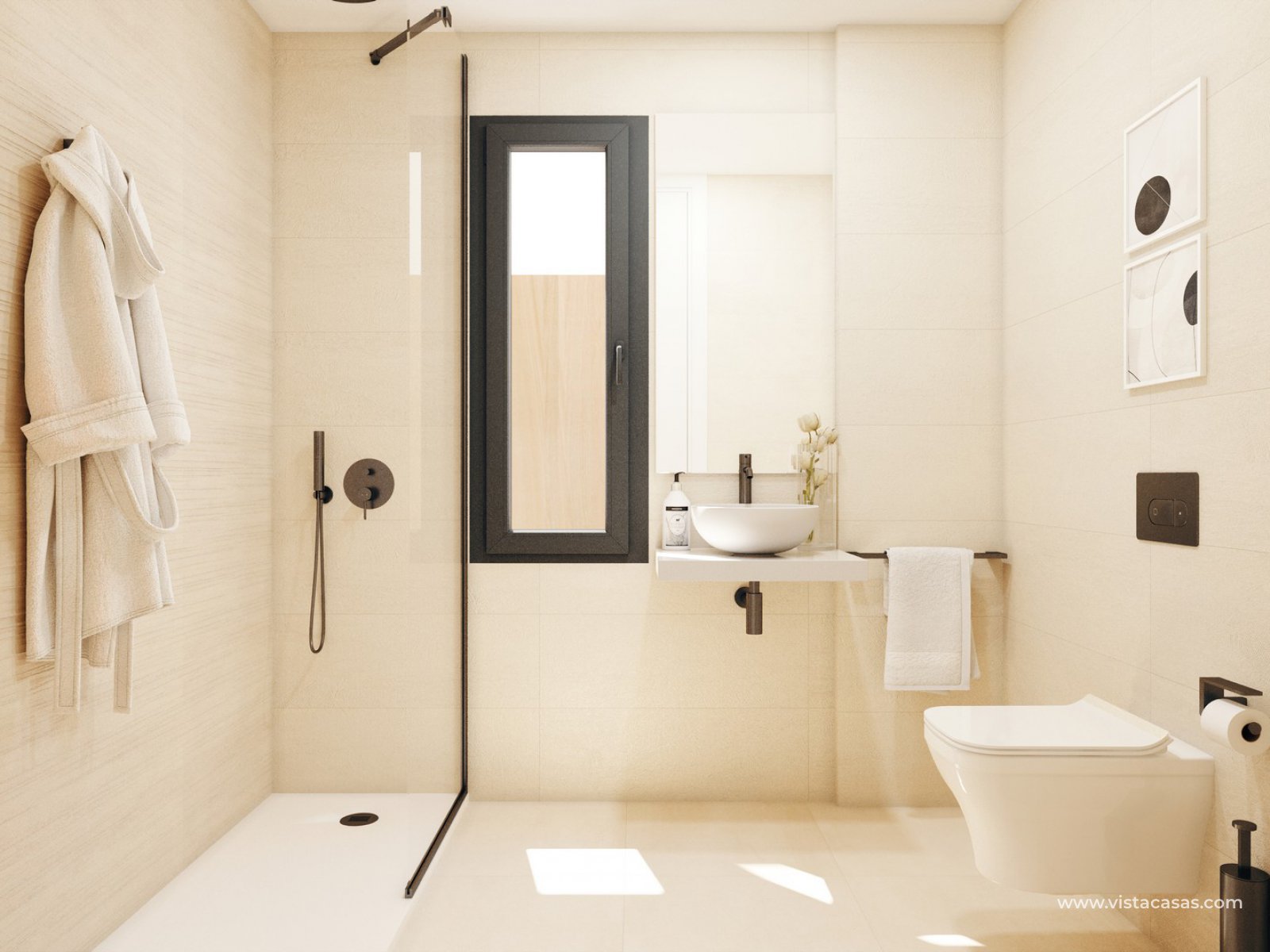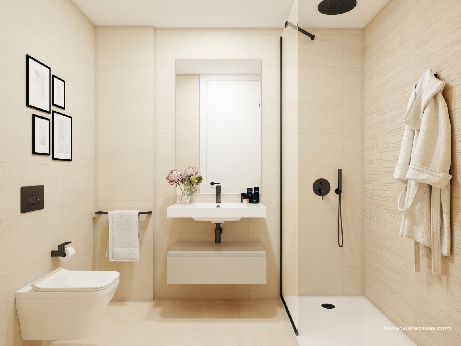 As properties are sold off-plan and due to be completed in December 2022, there are various customization options available to select the combination of materials of your choice if you reserve quick. There are 4 different flooring and tiling options. There are also 2 kitchen colours available: Nubol White or Etimoe Land (Oak) to combine with the snow-white countertop made 100% of Krion K-Live Eco-Active, a solid material that purifies the air, is anti-bacteria and easy to clean. All the materials, flooring, tiles, bathrooms, and kitchen are from Porcelanosa.