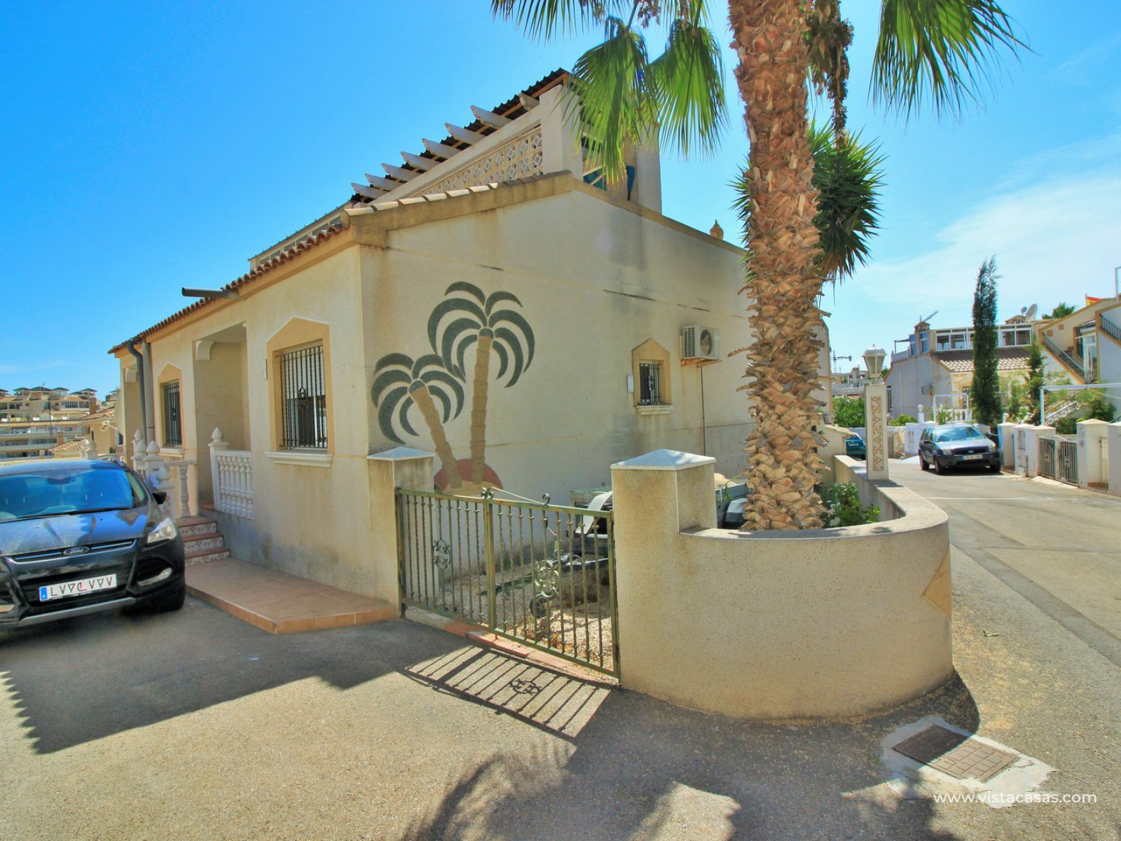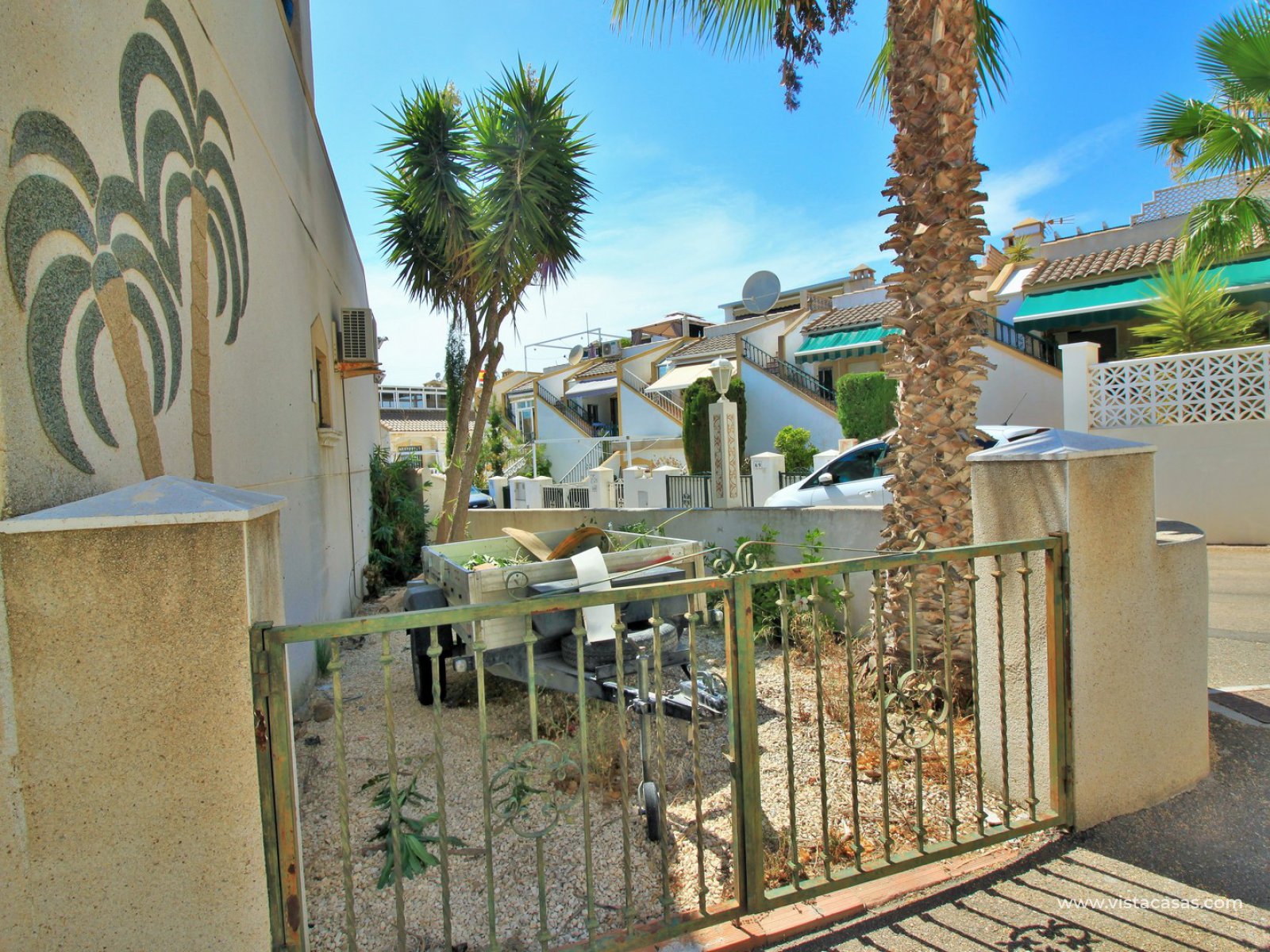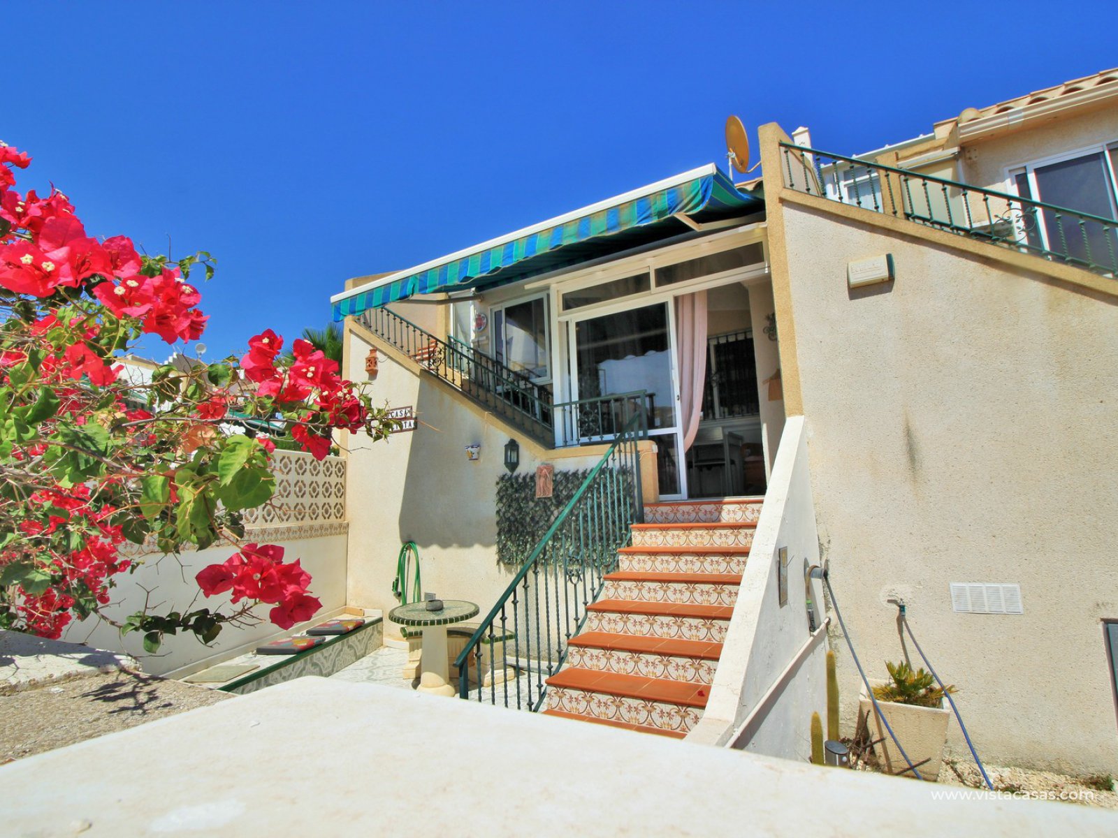 Situated in a quiet cul-de-sac, this end-of-terrace property offers an elevated en-closed front terrace, leading into a spacious lounge with open fireplace and American style kitchen with separate utility room. Both bedrooms are situated to the rear and share a family bathroom. The master bedroom has patio doors leading out to the rear of the house. The front garden is tiled and receives lots of sunshine during the afternoon. There is also a private gated driveway to the rear of the property. The private roof solarium is accessible from the front terrace which offers views of the local area. Just a short walk away is the gated communal pool. Sold furnished with air-conditioning.