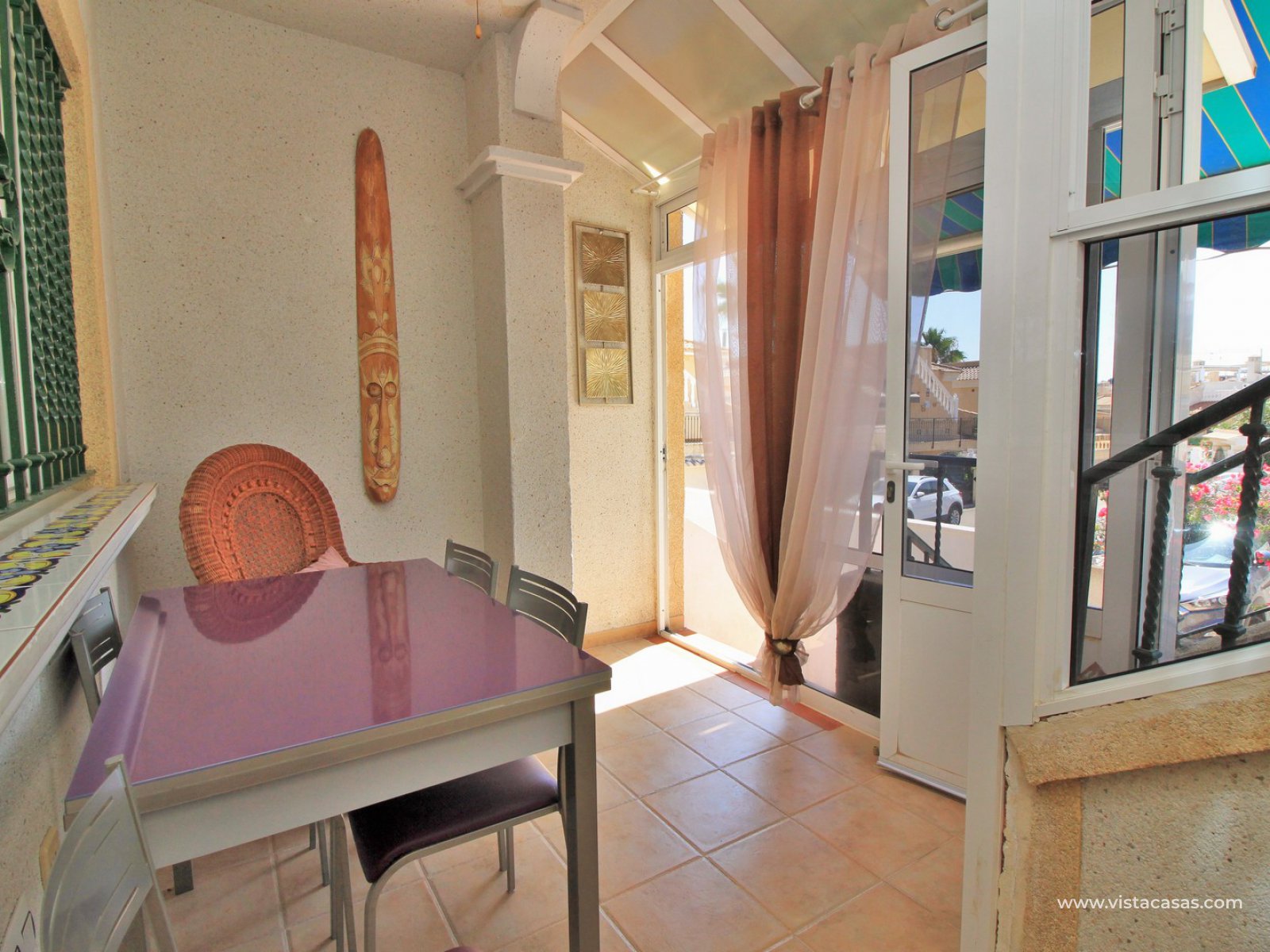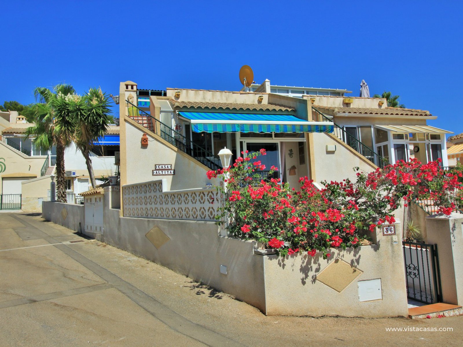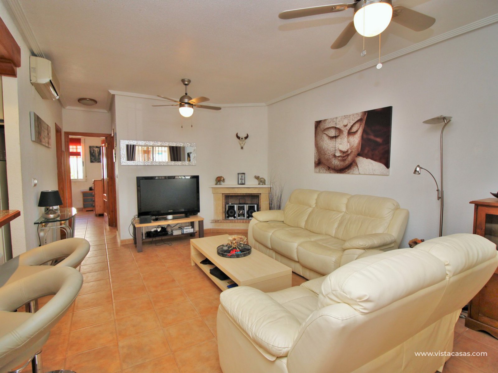 Situated in a quiet cul-de-sac, this end-of-terrace property offers an elevated en-closed front terrace, leading into a spacious lounge with open fireplace and American style kitchen with separate utility room. Both bedrooms are situated to the rear and share a family bathroom. The master bedroom has patio doors leading out to the rear of the house. The front garden is tiled and receives lots of sunshine during the afternoon. There is also a private gated driveway to the rear of the property. The private roof solarium is accessible from the front terrace which offers views of the local area. Just a short walk away is the gated communal pool. Sold furnished with air-conditioning.