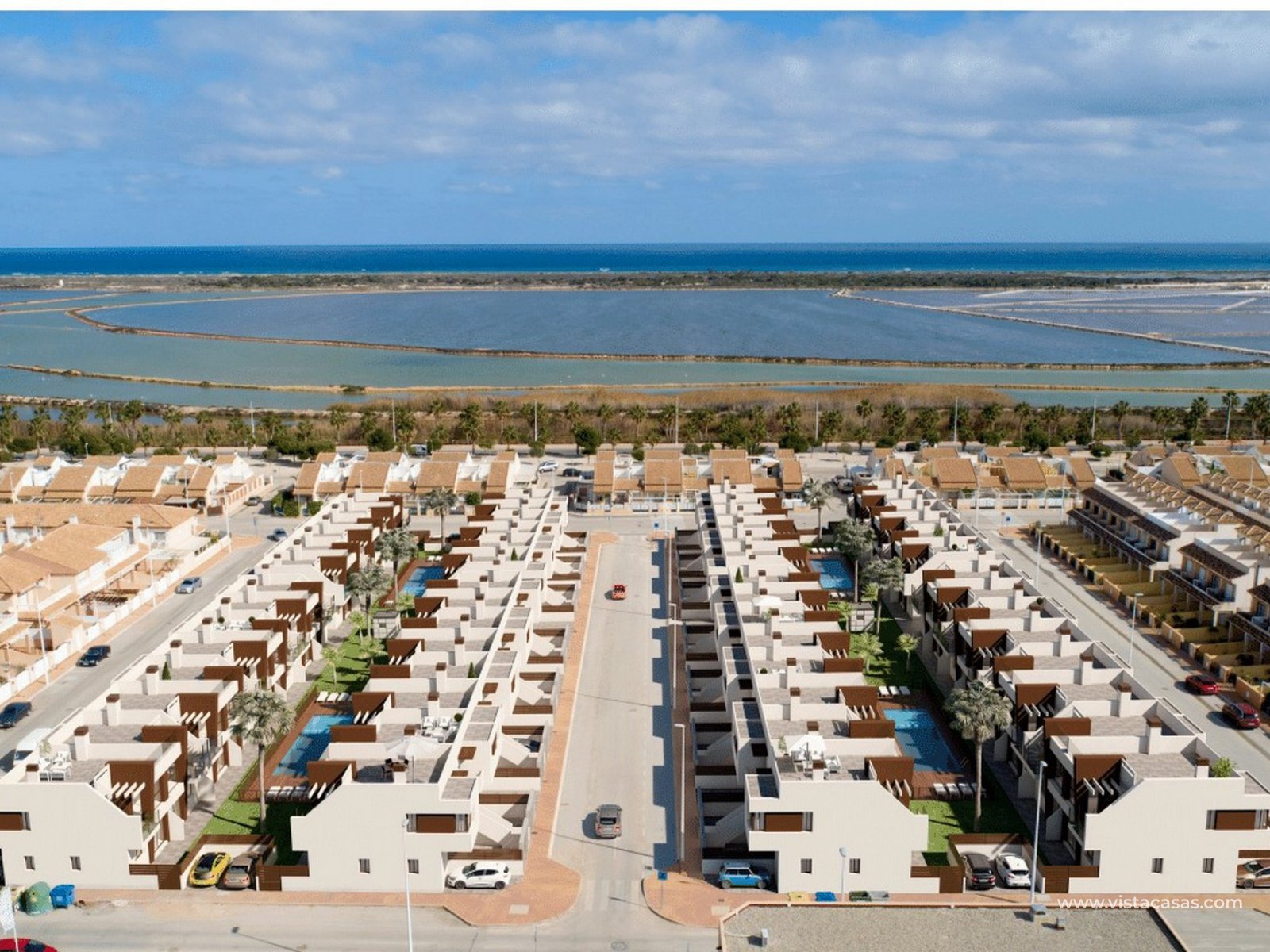New build apartments located in San Pedro del Pinatar and close to Lo Pagan, close to all local amenities and the beautiful beaches of the Mar Menor, the famous mud-baths, are less than 10 minutes away by car and access to the AP-7 motorway is also close by with cities such as Cartagena, Murcia and Alicante within easy reach. The complex has ground floor apartments with a big terrace, and top floors with a private solarium. All apartments have 2 bedrooms and 2 bathrooms, a spacious open-plan lounge, kitchen, and dining area. Both bedrooms have fitted wardrobes, and the master bedroom has an en-suite bathroom. The terrace can be accessed from the lounge and the master bedroom. For the top-floor apartments, the private solarium can be accessed from the terrace. Each apartment includes pre-installation for AC, and a private parking space. Within the complex are a garden area, and two large pools, with a children’s area.