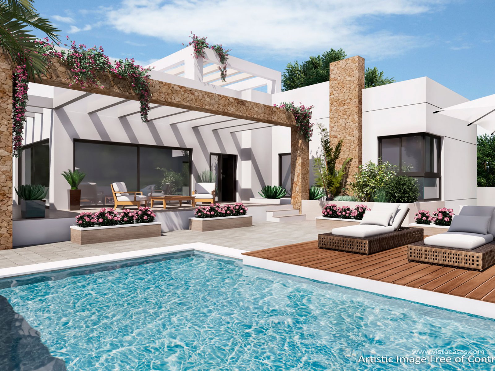 New build, south facing, luxury single level villa in Doña Pepa, Quesada, on a plot of 586m2 with an 8 x 4 metre private pool and gardens and roof solarium of 110m2 from where there are unobstructed views. The villa is located close to many amenities, La Marquesa Golf, Las Lagunas de la Mata natural park and a few minutes drive away the beautiful Playa El Moncayo beach and Guardamar Del Segura. Alicante airport is approximately 30 minutes away by car. The property has a total of 195.00 m2 of surface build, 78.00 m2 of terrace, 3 double bedrooms, 3 bathrooms with underfloor heating, an equipped kitchen, white lacquered interior carpentry, air conditioning, fitted wardrobes, central heating. Beautifully designed villa well worth viewing!!