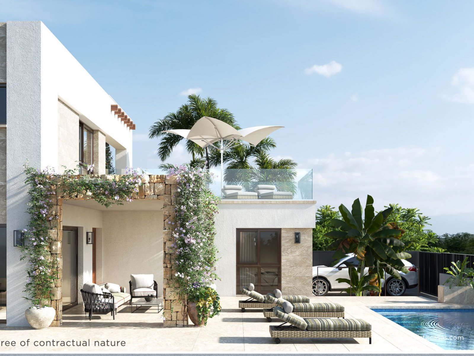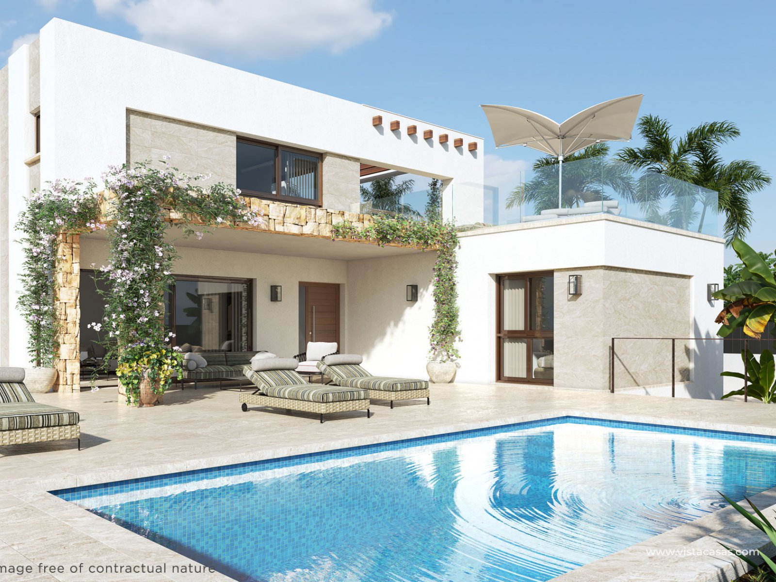 New build, luxury villas in Doña Pepa, Quesada, on plots of 415m2 with a private pool and gardens and a spacious terrace of 73m2. The villas are located close to many amenities, La Marquesa Golf, Las Lagunas de la Mata natural park and a few minutes drive away the beautiful Playa El Moncayo beach and Guardamar Del Segura. Alicante airport is approximately 30 minutes away by car. The properties have a total of 152.73 m2 of surface build, ample terracing, 3 double bedrooms, 3 bathrooms with underfloor heating, an equipped kitchen, white lacquered interior carpentry, air conditioning, fitted wardrobes, central heating. Beautifully designed villa well worth viewing!!