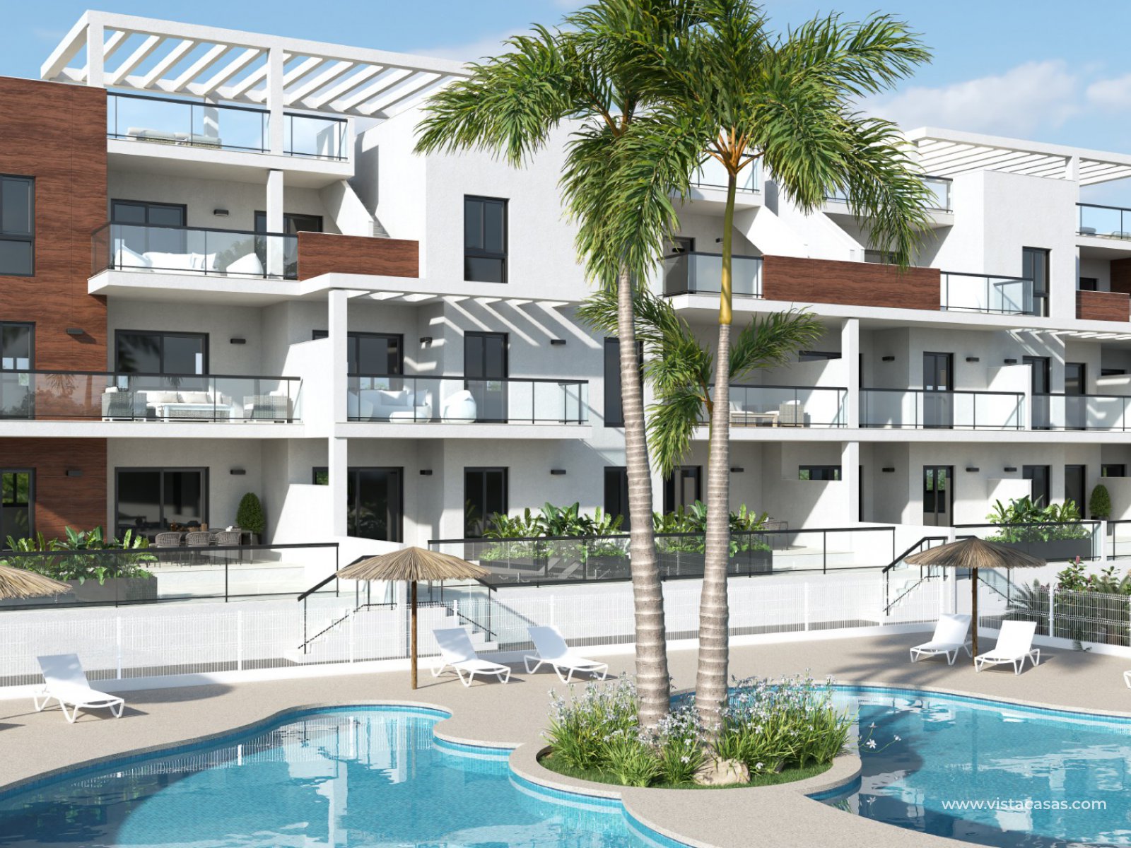 New build apartments in Torre de la Horadada with communal pool and gardens, close to Playa de las Higueras beach, on the Costa Blanca. Close to all the daily necessities, like supermarkets, restaurants, bars and cafés. The apartments have 2 bedrooms, 2 bathrooms, and an open lounge, dining area and kitchen, with access to a balcony terrace. The complex includes a communal pool and gardens. The top floor properties have a spacious roof solarium