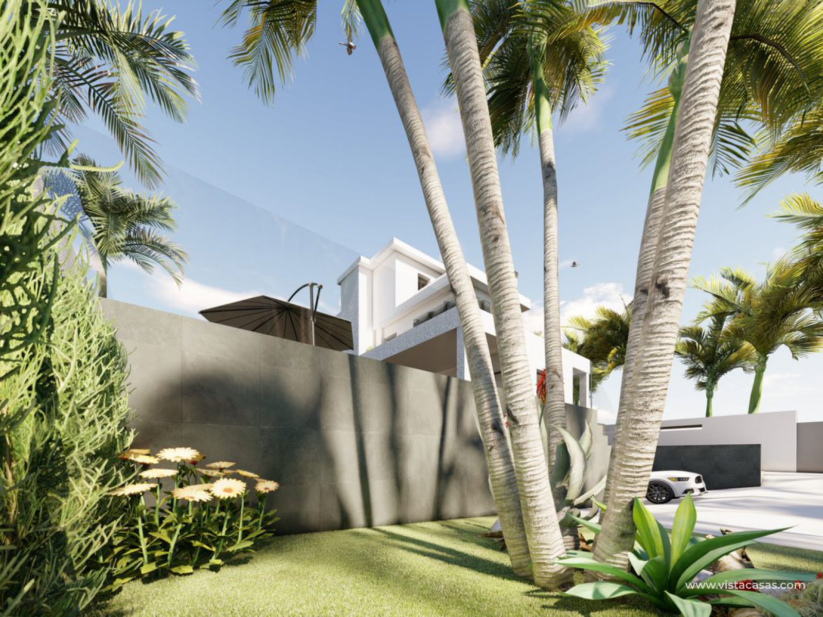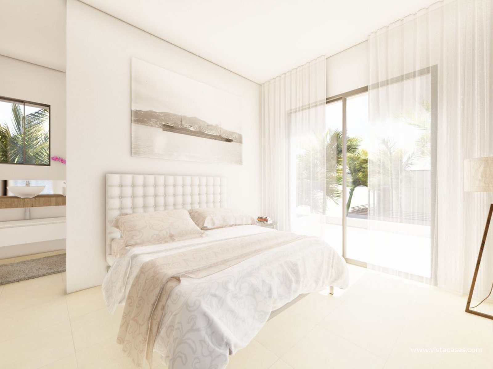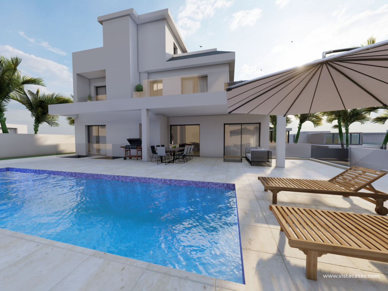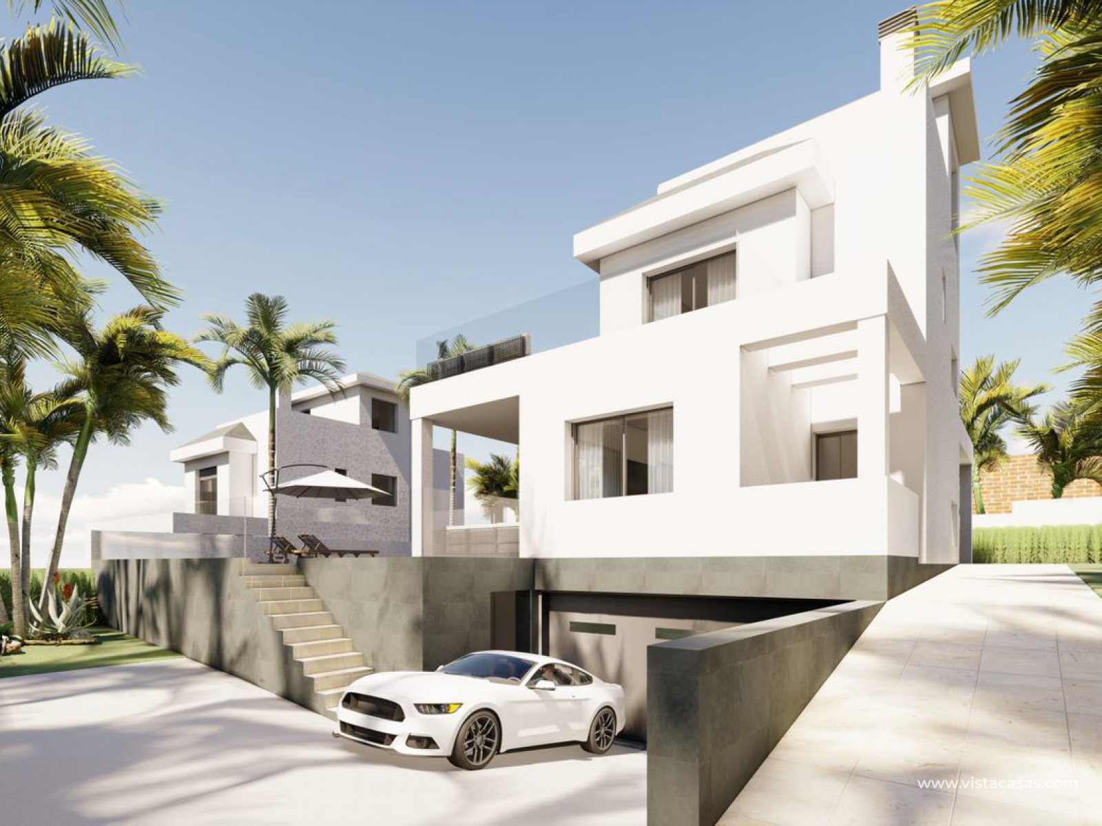 New build luxury villa located in Doña Pepa, Ciudad Quesada, on a private plot of 521m2 and with a build size of 294.70m2. The villa boasts a 10 x 3 metre private pool in the landscaped plot and is constructed over 3 levels. The basement level has a garage, a store room, a utility room and a bedroom + en suite bathroom. From the basement is a lift going up through the levels to the roof terrace. The ground floor has a spacious lounge and dining area, a fully fitted and equipped kitchen with high quality kitchen appliances included, a utility room and a bedroom with en suite bathroom and a guest bathroom. The first floor has 2 bedrooms both with en suite bathrooms. The roof level has ample terracing and also the lift entrance to take you down to whichever level you require. Also included in this beautifully styled villa are fully ducted hot and cold air conditioning, underfloor heating, Bosch kitchen appliances, landscaped gardens.