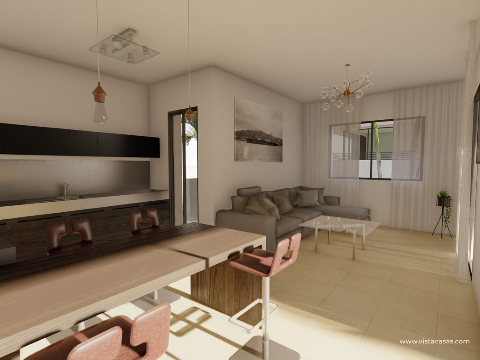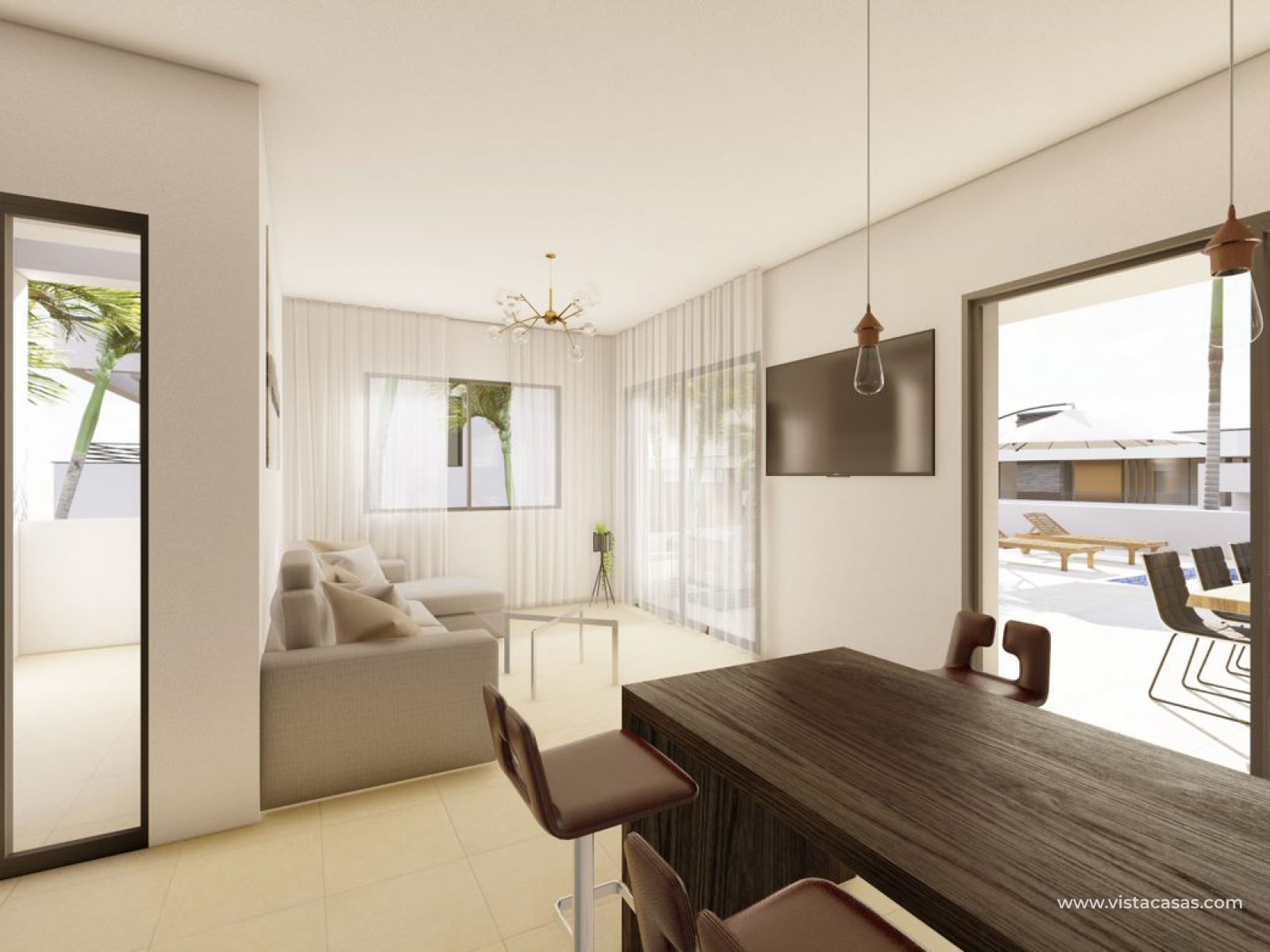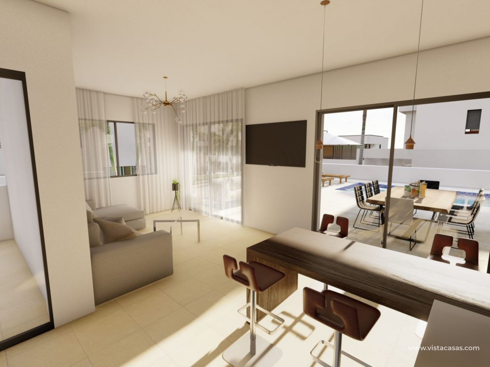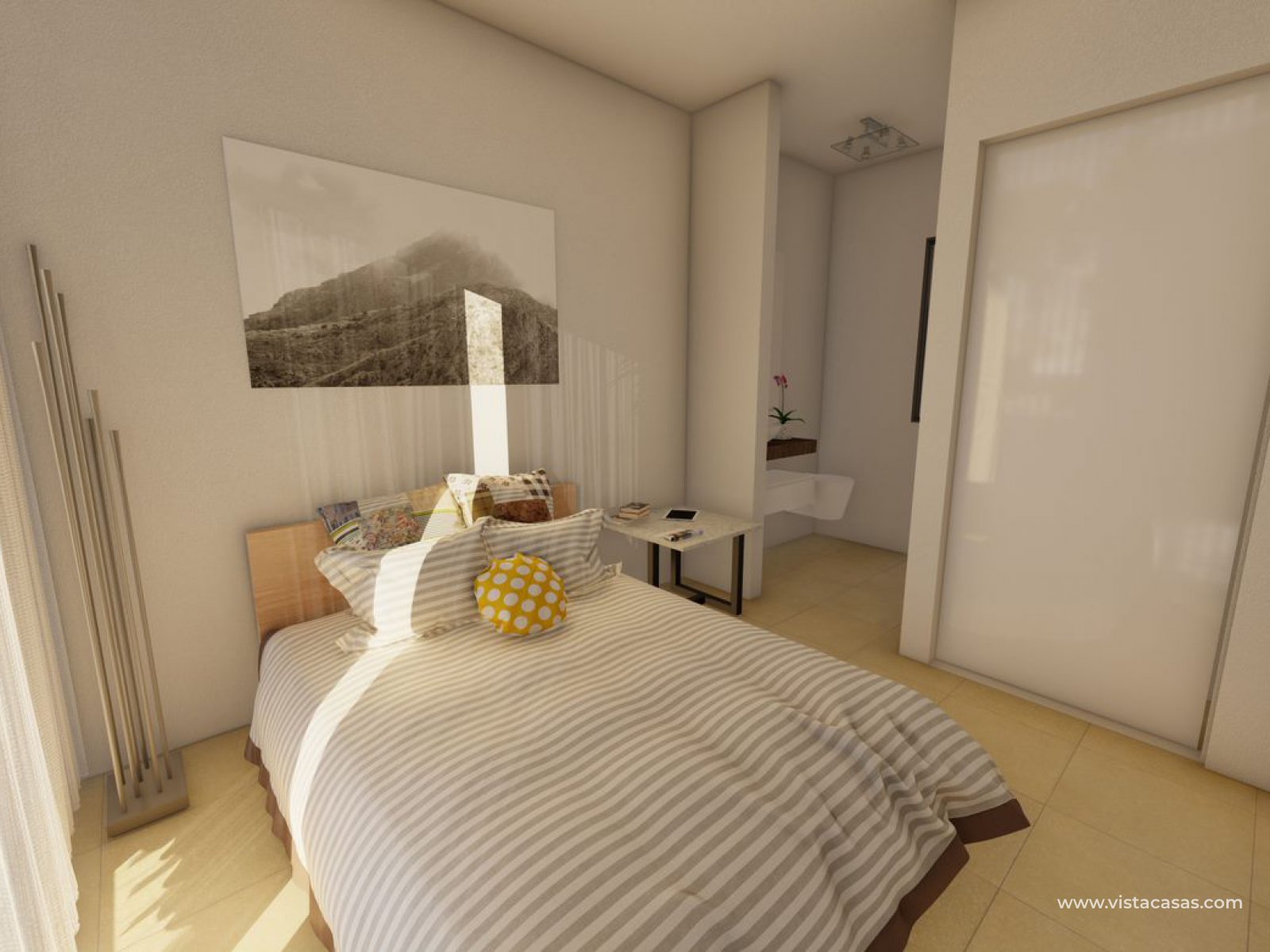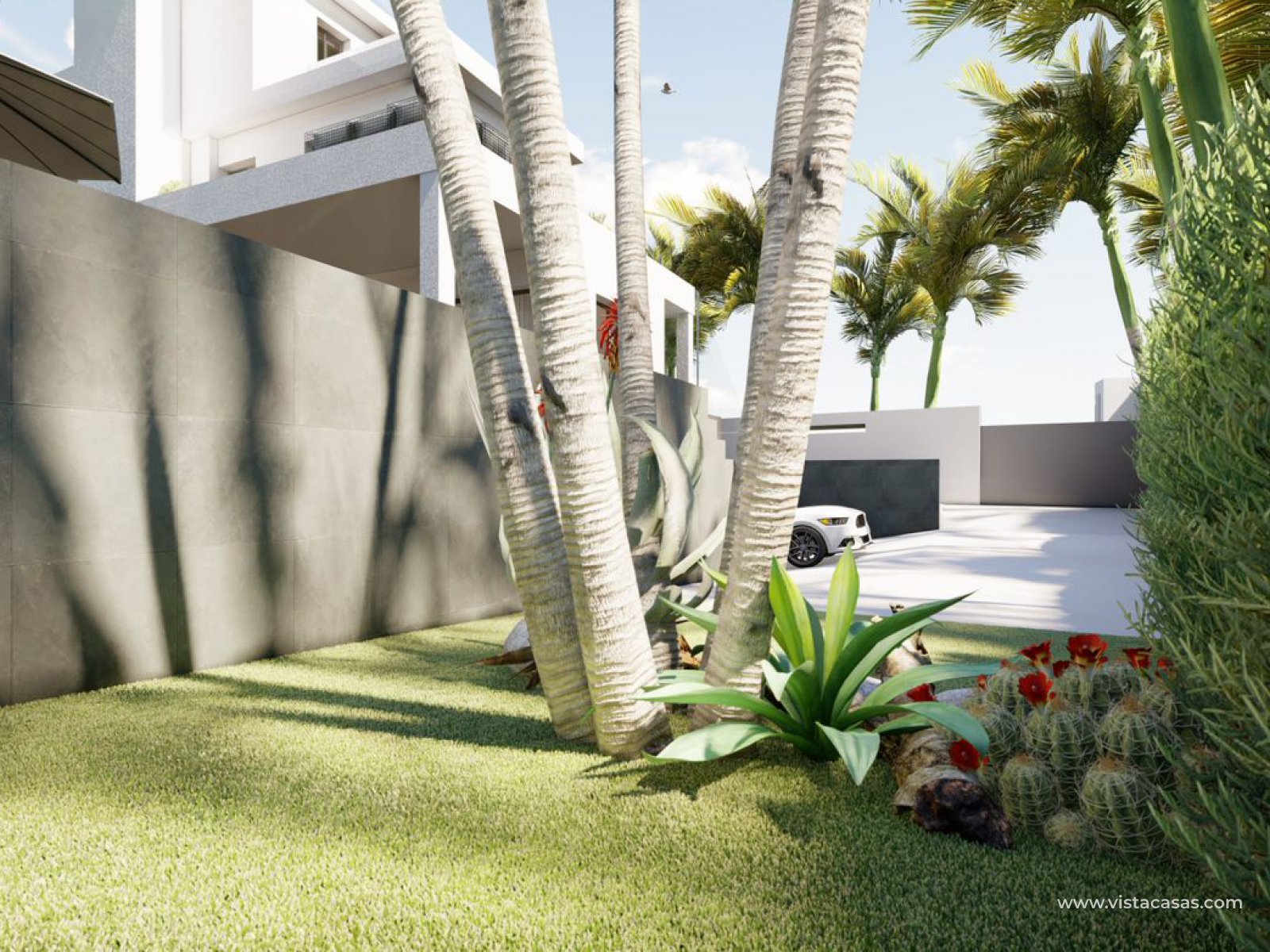 New build luxury villa located in Doña Pepa, Ciudad Quesada, on a private plot of 521m2 and with a build size of 294.70m2. The villa boasts a 10 x 3 metre private pool in the landscaped plot and is constructed over 3 levels. The basement level has a garage, a store room, a utility room and a bedroom + en suite bathroom. From the basement is a lift going up through the levels to the roof terrace. The ground floor has a spacious lounge and dining area, a fully fitted and equipped kitchen with high quality kitchen appliances included, a utility room and a bedroom with en suite bathroom and a guest bathroom. The first floor has 2 bedrooms both with en suite bathrooms. The roof level has ample terracing and also the lift entrance to take you down to whichever level you require. Also included in this beautifully styled villa are fully ducted hot and cold air conditioning, underfloor heating, Bosch kitchen appliances, landscaped gardens.
