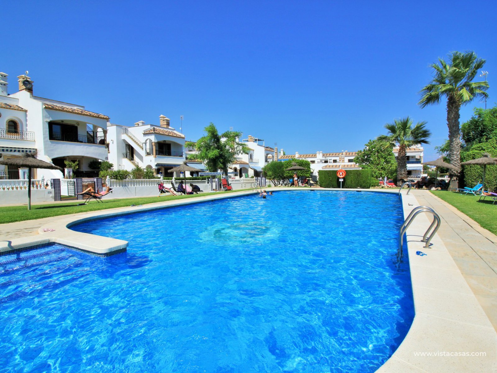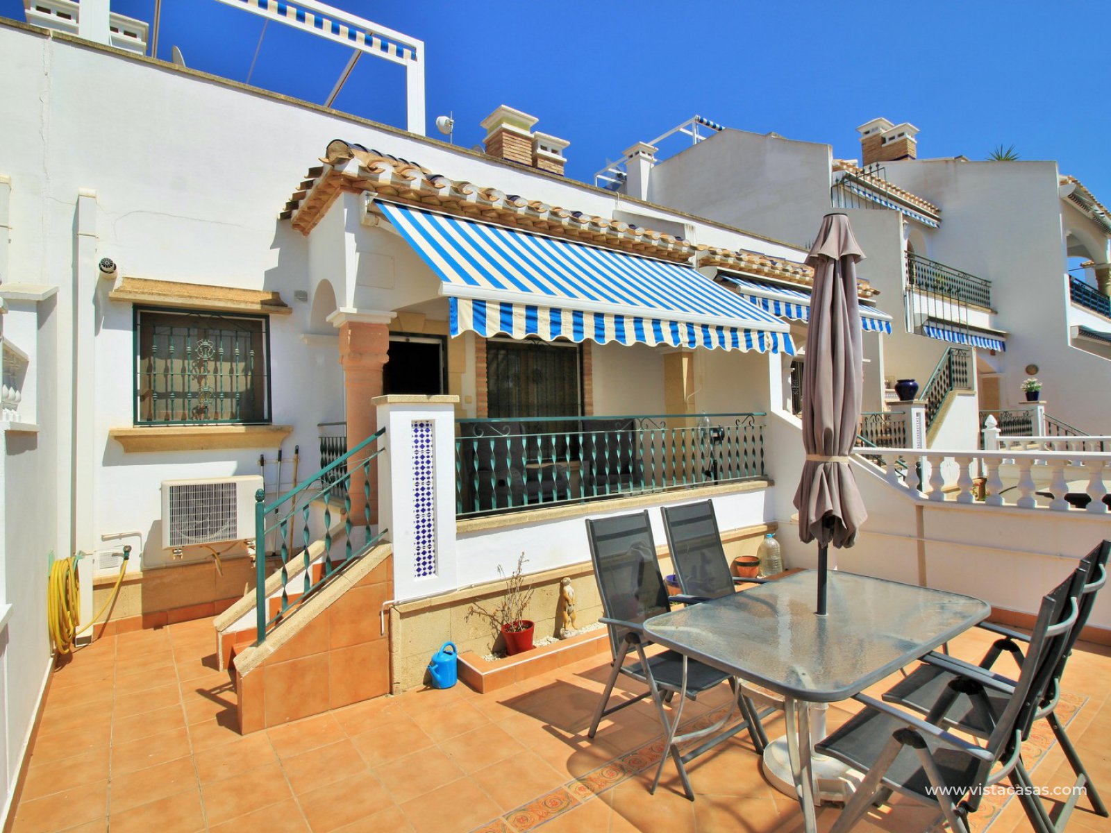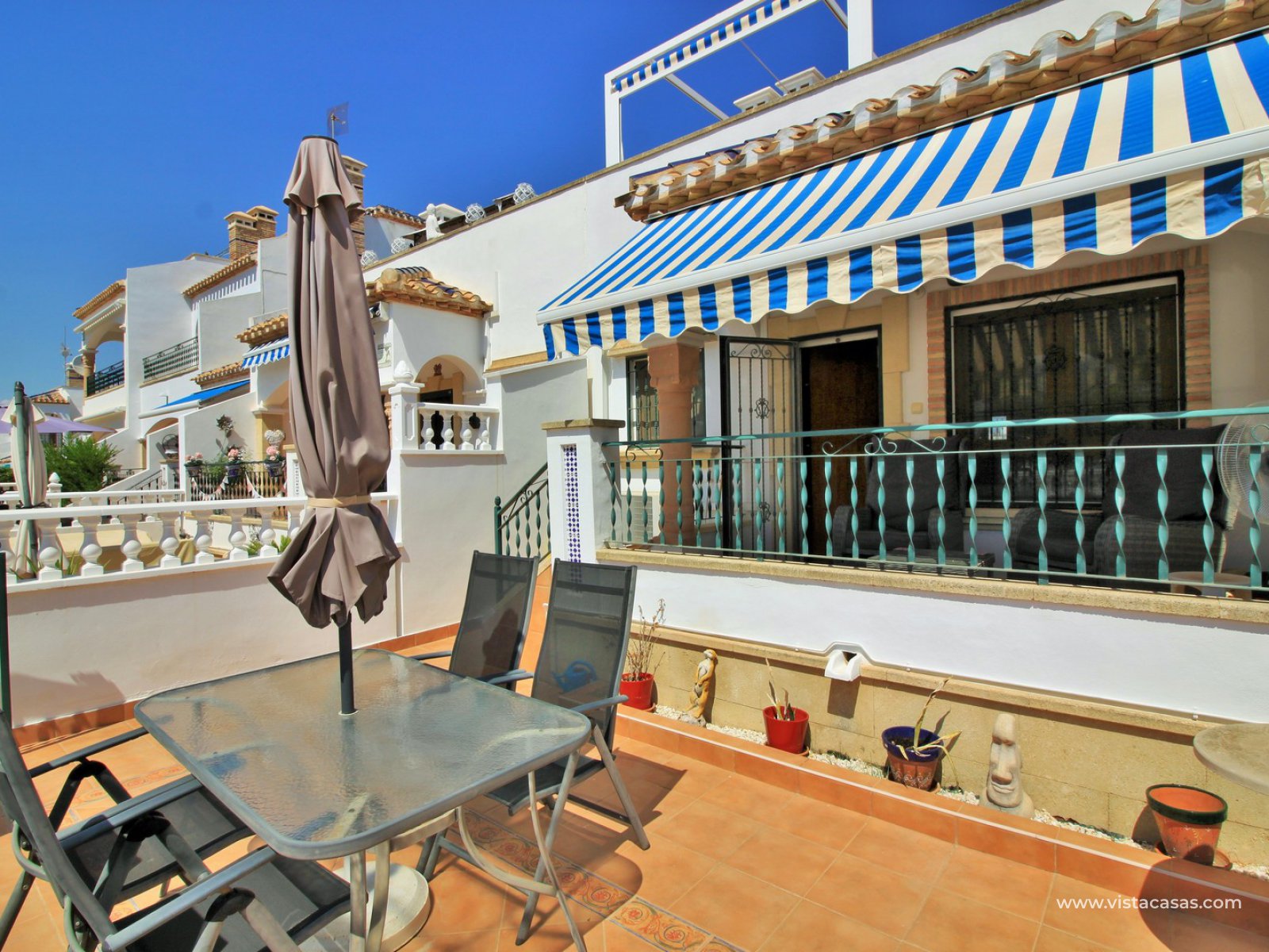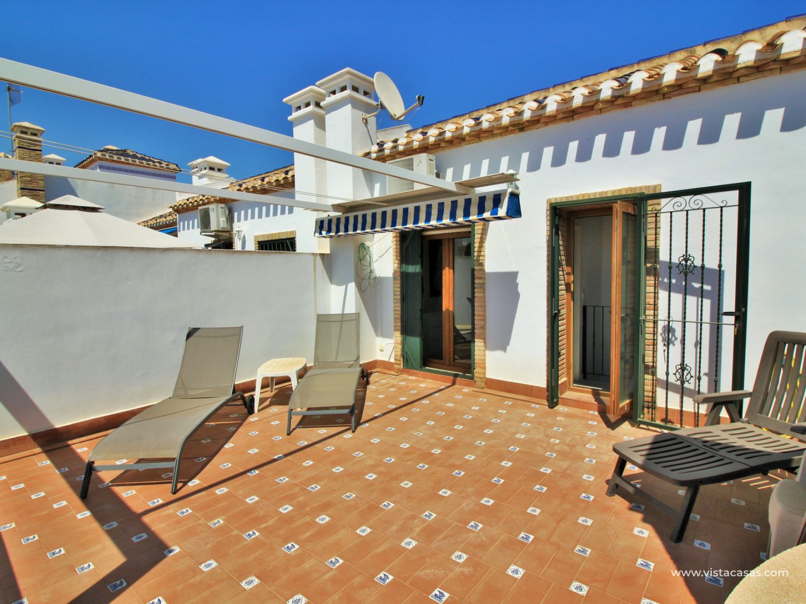 The ground floor comprises of a spacious lounge-dining area, a modern open kitchen with utility area, 2 bedrooms with fitted wardrobes and a family bathroom. Upstairs there is the large master bedroom with plenty of built-in storage and an en-suite shower room. There is a sunny roof solarium with views of the pool that is accessible from the master bedroom and the landing. To the front of the property is a tiled garden with awnings and a raised covered terrace with views of the pool and communal gardens. There is also a rear garden that is accessible from the downstairs double bedroom. Part of a gated community with use of a beautiful communal pool, green areas and communal parking. Sold furnished with air-conditioning.