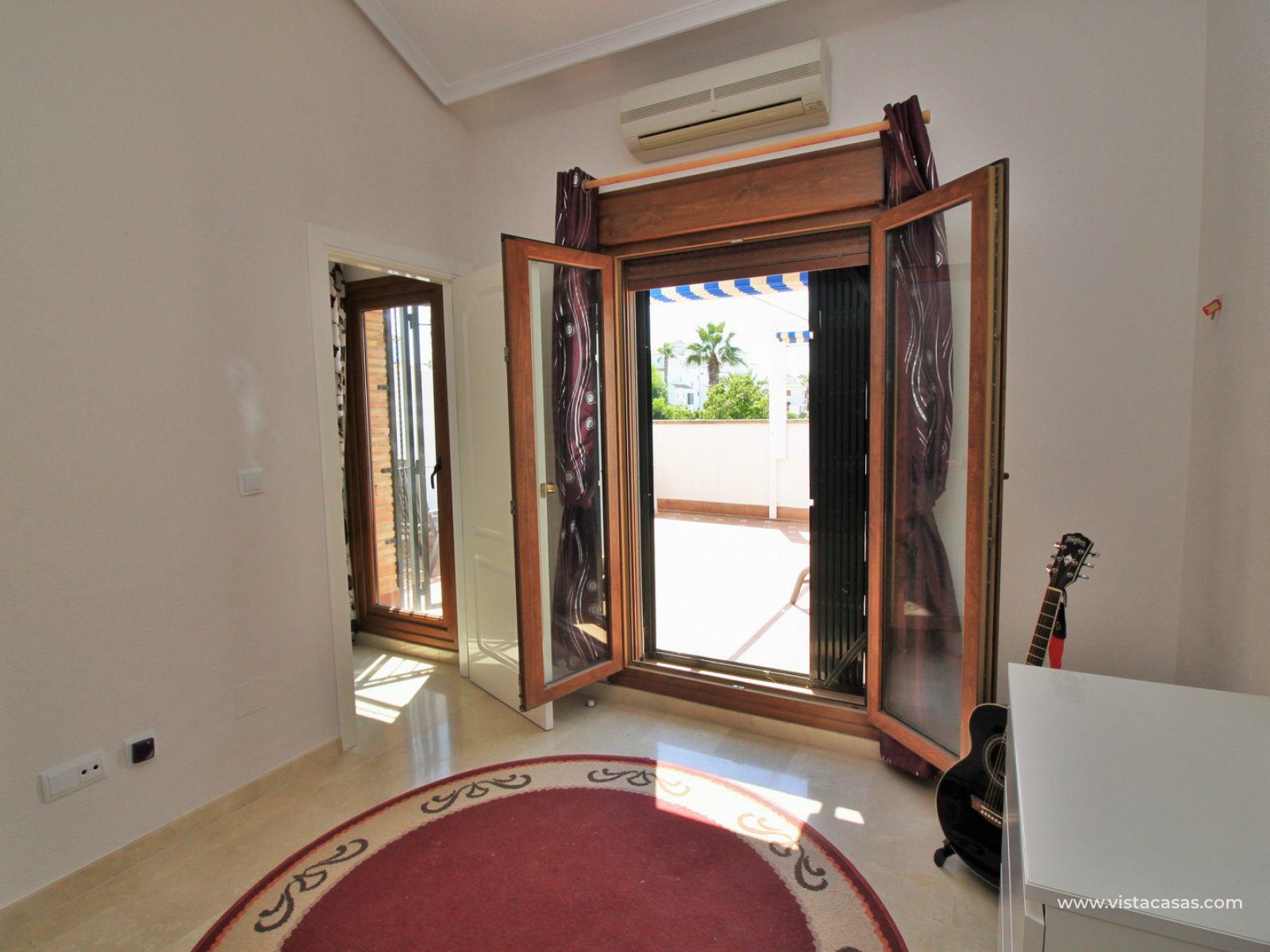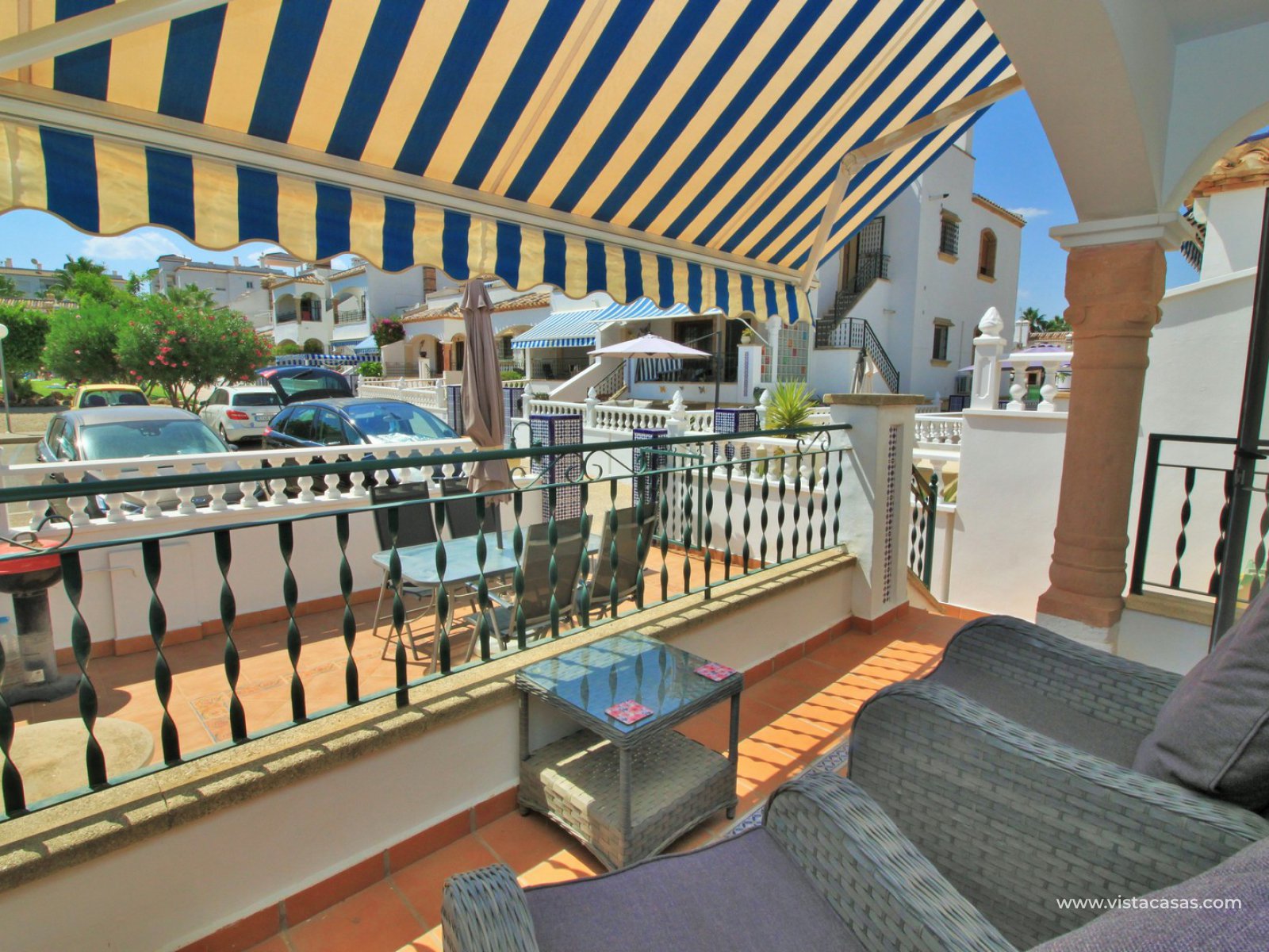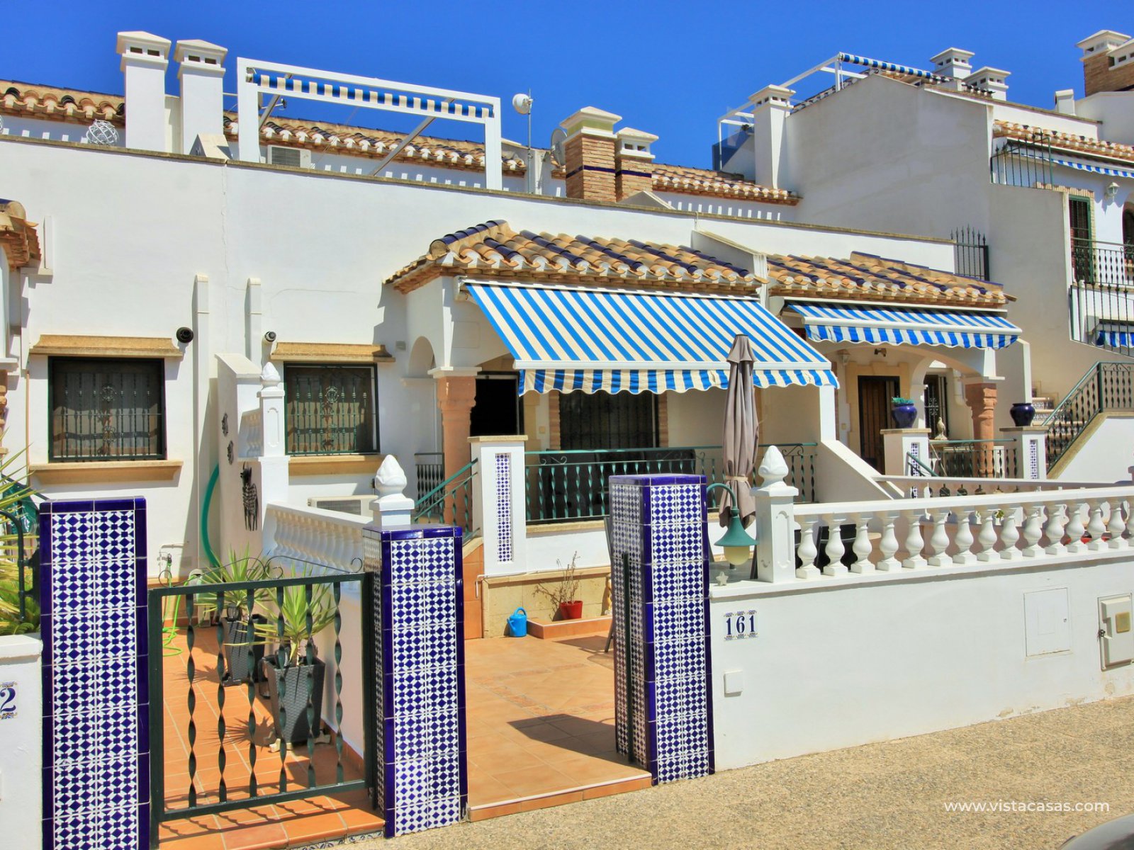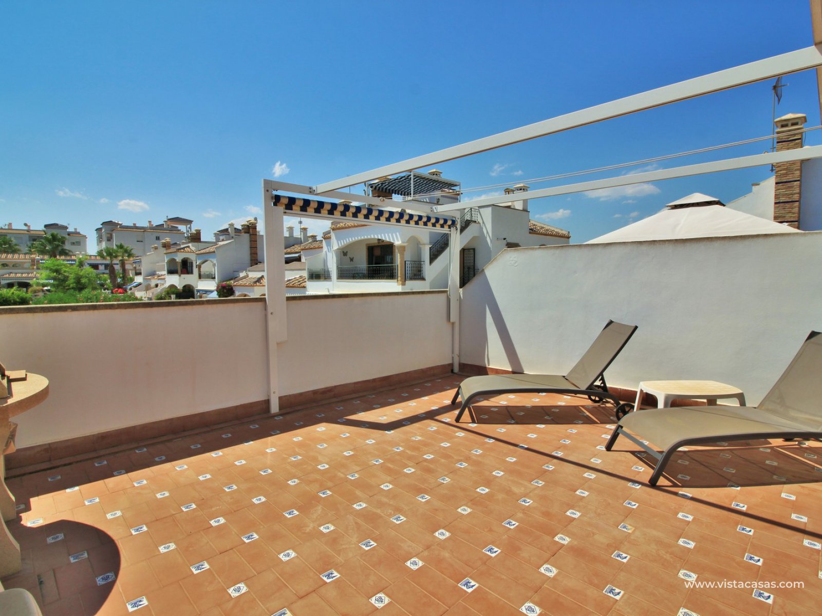The ground floor comprises of a spacious lounge-dining area, a modern open kitchen with utility area, 2 bedrooms with fitted wardrobes and a family bathroom. Upstairs there is the large master bedroom with plenty of built-in storage and an en-suite shower room. There is a sunny roof solarium with views of the pool that is accessible from the master bedroom and the landing. To the front of the property is a tiled garden with awnings and a raised covered terrace with views of the pool and communal gardens. There is also a rear garden that is accessible from the downstairs double bedroom. Part of a gated community with use of a beautiful communal pool, green areas and communal parking. Sold furnished with air-conditioning.
