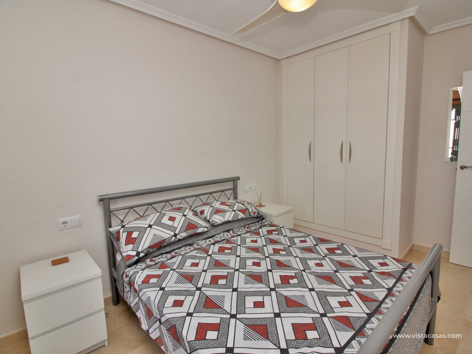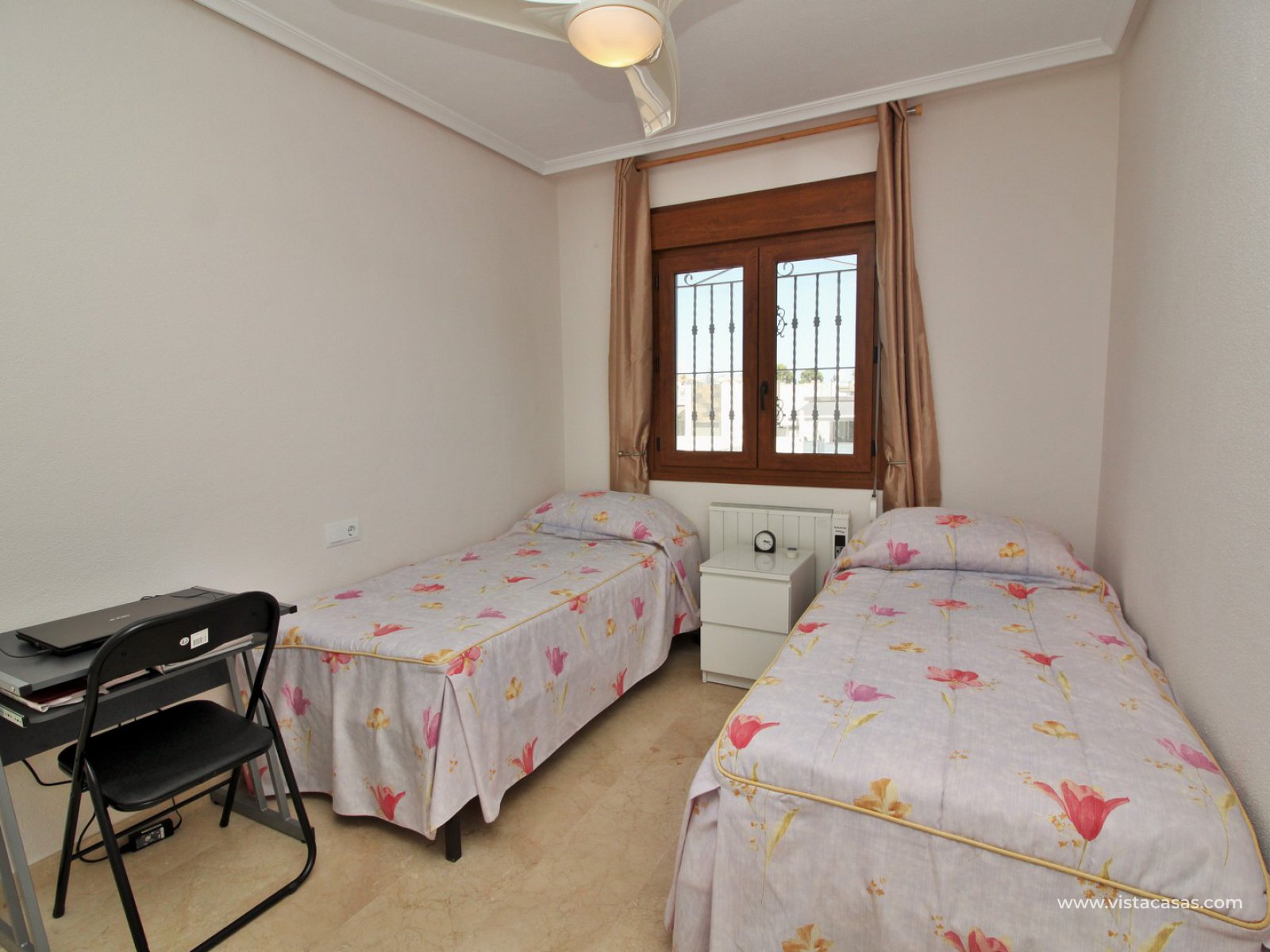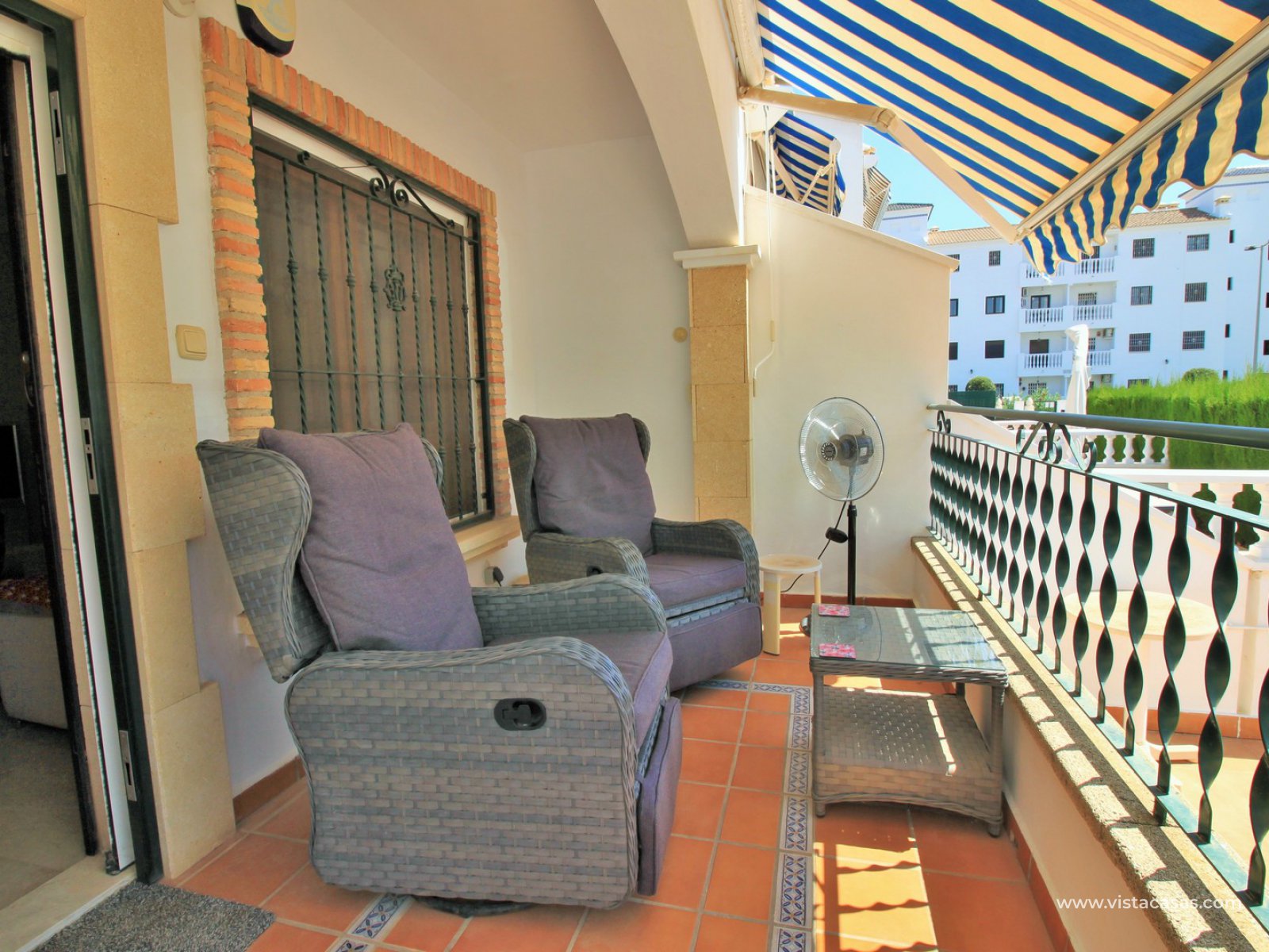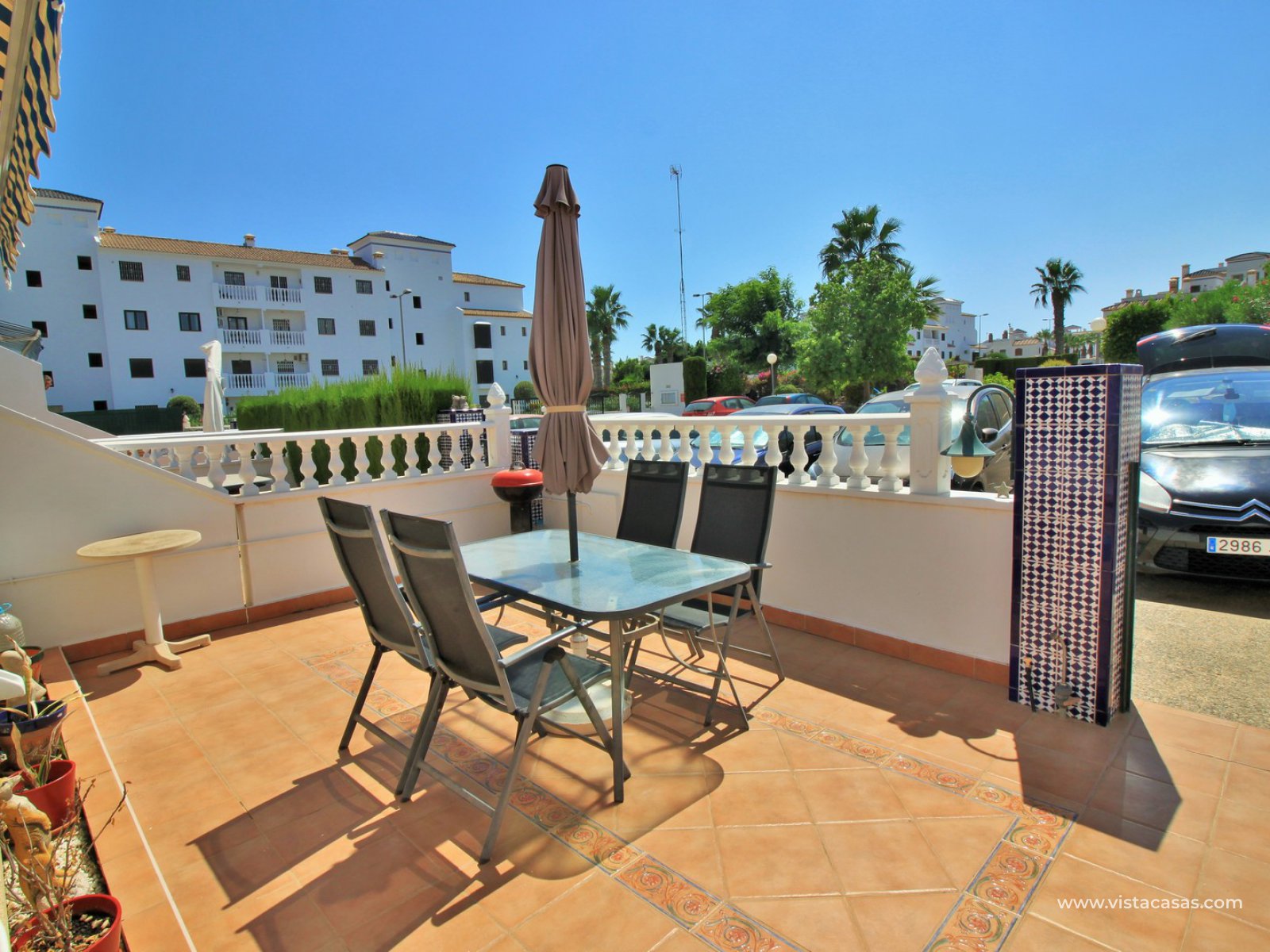 The ground floor comprises of a spacious lounge-dining area, a modern open kitchen with utility area, 2 bedrooms with fitted wardrobes and a family bathroom. Upstairs there is the large master bedroom with plenty of built-in storage and an en-suite shower room. There is a sunny roof solarium with views of the pool that is accessible from the master bedroom and the landing. To the front of the property is a tiled garden with awnings and a raised covered terrace with views of the pool and communal gardens. There is also a rear garden that is accessible from the downstairs double bedroom. Part of a gated community with use of a beautiful communal pool, green areas and communal parking. Sold furnished with air-conditioning.