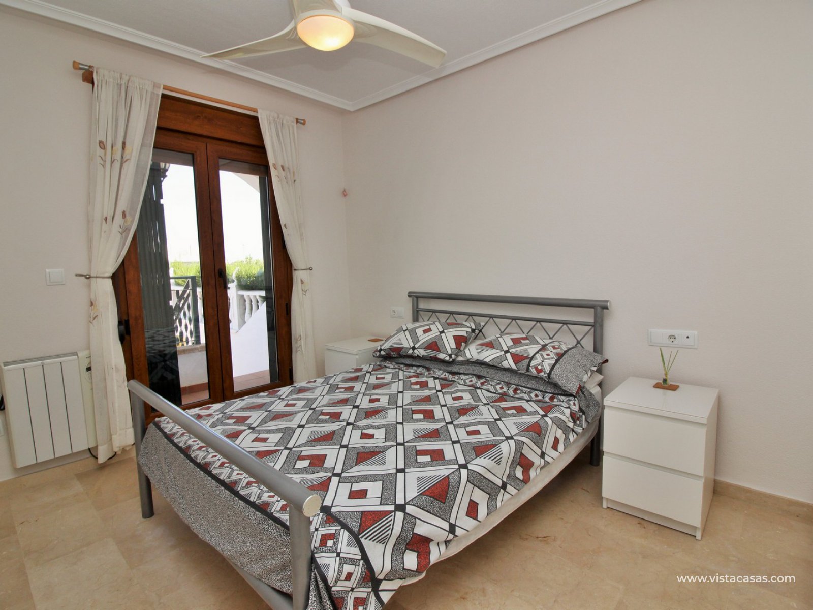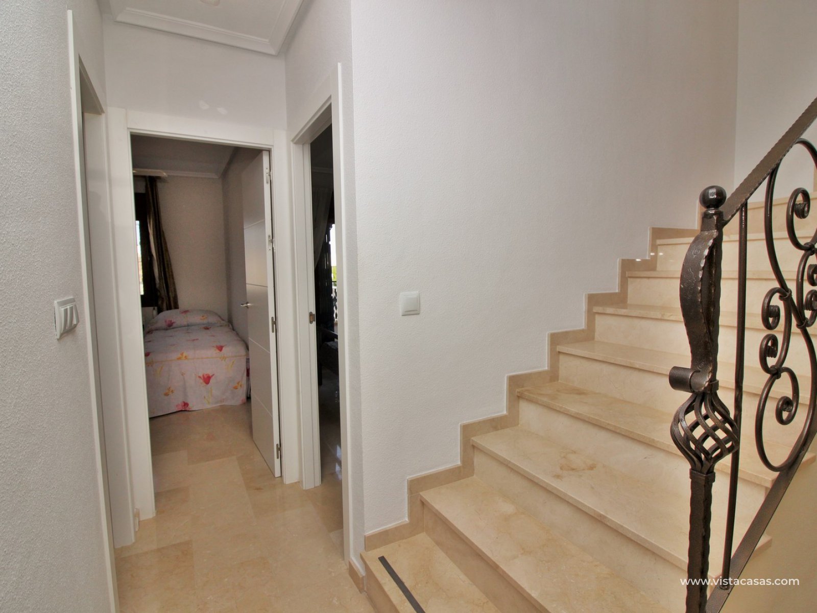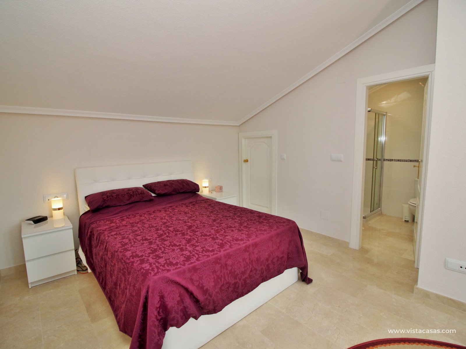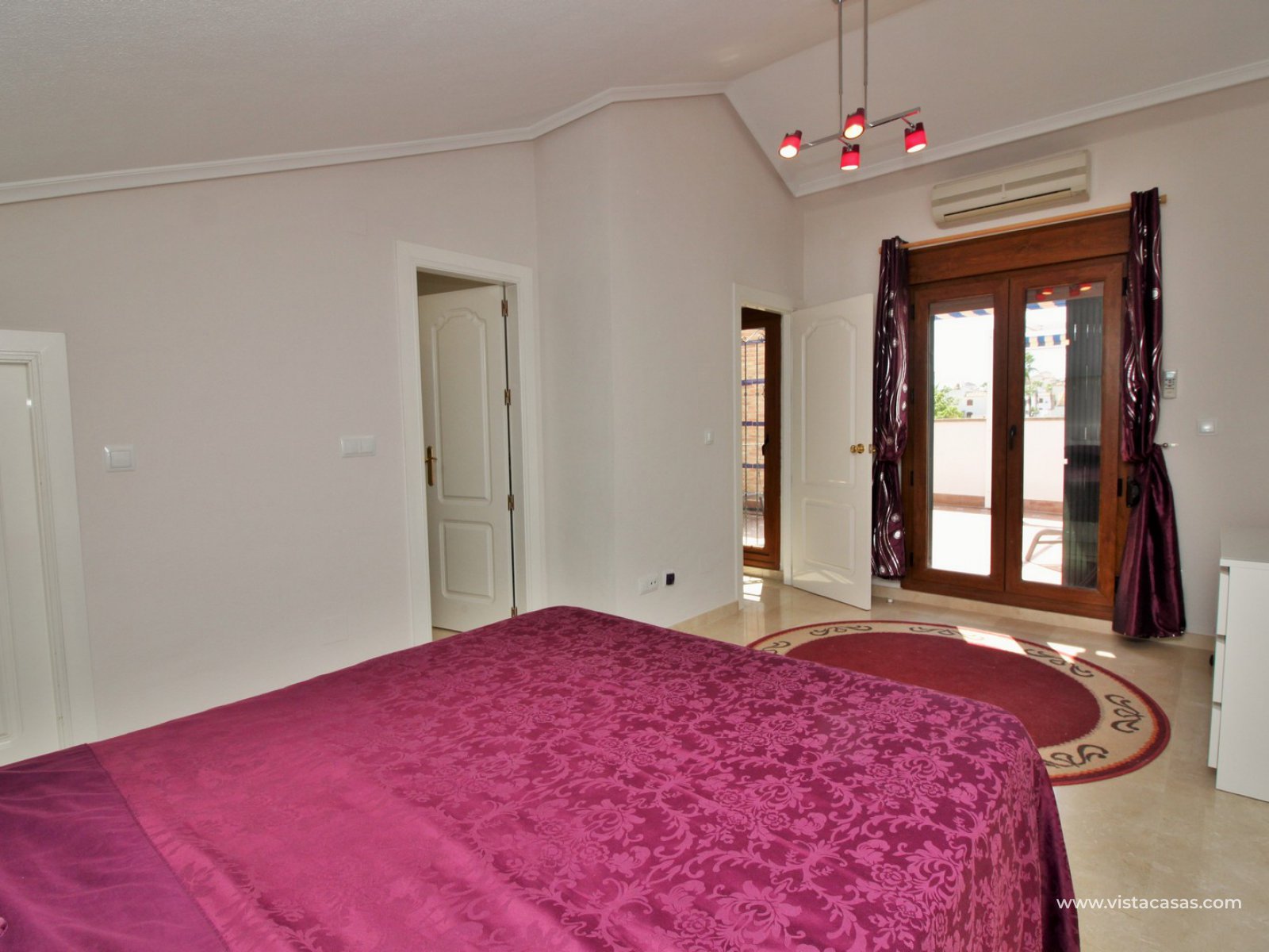The ground floor comprises of a spacious lounge-dining area, a modern open kitchen with utility area, 2 bedrooms with fitted wardrobes and a family bathroom. Upstairs there is the large master bedroom with plenty of built-in storage and an en-suite shower room. There is a sunny roof solarium with views of the pool that is accessible from the master bedroom and the landing. To the front of the property is a tiled garden with awnings and a raised covered terrace with views of the pool and communal gardens. There is also a rear garden that is accessible from the downstairs double bedroom. Part of a gated community with use of a beautiful communal pool, green areas and communal parking. Sold furnished with air-conditioning.