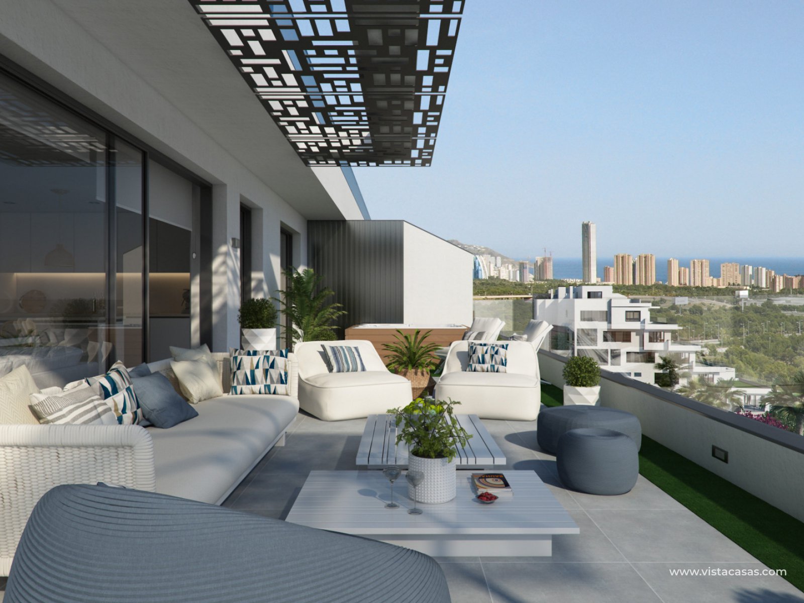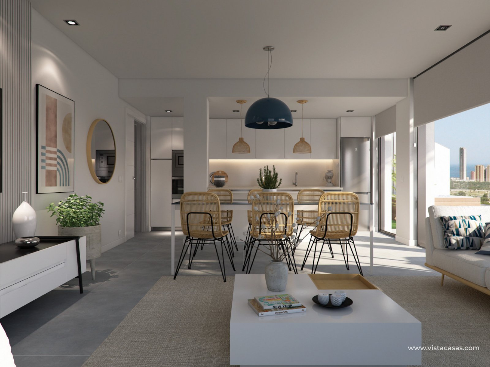 NEW RELEASE! Seascape Blue has been conceived as a private and exclusive space for the leisure of a small community of owners with stunning views of the Benidorm skyline and sea, where you will be able to calmly enjoy numerous activities, sports and entertainment in peace. In the centre, there is an impressive community pool and Jacuzzi, a refreshing children’s paddling pool and a multisport court. The common areas of Seascape Blue are completed with a paddle tennis court, playground, bio-fitness exercise area, dog gym, garden areas for walking, gyms, recreation areas, coworking rooms and indoor swimming pool. The homes have been equipped with large terraces overlooking the Mediterranean and large windows that connect the outdoor and indoor areas, resulting in very spacious rooms with plenty of natural light. The terrace features a modern lattice that filters rays of sun. With choices of 2,3 and 4 bedroom apartments with terrace, parking and storage room included. There are also 2 exclusive villas available with 4 bedrooms, and 3 bathrooms available at 650.000€. These homes have 3 bedrooms and 2 bathrooms, a kitchen equipped with appliances and integrated into the living room, a large garden, a private pool, 2 parking spaces and a basement with natural light and independent access.