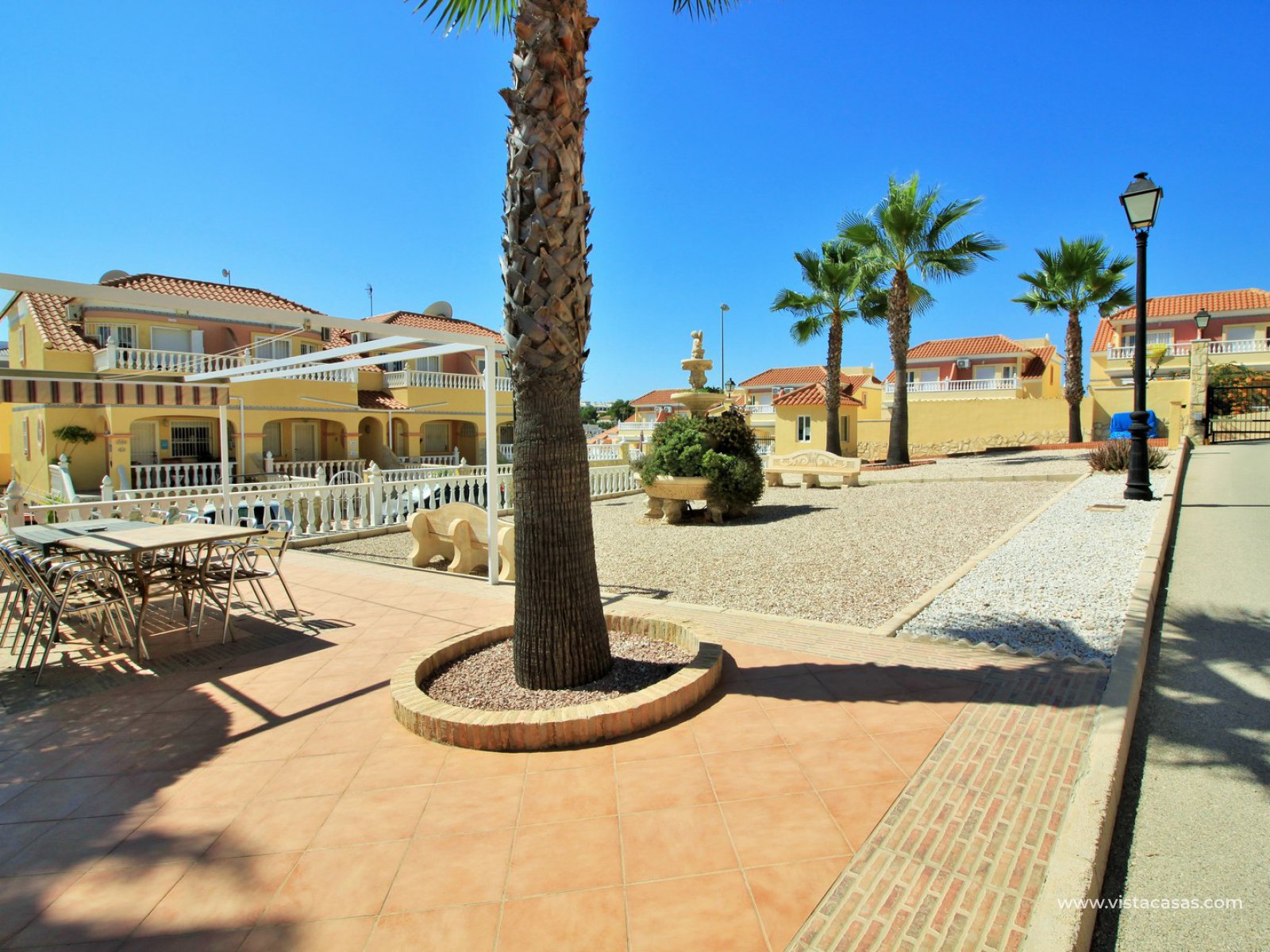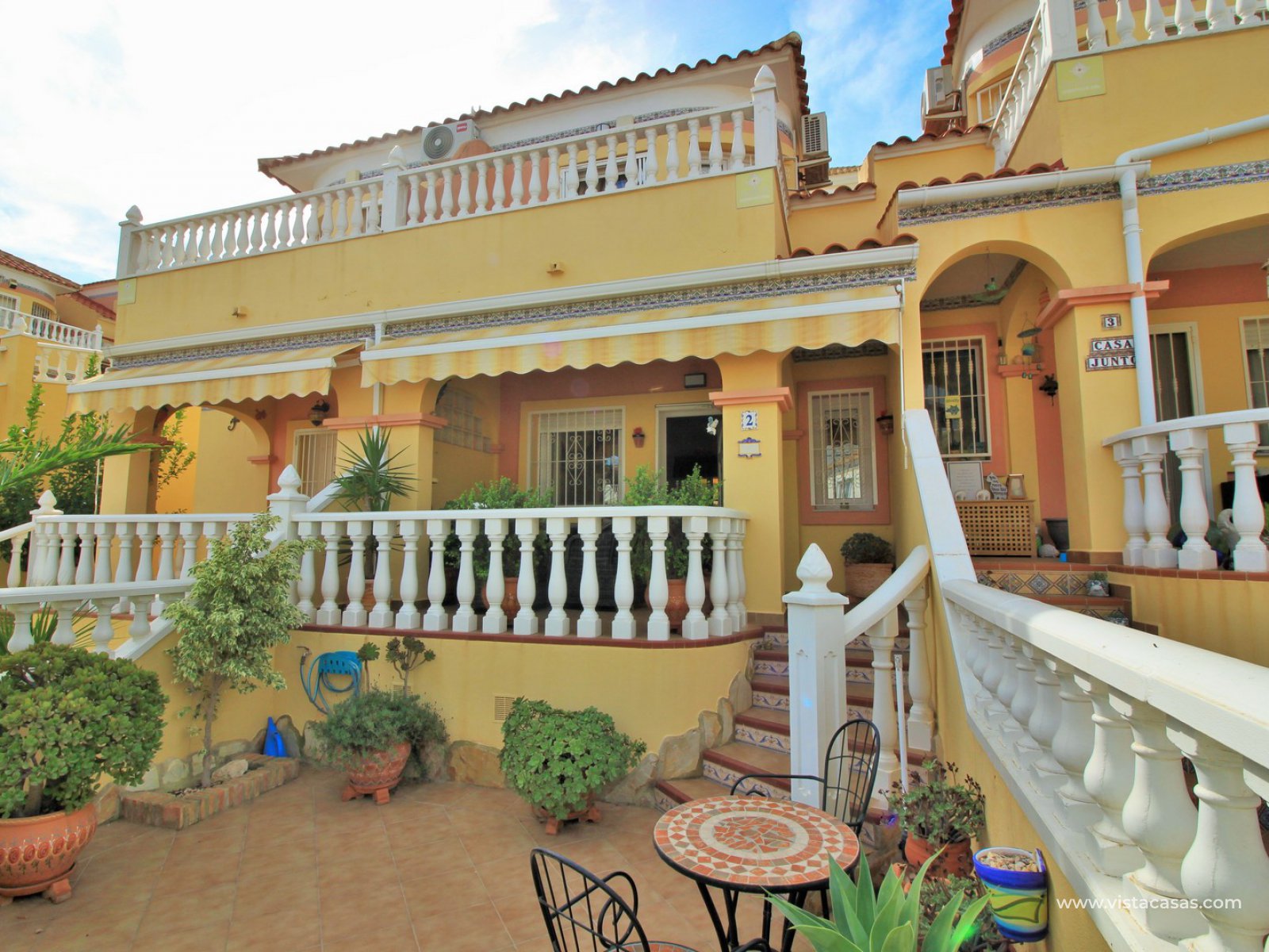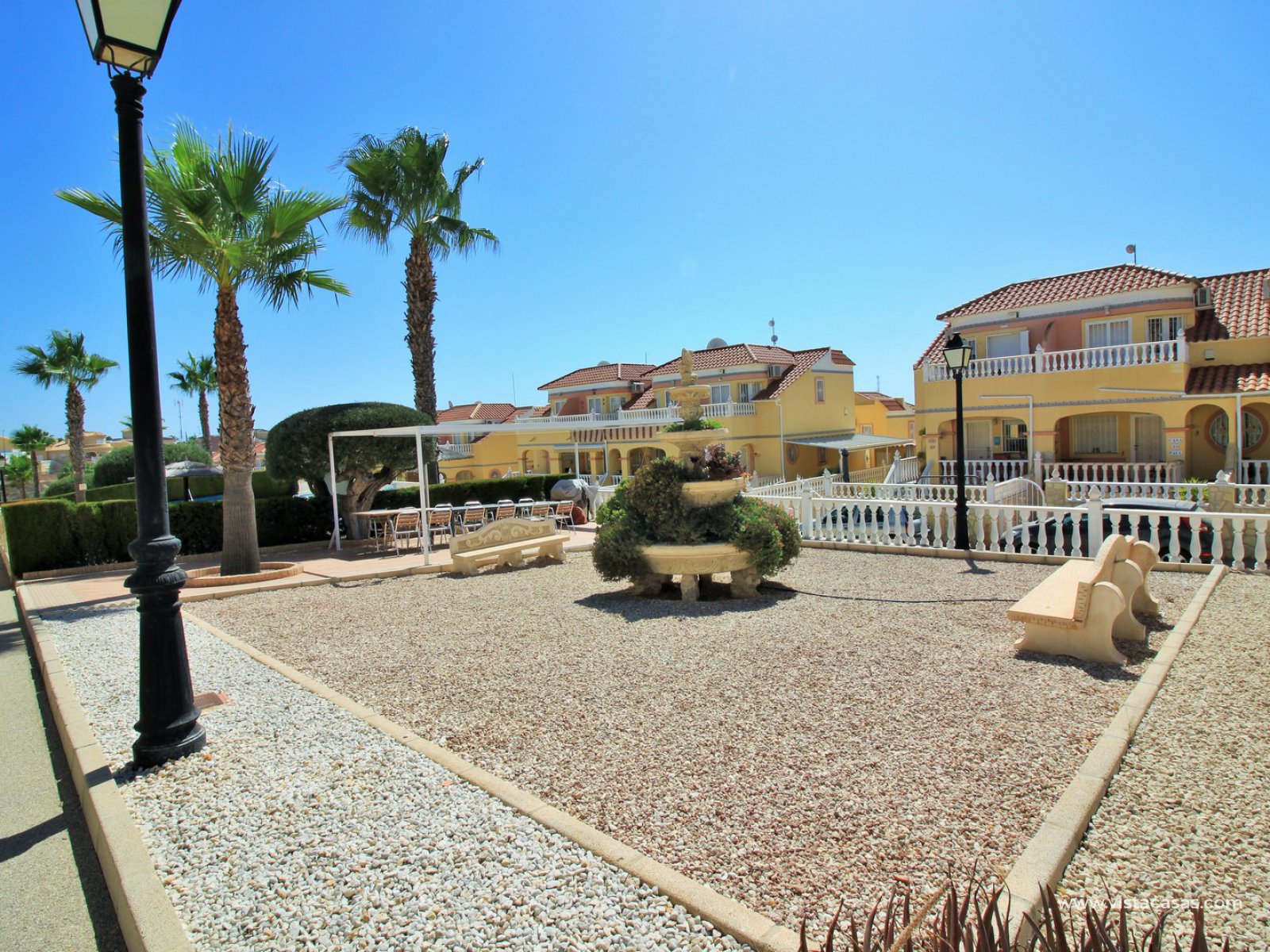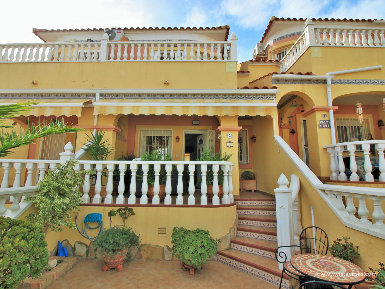 Comprising of a front garden with a covered porch area, a bright and airy lounge-dining area with American kitchen, cloakroom, and a rear patio with an awning and a utility area. Upstairs there are 2 bedrooms with fitted wardrobes with the master bedroom benefitting from a private balcony. There is also a newly renovated upstairs bathroom. The community offers lovely communal garden areas and the use of 4 communal pools.