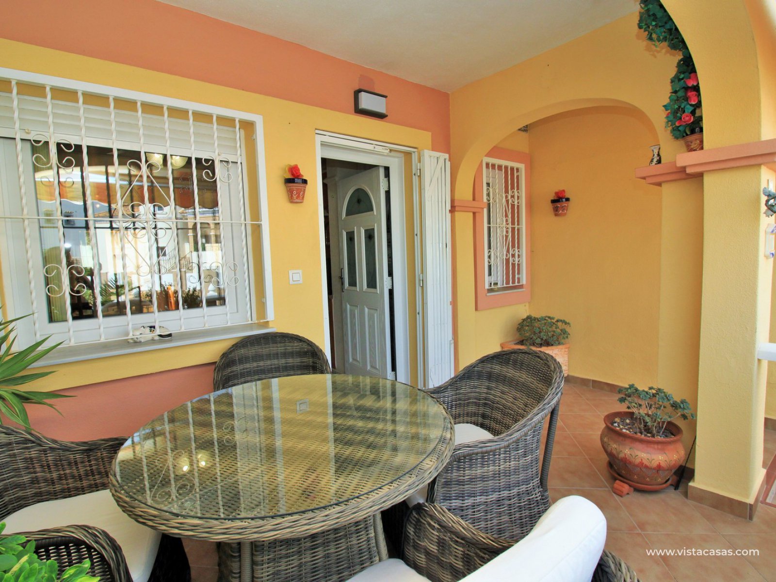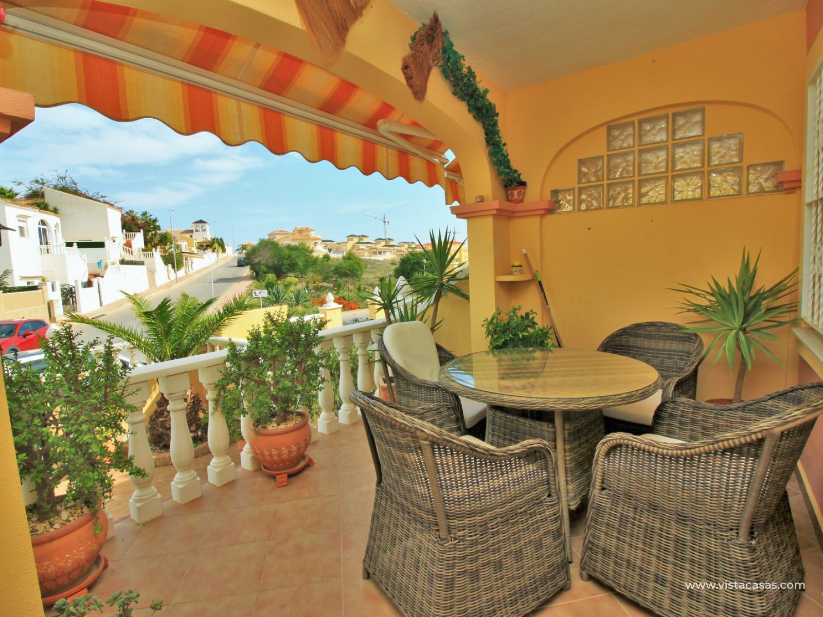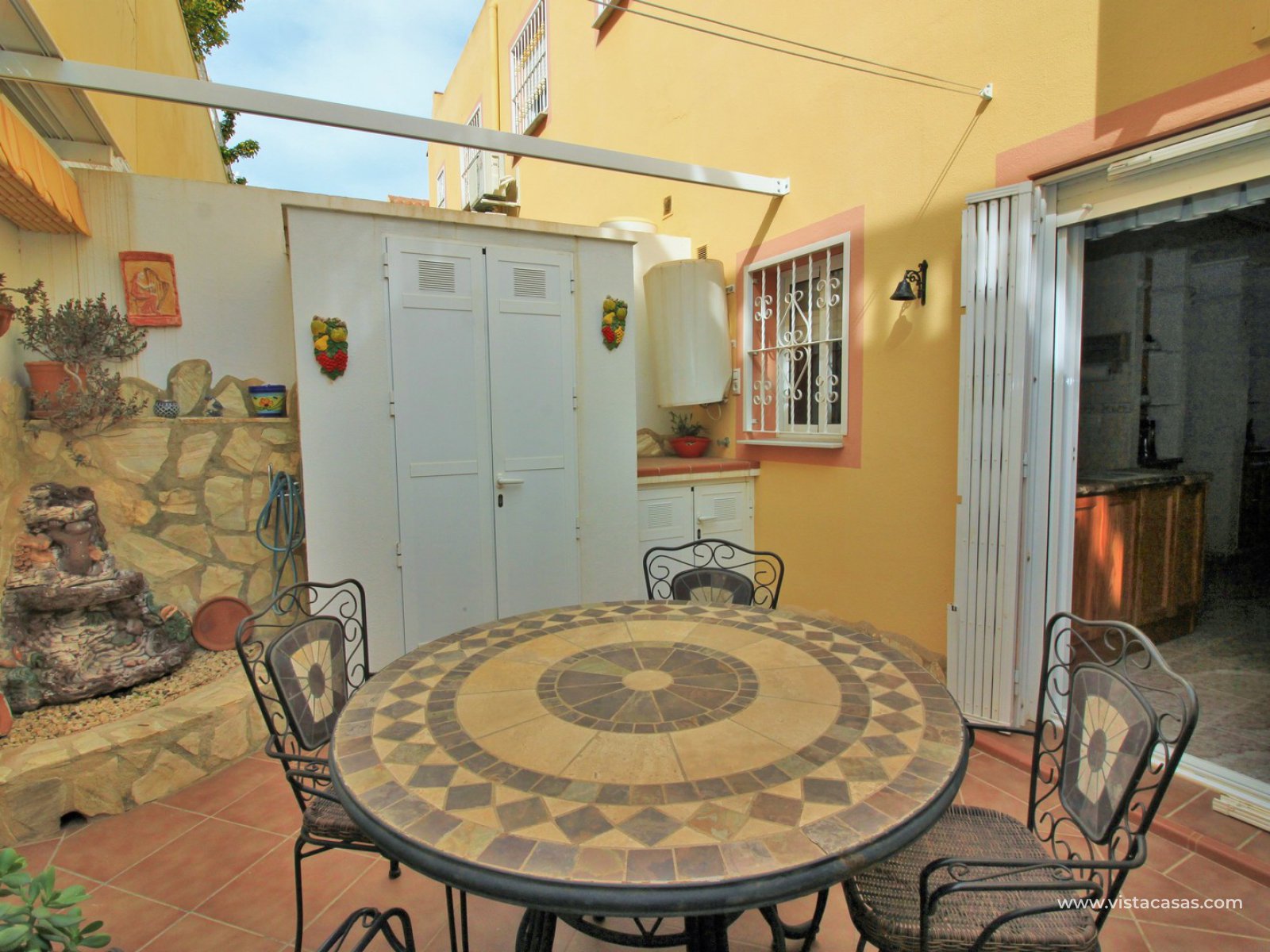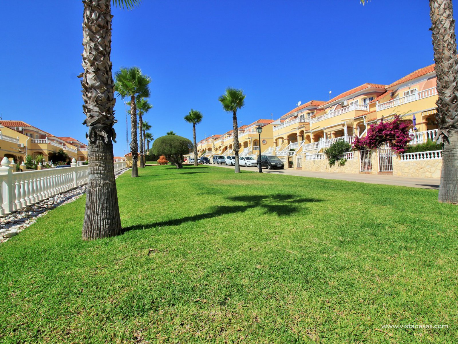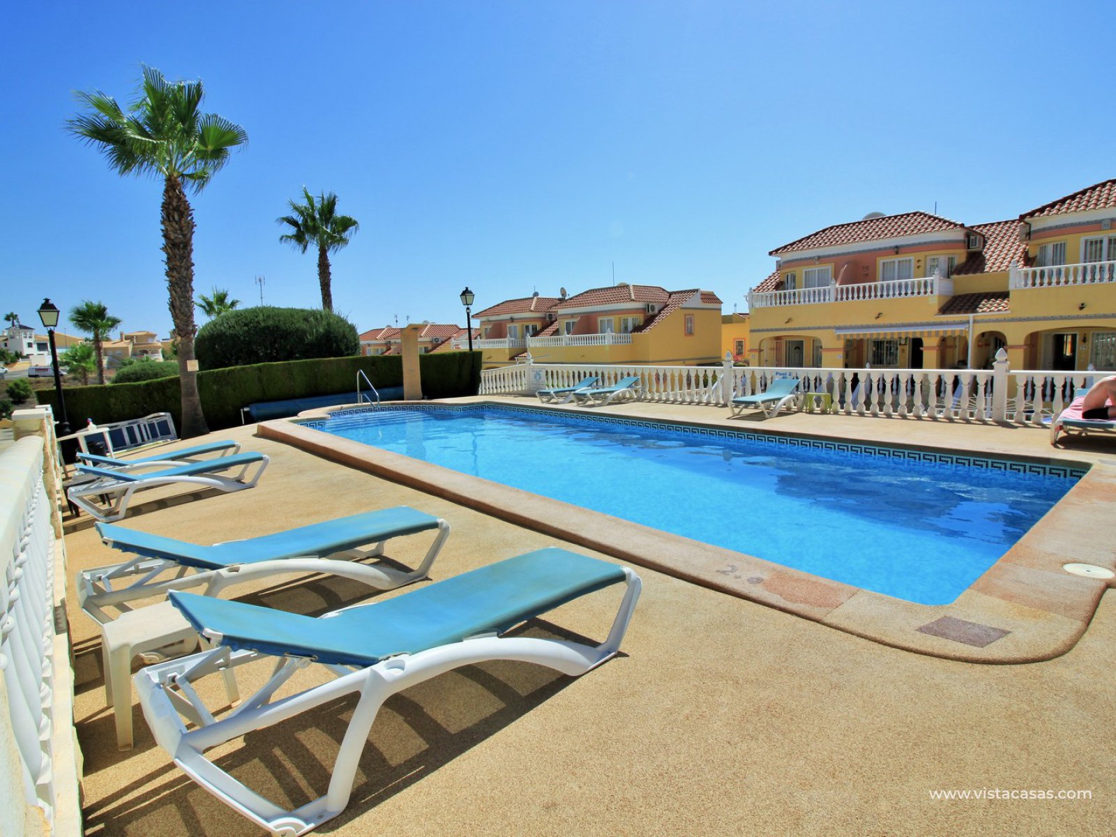 Comprising of a front garden with a covered porch area, a bright and airy lounge-dining area with American kitchen, cloakroom, and a rear patio with an awning and a utility area. Upstairs there are 2 bedrooms with fitted wardrobes with the master bedroom benefitting from a private balcony. There is also a newly renovated upstairs bathroom. The community offers lovely communal garden areas and the use of 4 communal pools.