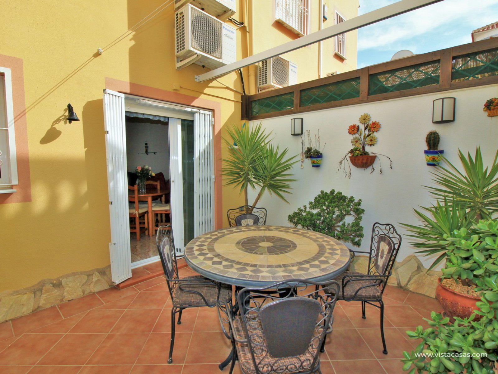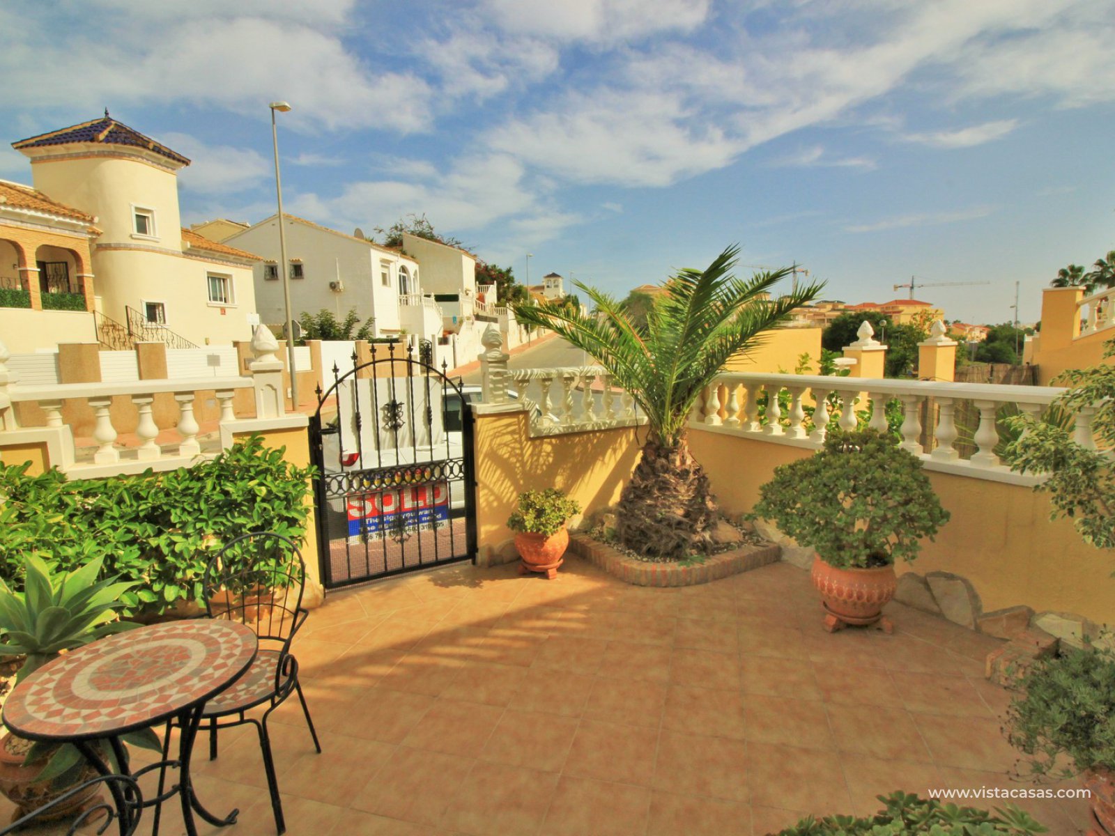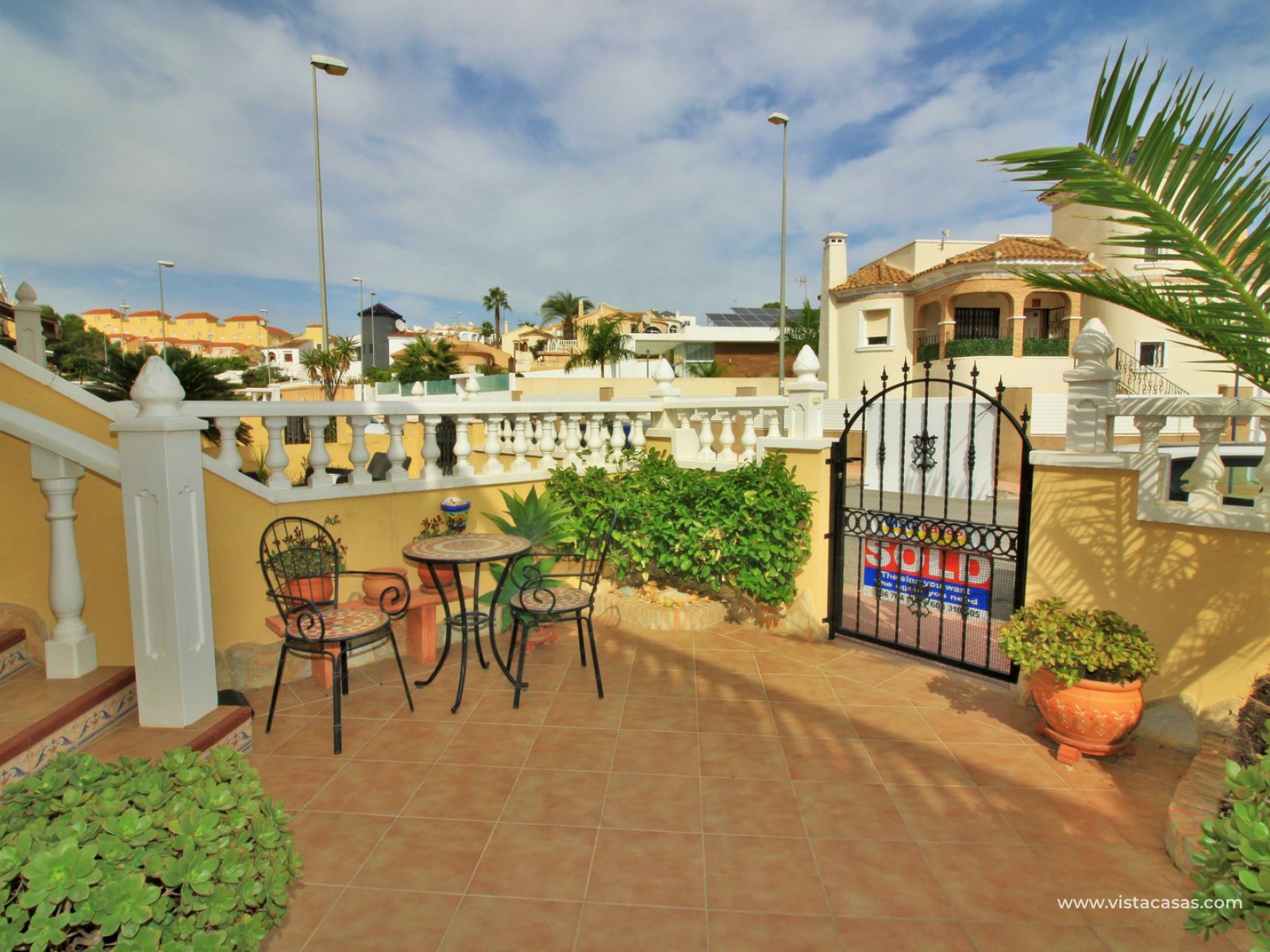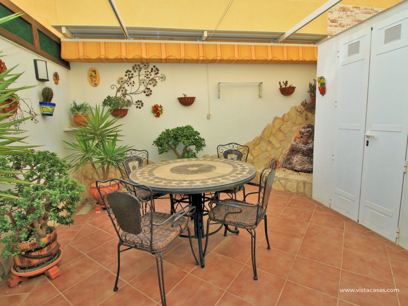 Comprising of a front garden with a covered porch area, a bright and airy lounge-dining area with American kitchen, cloakroom, and a rear patio with an awning and a utility area. Upstairs there are 2 bedrooms with fitted wardrobes with the master bedroom benefitting from a private balcony. There is also a newly renovated upstairs bathroom. The community offers lovely communal garden areas and the use of 4 communal pools.