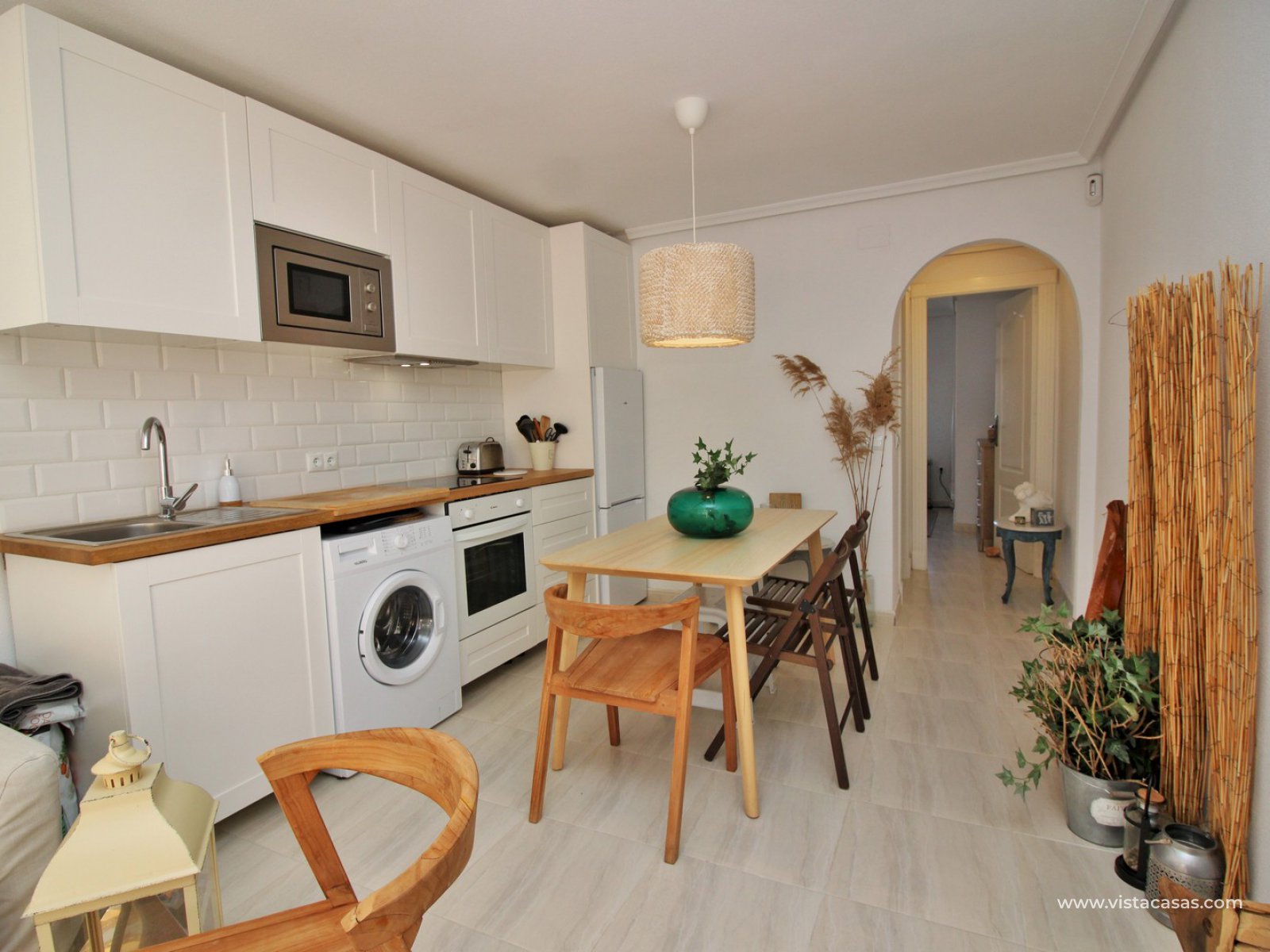 The living accommodation comprises of an open plan lounge-dining and kitchen area, which has been renovated to a modern design, 1 double bedroom to the rear with fitted wardrobes, and a fully fitted bathroom. To the front of the property is a cosy tiled terrace, a peaceful place to relax and enjoy the sunshine. Located down a small private road, with no passing traffic, the property offers a great setting to unwind and relax, while at the same time being close to all the amenities you need. There is also an option of adding an external staircase to make a roof solarium, if the new owner desired, which would offer stunning views towards the Torrevieja salt lakes. This bungalow is to impress, and we highly recommend viewings on this very welcoming property! There is no communal pool, so the yearly community fees are very low. However, there is a new pool bar with a large swimming pool, just a 3 minutes walk away!
