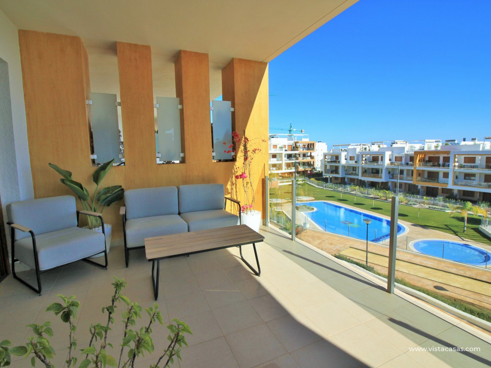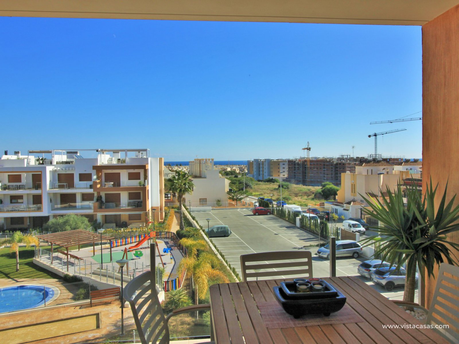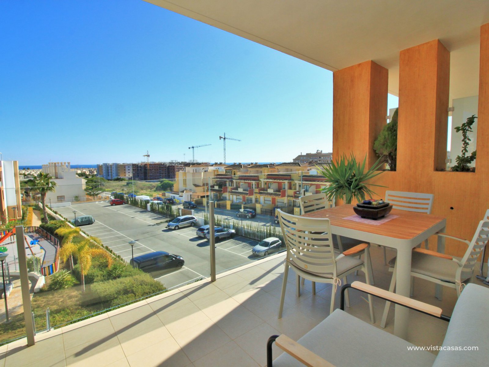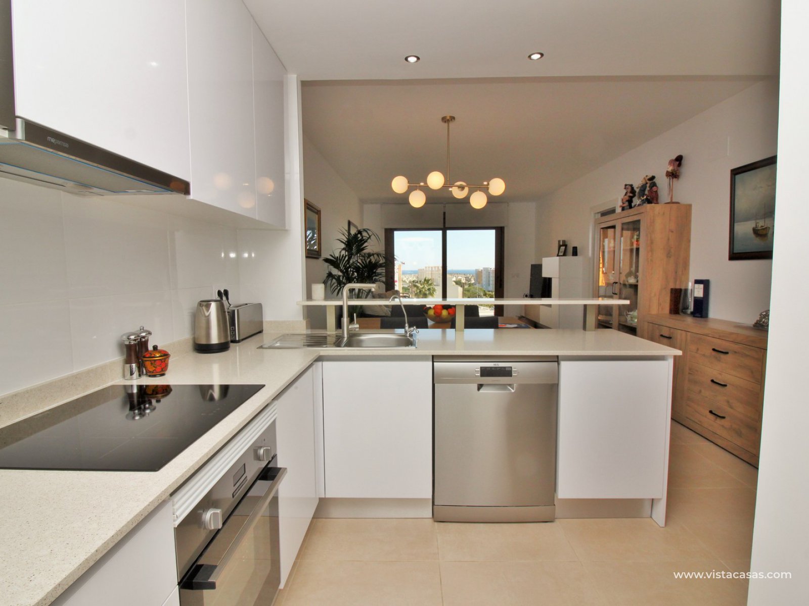 360 TOUR AVAILABLE! An immaculate resale 2 bedroom, 2 bathroom apartment with tourist licence overlooking the pool for sale in Residencial Gala in Los Dolses, Orihuela Costa. The complex was built in late 2019, and offers great facilities including a large swimming pool, children's pool and playground, Jacuzzis, and lift access to all floors, which is all situated within a secure gated community. The apartment is South-East facing offering beautiful views of the pool, sea, and communal gardens from its large covered balcony. The apartment is sold part-furnished, white goods, and ducted air-conditioning throughout, plus underfloor heating in both bathrooms. This is an absolute must see property, which is in as new condition, a perfect turn key solution if you are looking for a newly built apartment, without the wait!