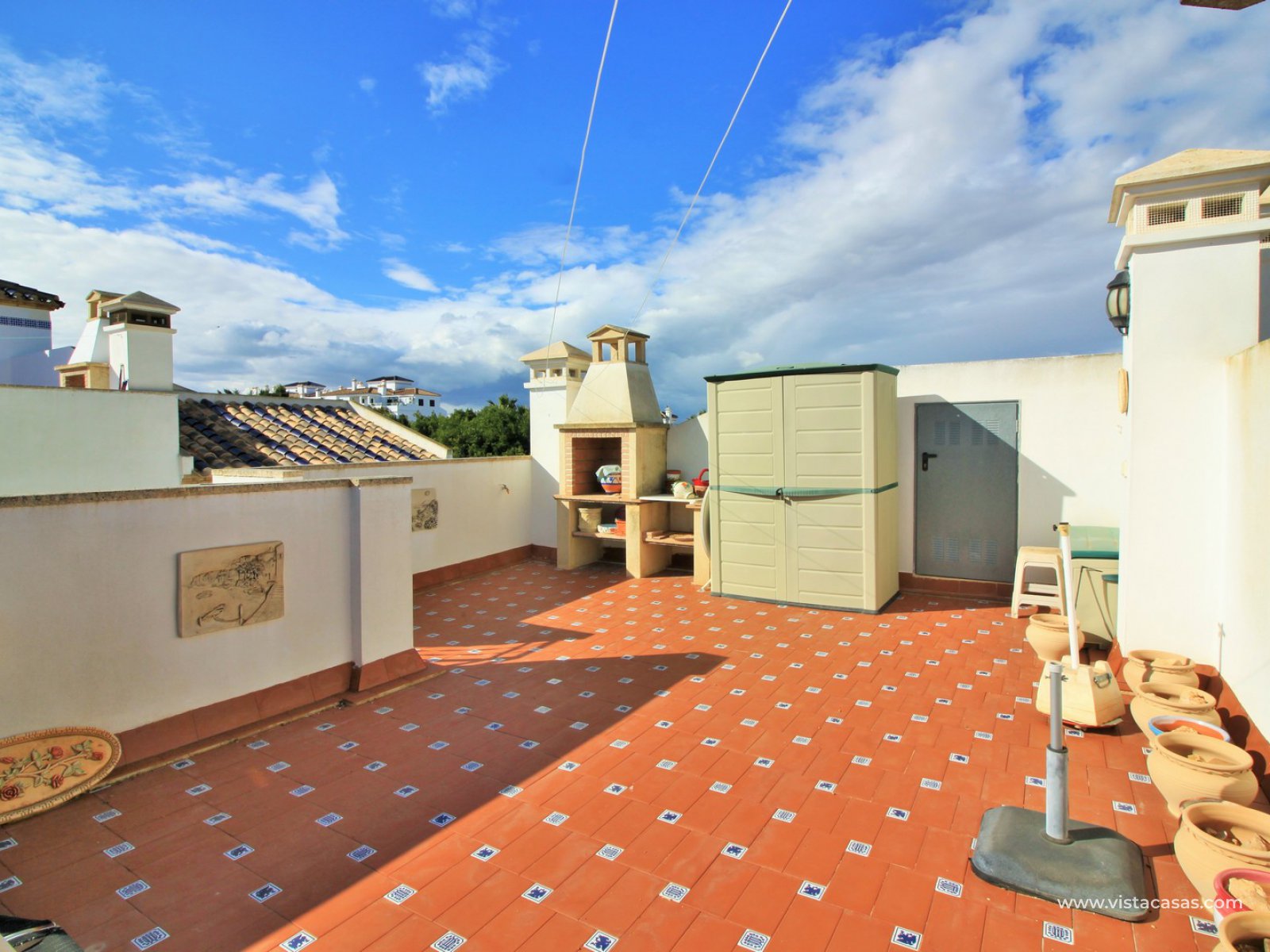 The living accommodation comprises of a spacious lounge-dining area with a feature fireplace, 1 guest bedroom with fitted wardrobes, a family bathroom, master bedroom with en-suite bathroom and Juliet balcony, plus a good-size kitchen with a utility area. Leading off the lounge you have a wonderful balcony with sun awnings offering lovely views. An external staircase leads up to the rooftop solarium. The solarium also features a brick-built BBQ – perfect for sun-bathing and outdoor dining alike. Another great feature of this property comes in the form of a private garden at ground level with storage shed. Given its size and proximity to 4 major golf courses, this splendid apartment would provide the perfect holiday home under the sun!
