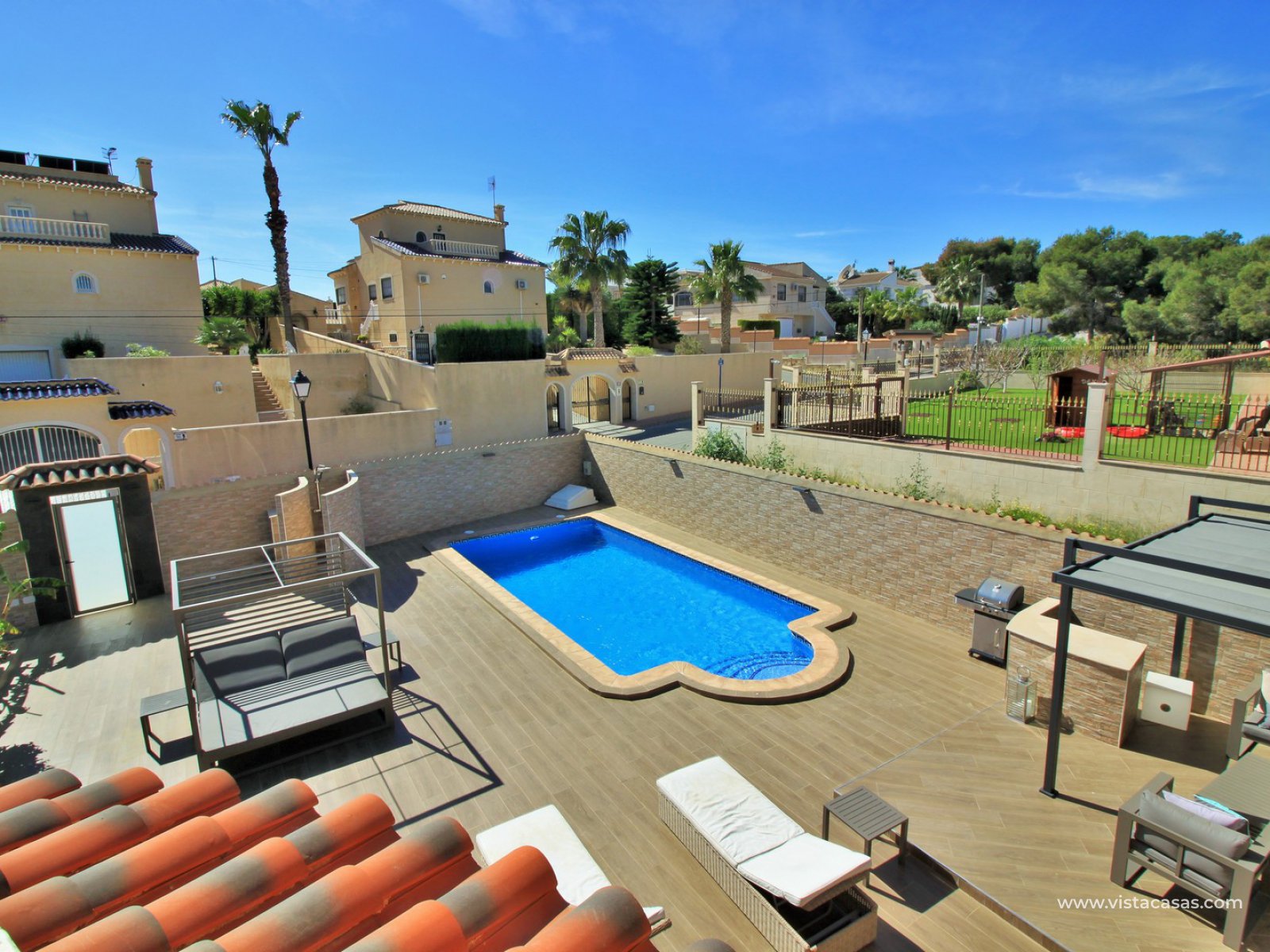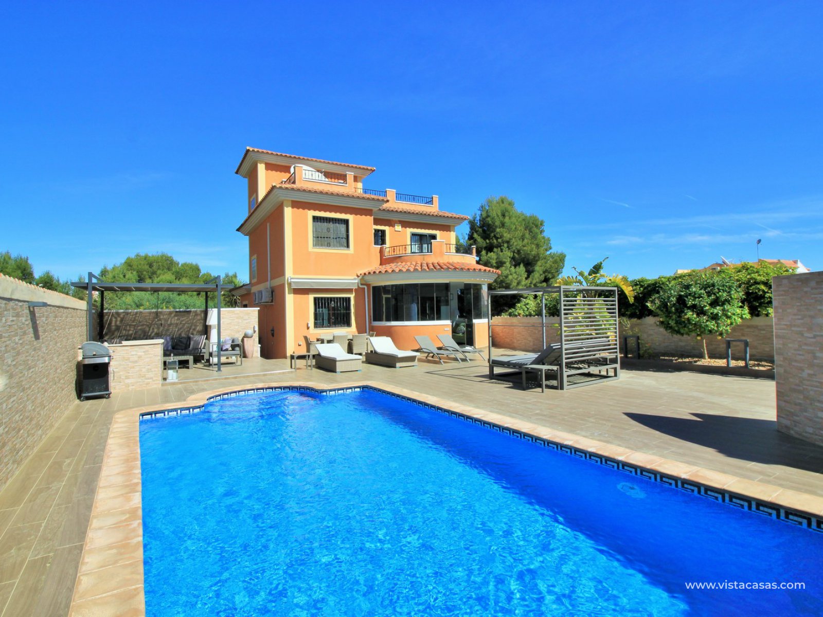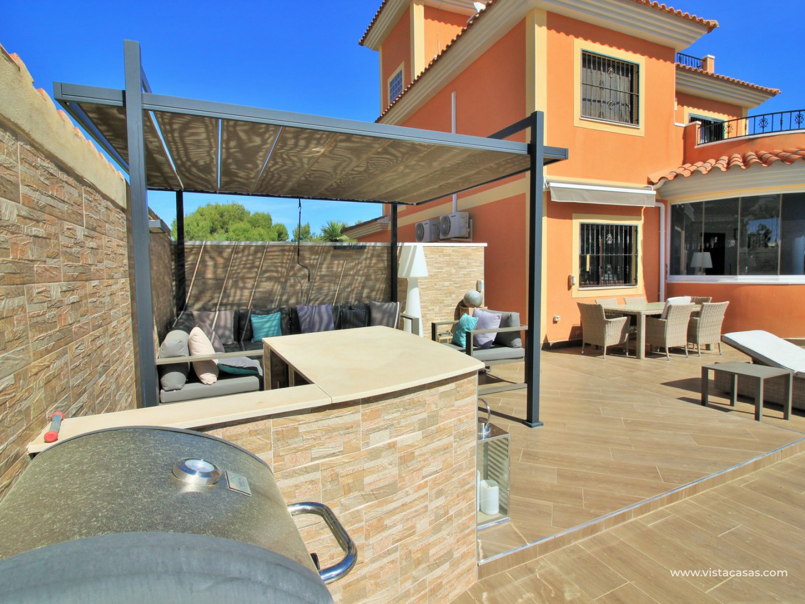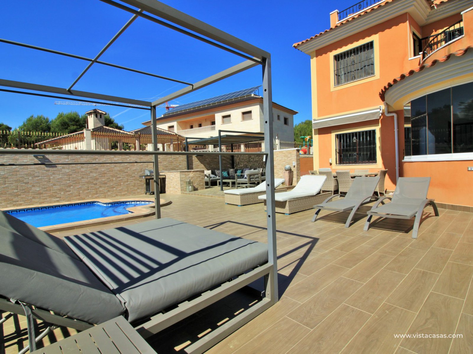 Outside there is more than ample space for sunbathing and entertaining on, with the front part of the garden being completed retiled with a summer kitchen area and gazebo and a large swimming pool. To the back of the property is a lovely mature garden area with 2 outside dining/seating areas.