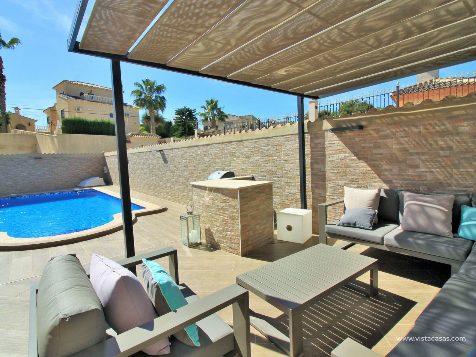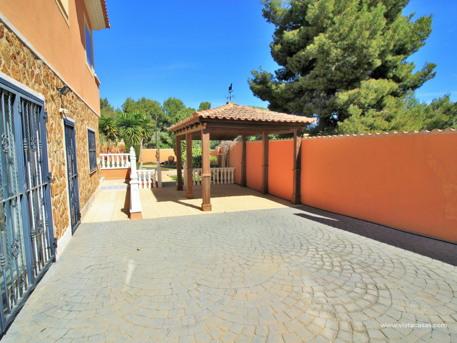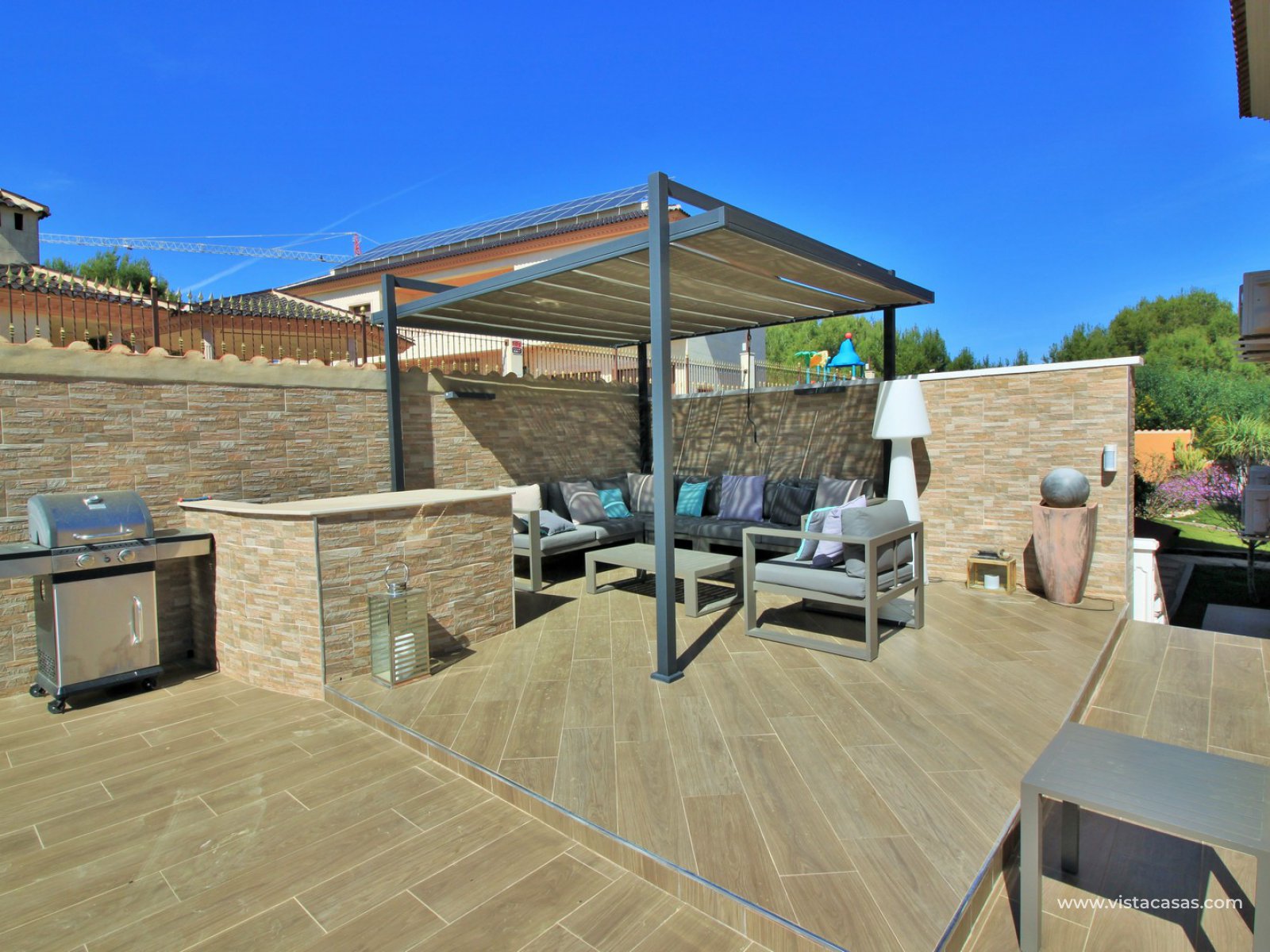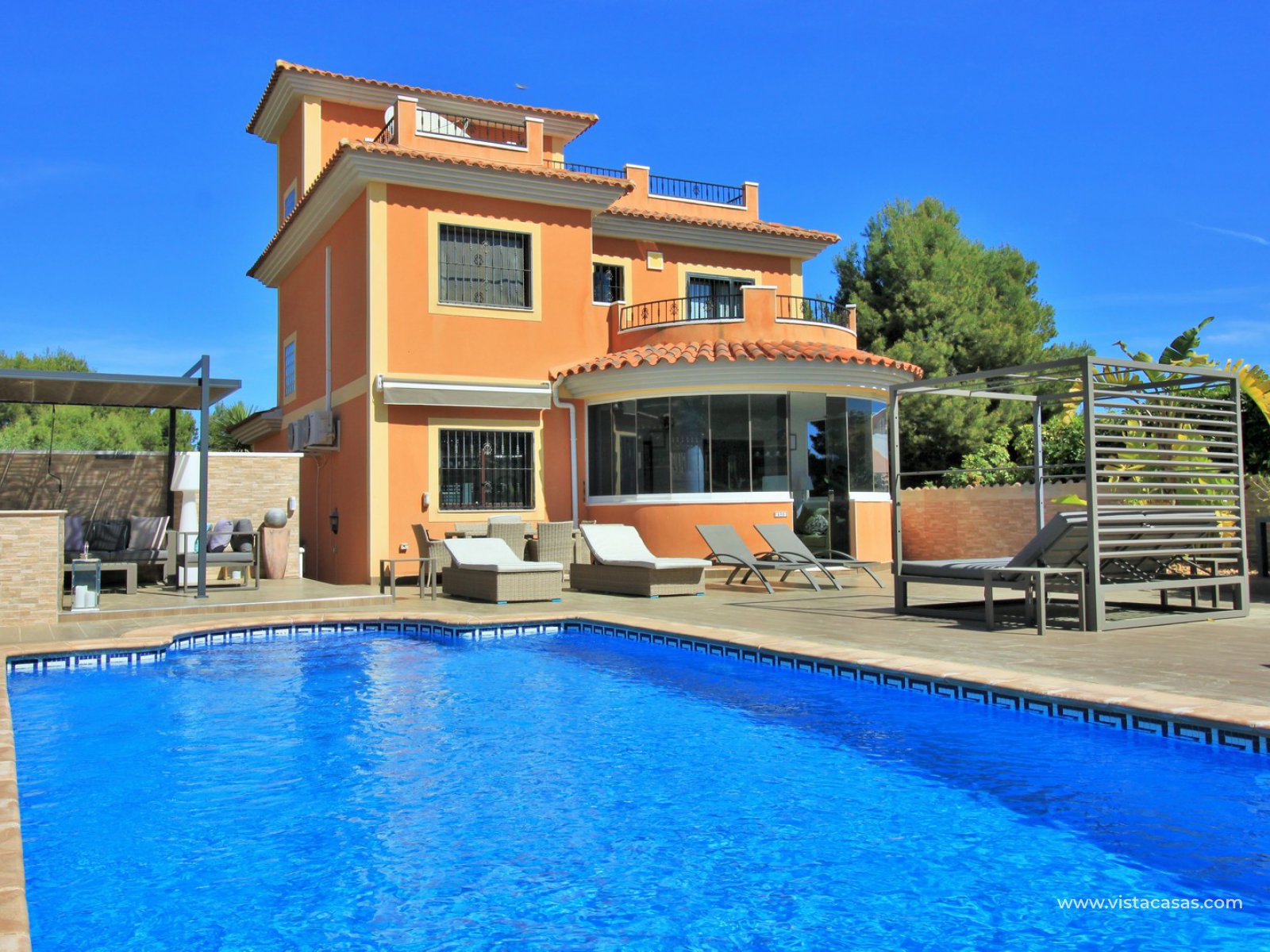 Outside there is more than ample space for sunbathing and entertaining on, with the front part of the garden being completed retiled with a summer kitchen area and gazebo and a large swimming pool. To the back of the property is a lovely mature garden area with 2 outside dining/seating areas.
