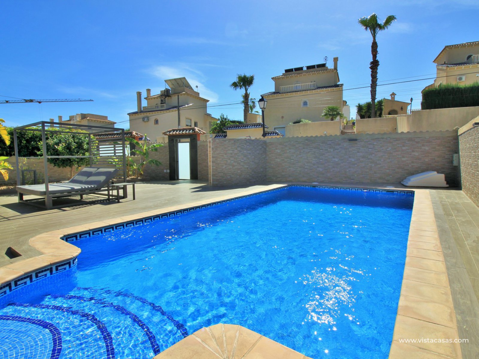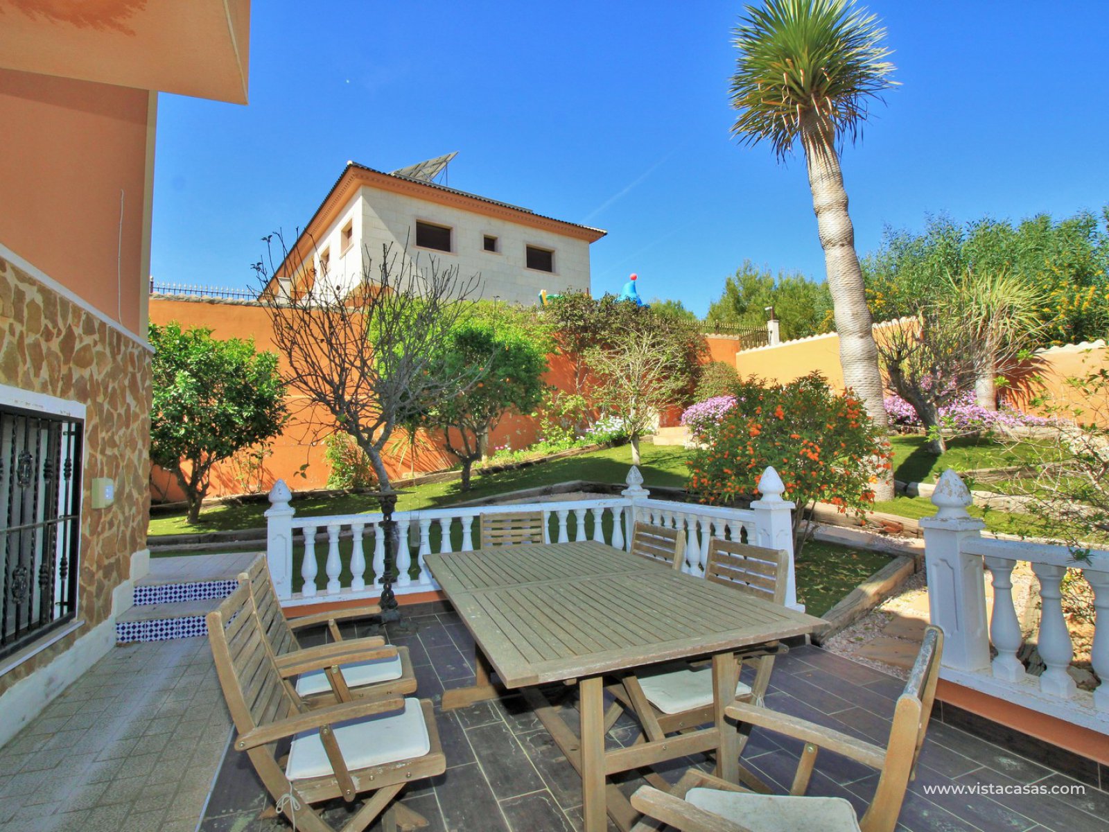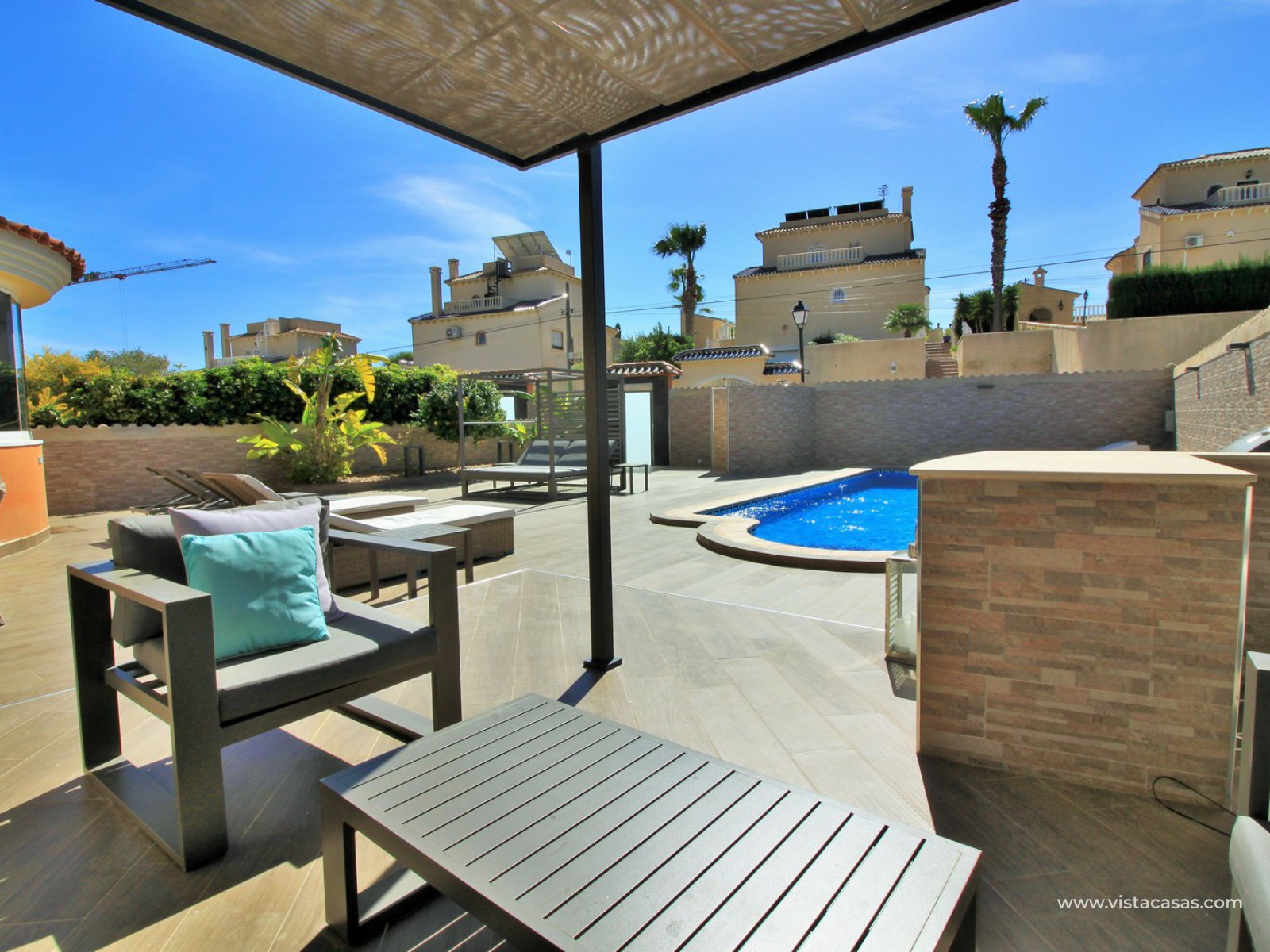 A super spacious South facing detached 5 bedroom villa with private pool on a large 866m2 private plot for sale in Las Filipinas, Villamartin, Orihuela Costa. This beautiful villa has been completed renovated throughout with new kitchen, bathrooms, flooring (inside and out), and offers air-conditioning and oil central heating throughout. Plus there is ample off road-parking with electric gates and a car port.
