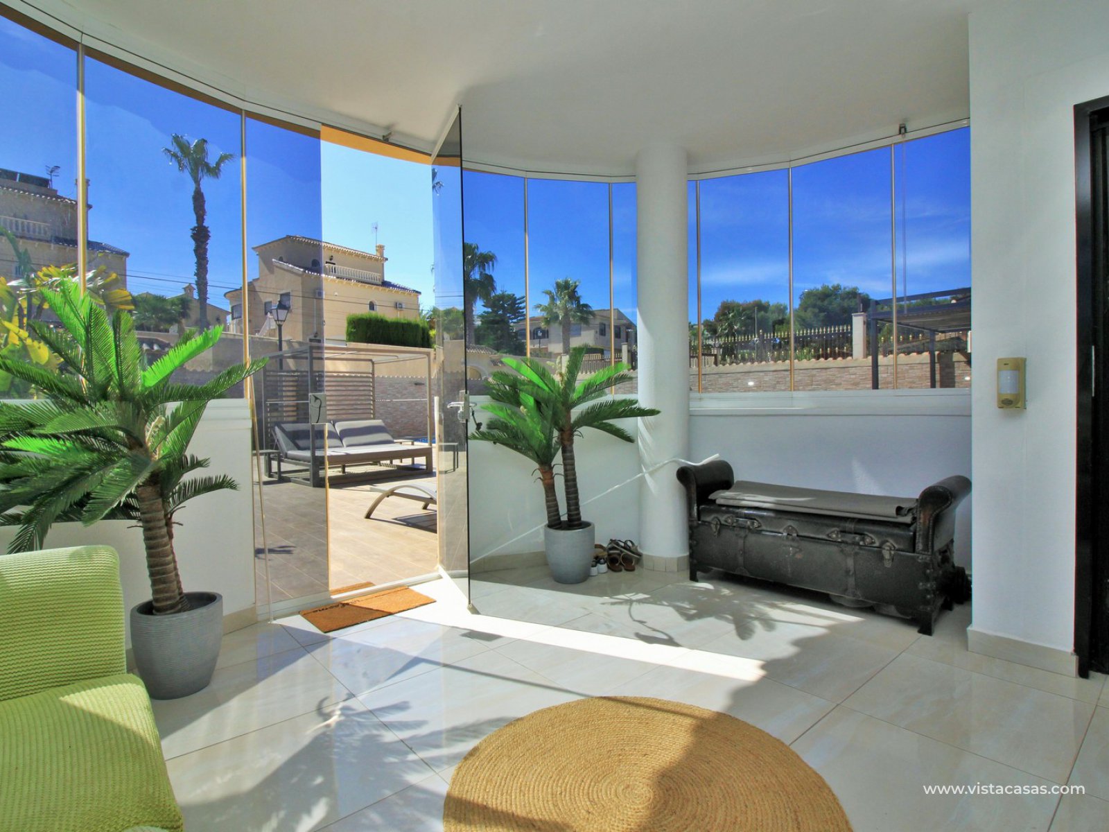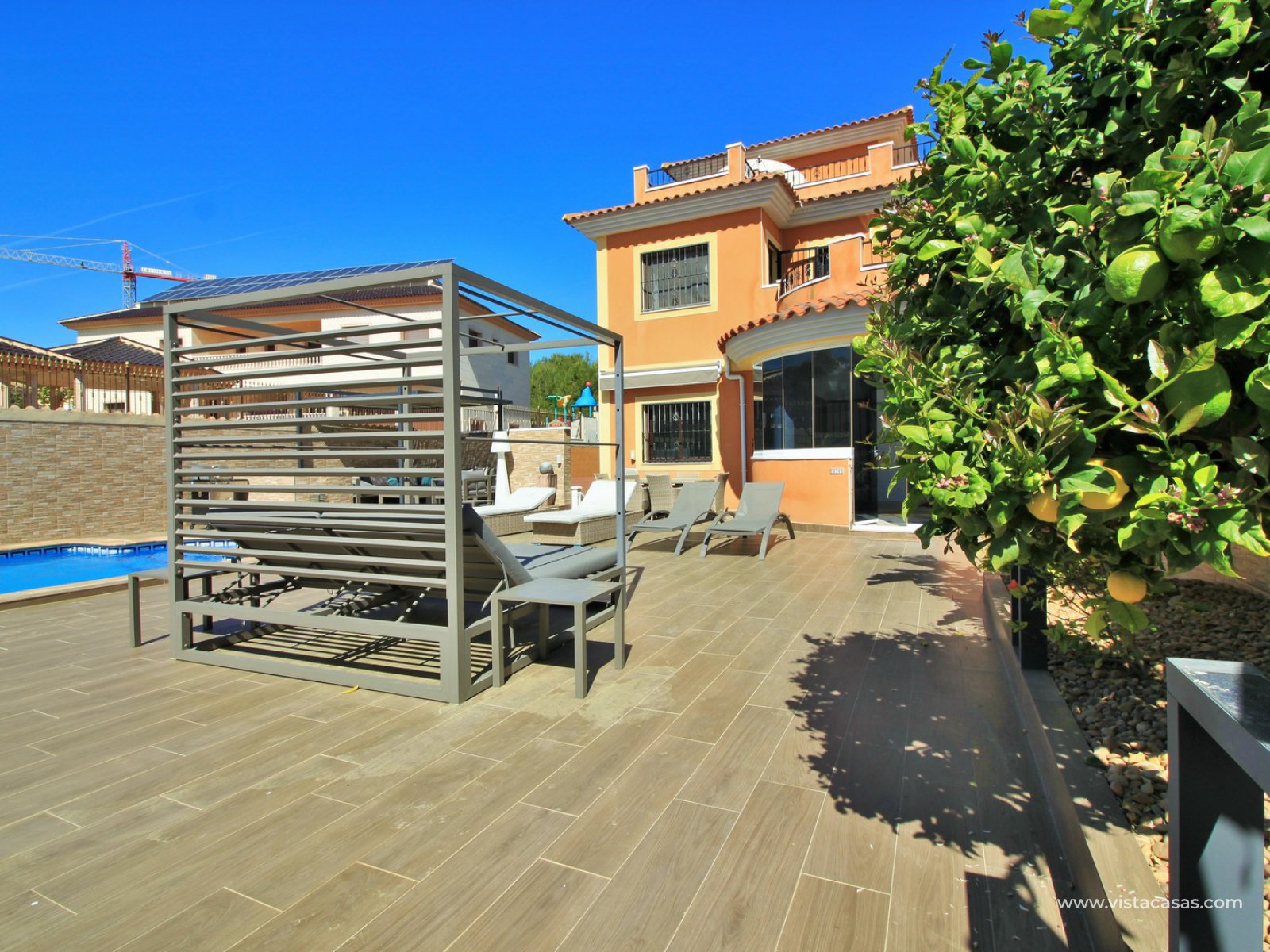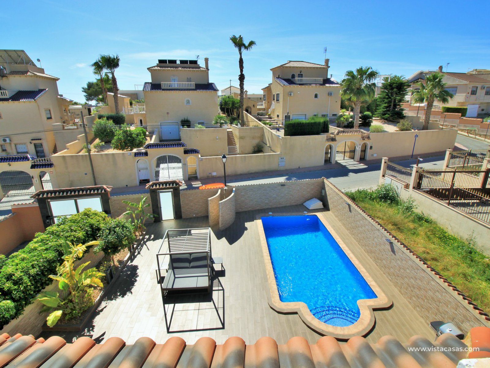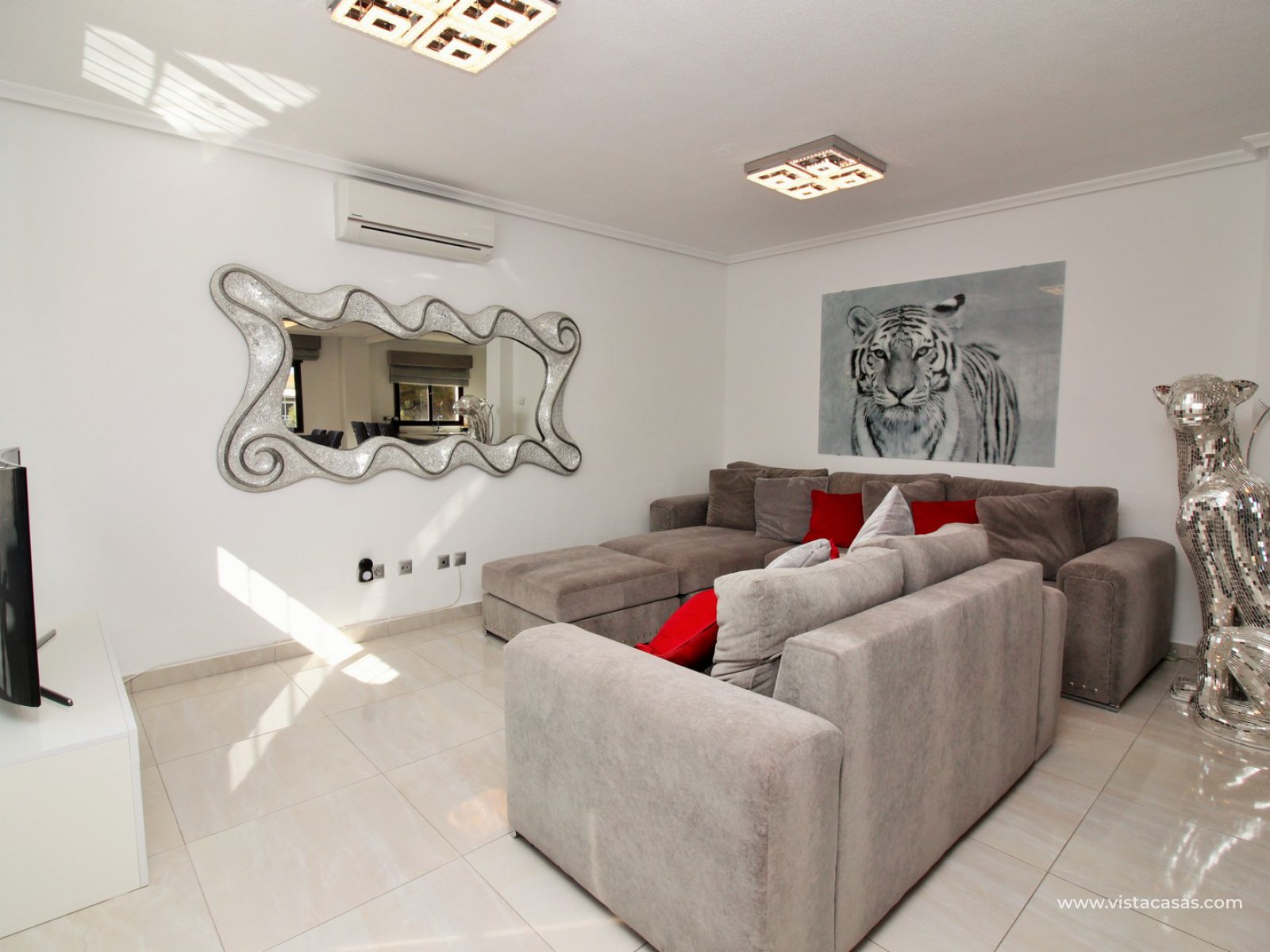 A super spacious South facing detached 5 bedroom villa with private pool on a large 866m2 private plot for sale in Las Filipinas, Villamartin, Orihuela Costa. This beautiful villa has been completed renovated throughout with new kitchen, bathrooms, flooring (inside and out), and offers air-conditioning and oil central heating throughout. Plus there is ample off road-parking with electric gates and a car port.
