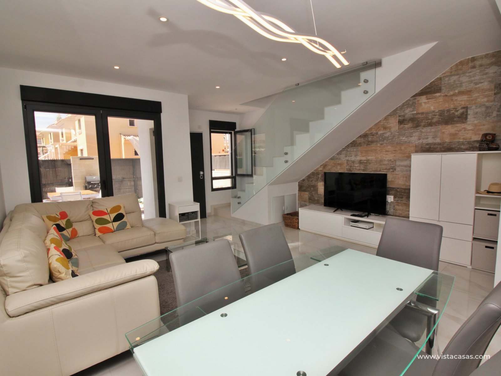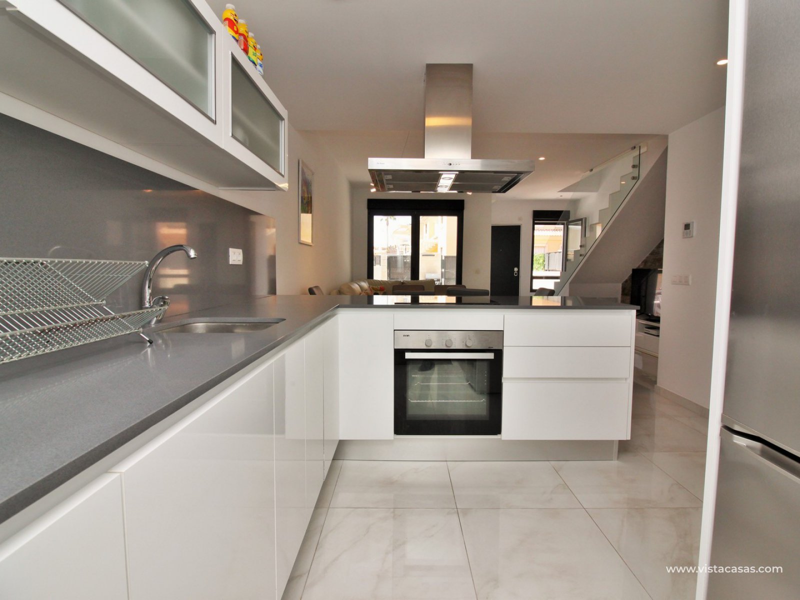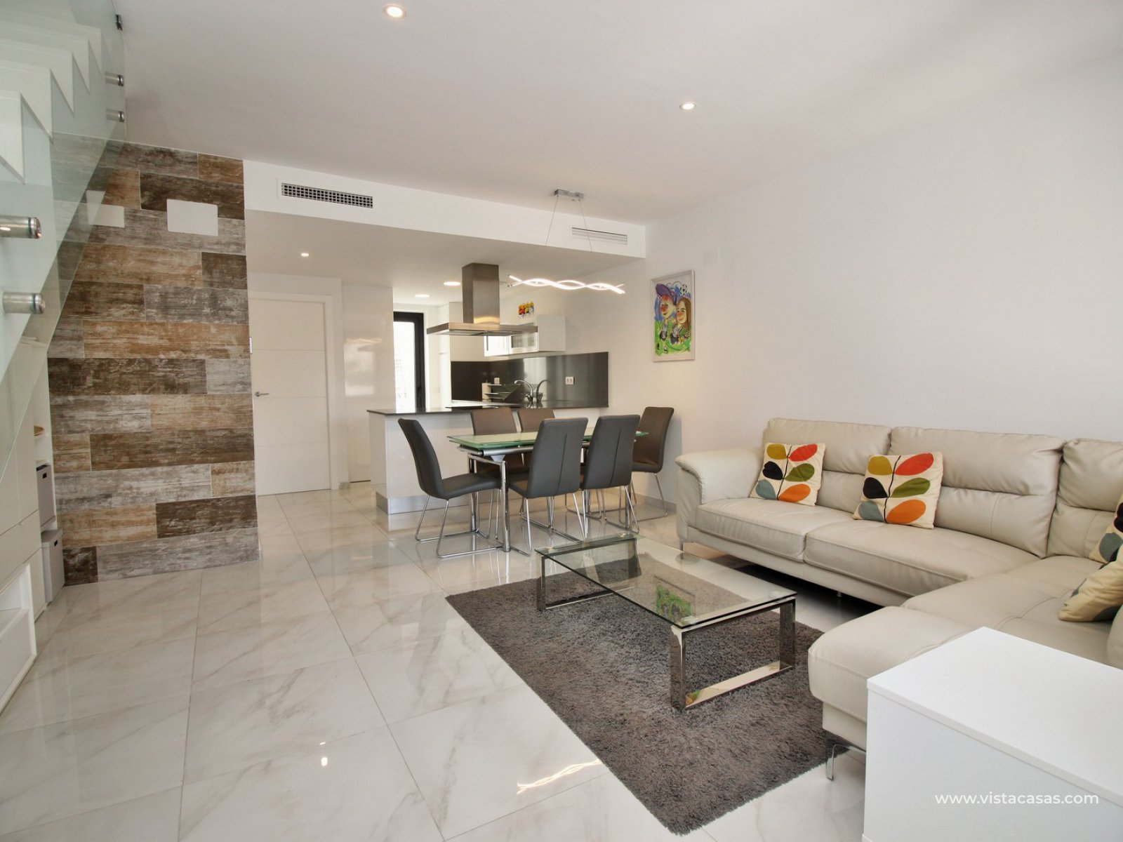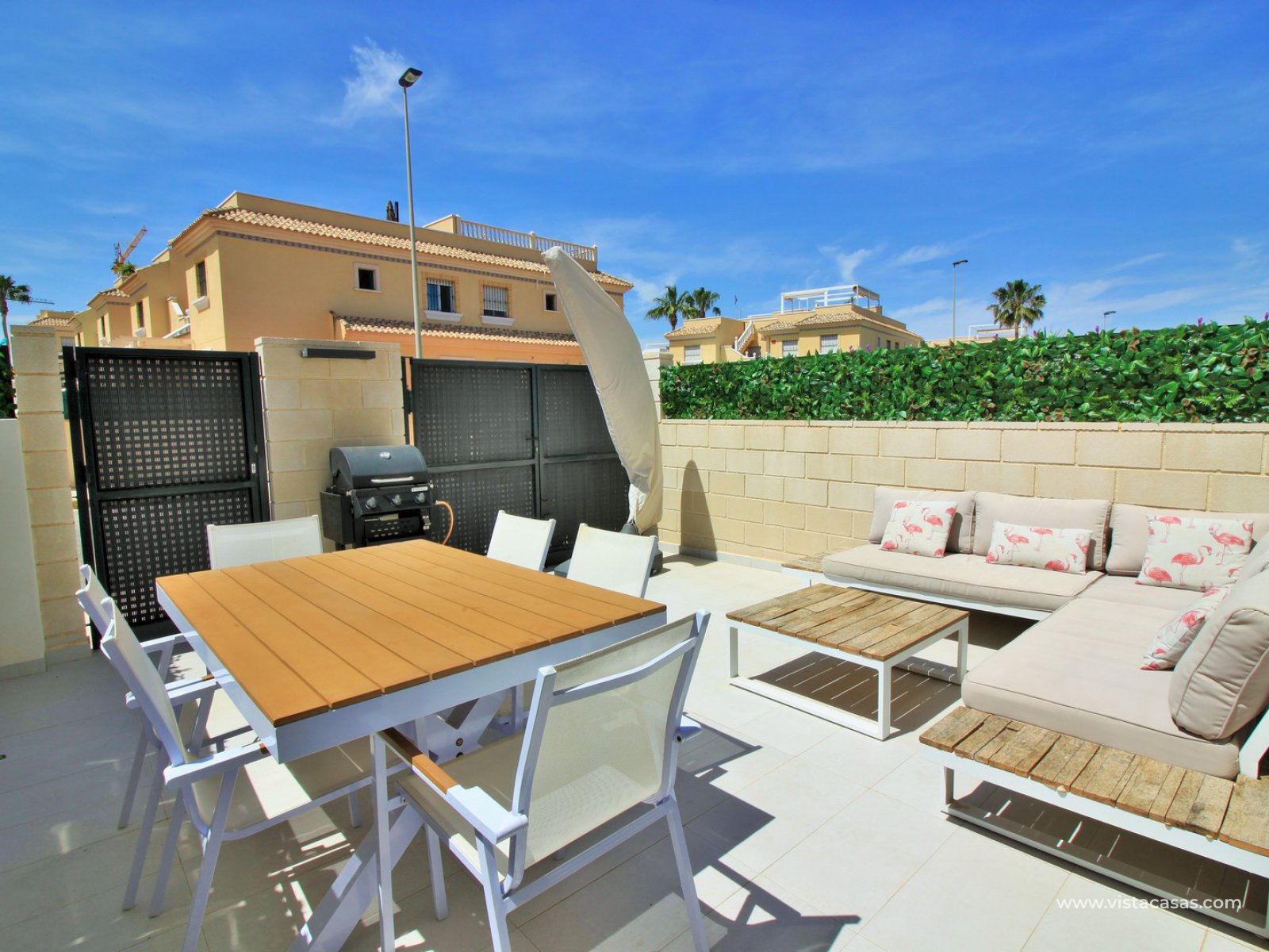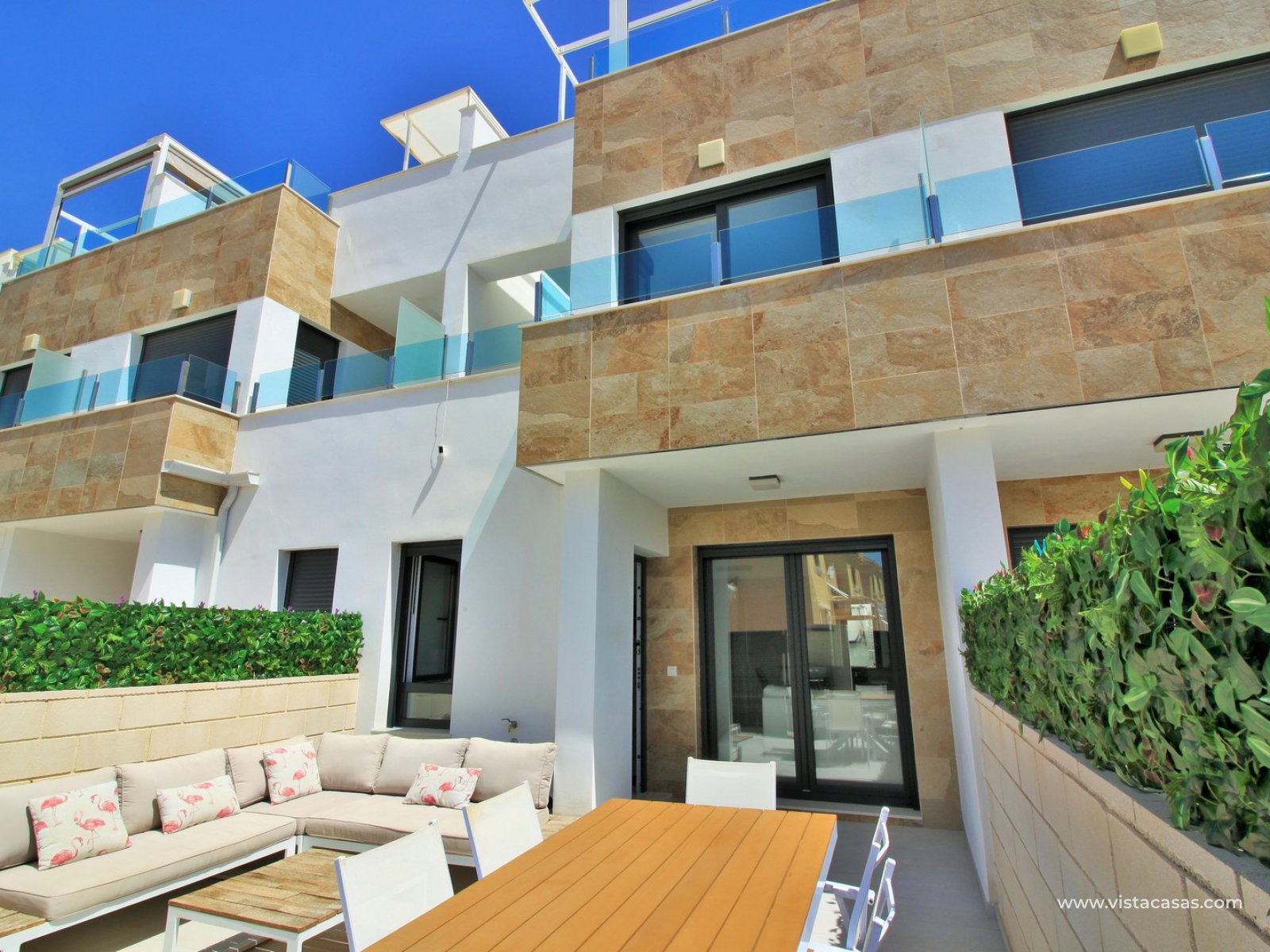 Stunning 3 bedroom, 3 bathroom modern townhouse for sale in the residential complex of El Manantial in Los Dolses, Orihuela Costa. This immaculate property was built in 2017 and offers a sunny front garden, roof solarium and rear terrace. El Manantial offers all homeowners use of great communal facilities including a large swimming pool, a heated pool, children's play area and a petanca court. Situated in a great location within a 10 minutes' walk to a wide variety of amenities in Los Dosles, including a supermarket, shops, bars, restaurants, bus stop...The Zenia Boulevard and the beaches are only a 5 minutes' drive away.