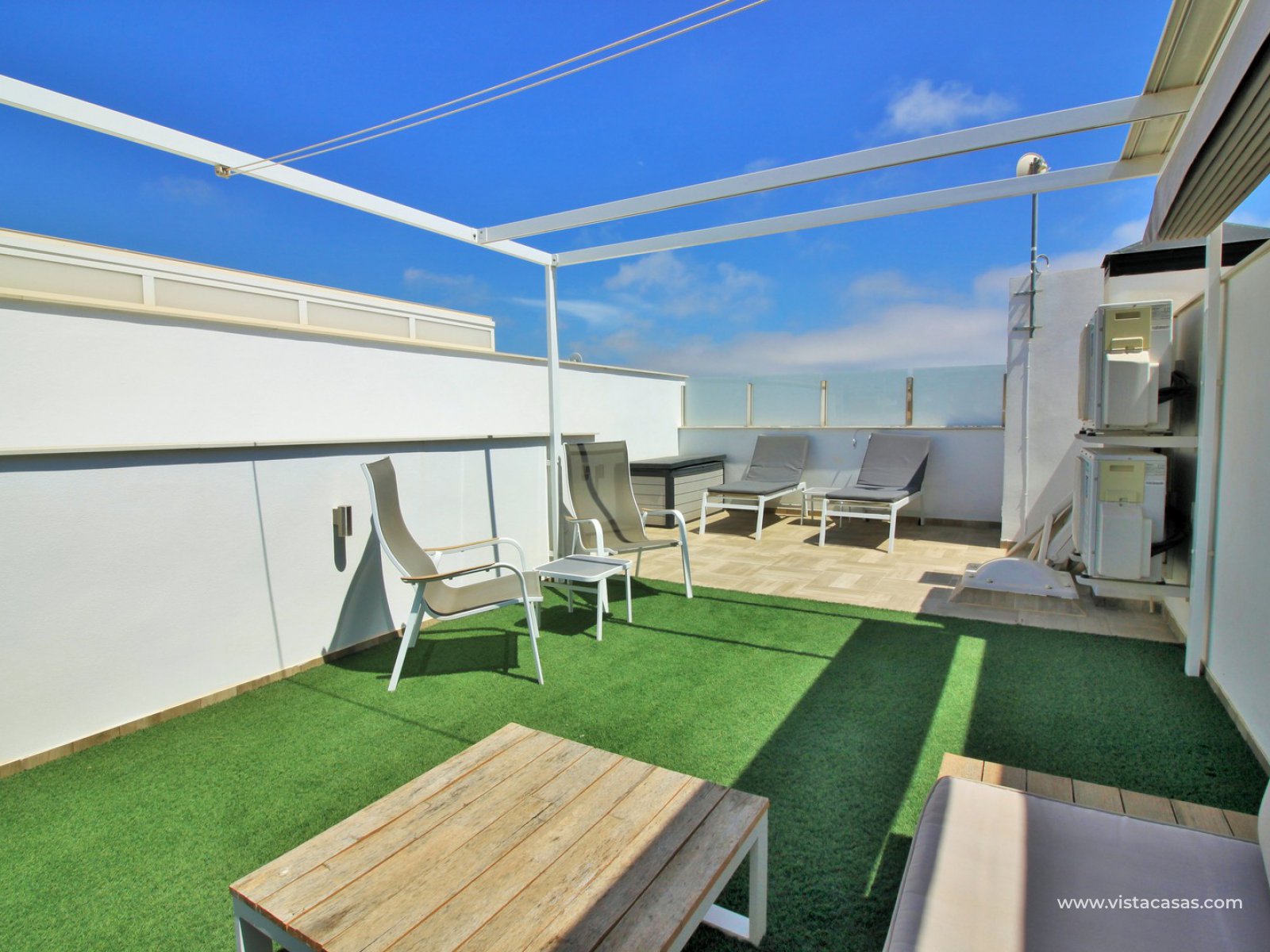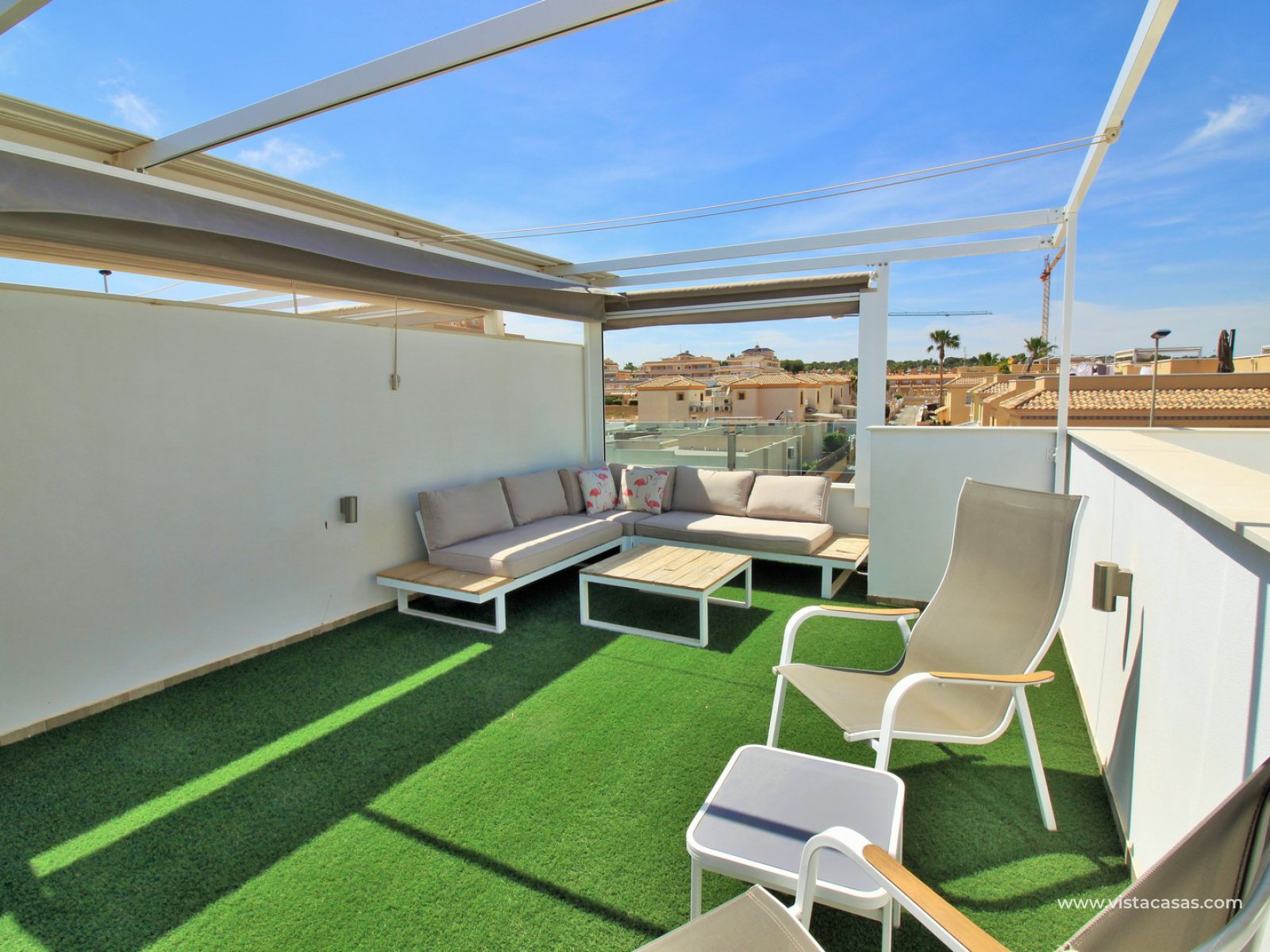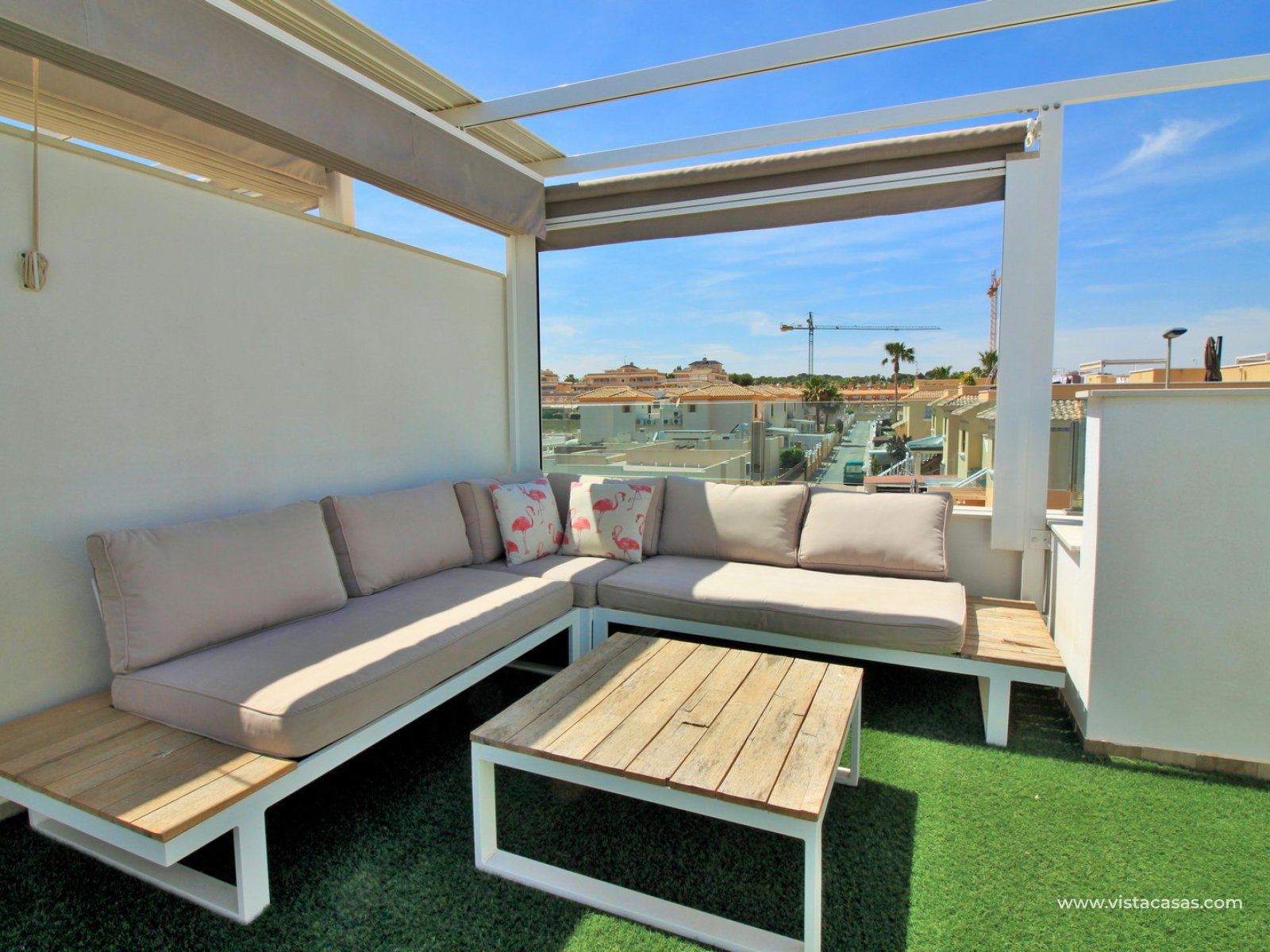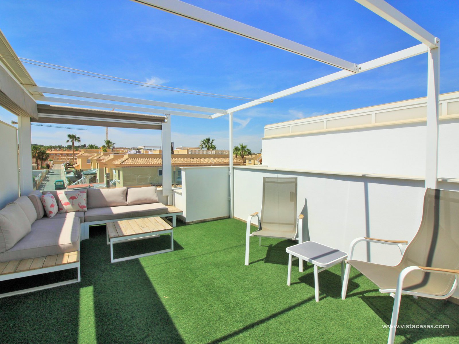 The living accommodation on the ground floor comprises of a very spacious lounge-dining area with American style kitchen to the rear with covered utility area, a twin bedroom with fitted wardrobes, and a bathroom with walk-in shower. Upstairs there are 2 spacious double bedrooms which both offer en-suite bathrooms with walk-in showers. The master bedroom offers double fitted wardrobes, plus a Juliet balcony with access up to the roof solarium. The rear double bedroom offers fitted wardrobes, plus access to a private terrace, perfect for the midday sun. From the landing and master bedroom you can access the large 37m2 roof solarium with storage cupboard. The owners have installed privacy glass on the solarium, plus a retractable awning.