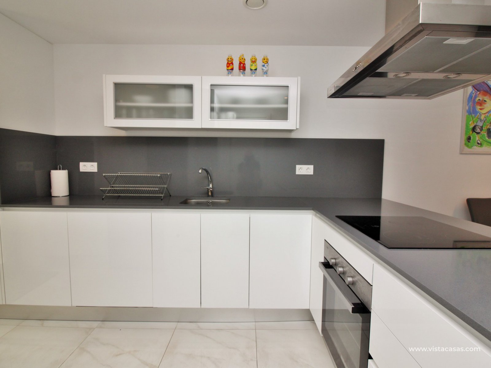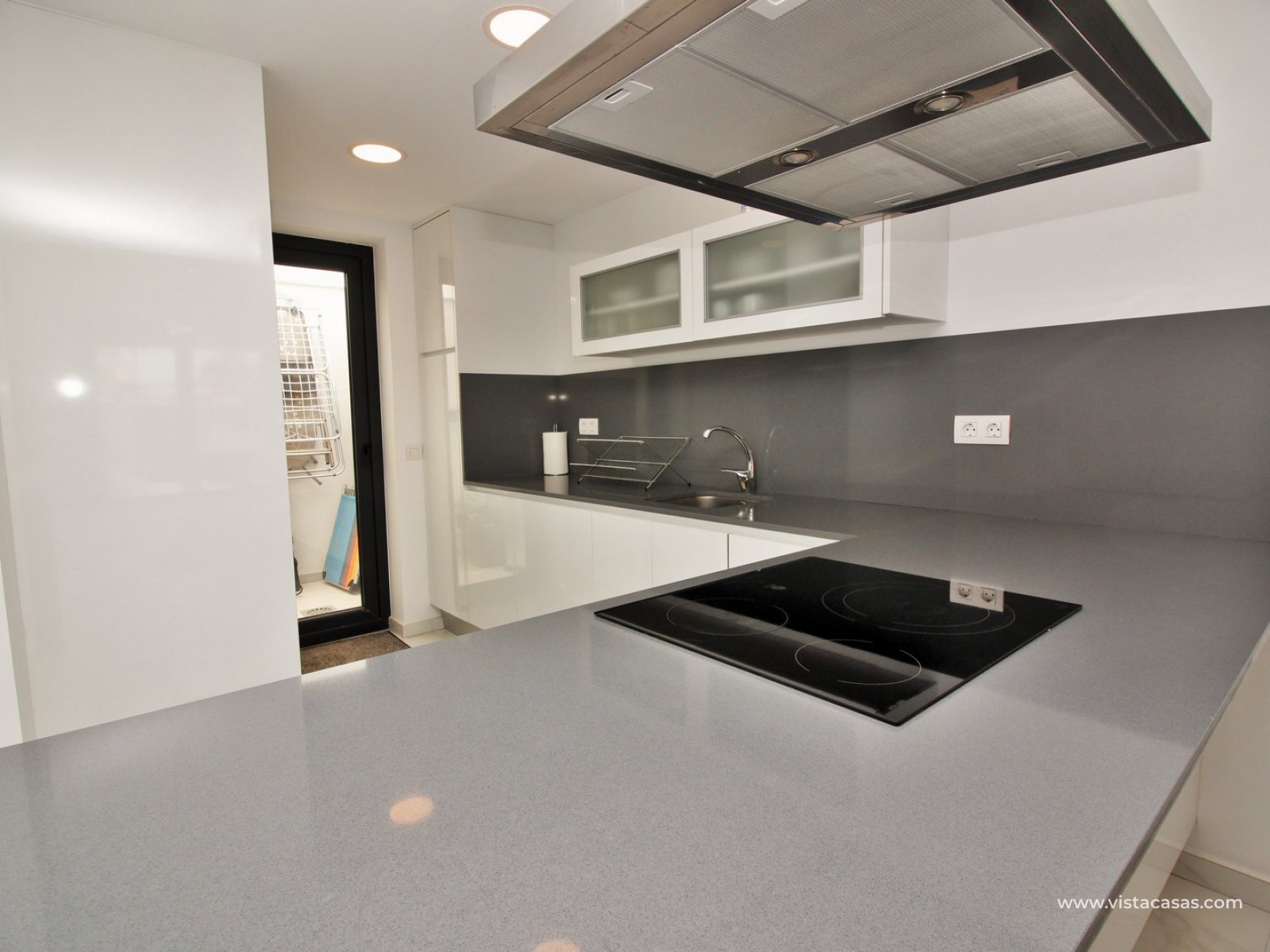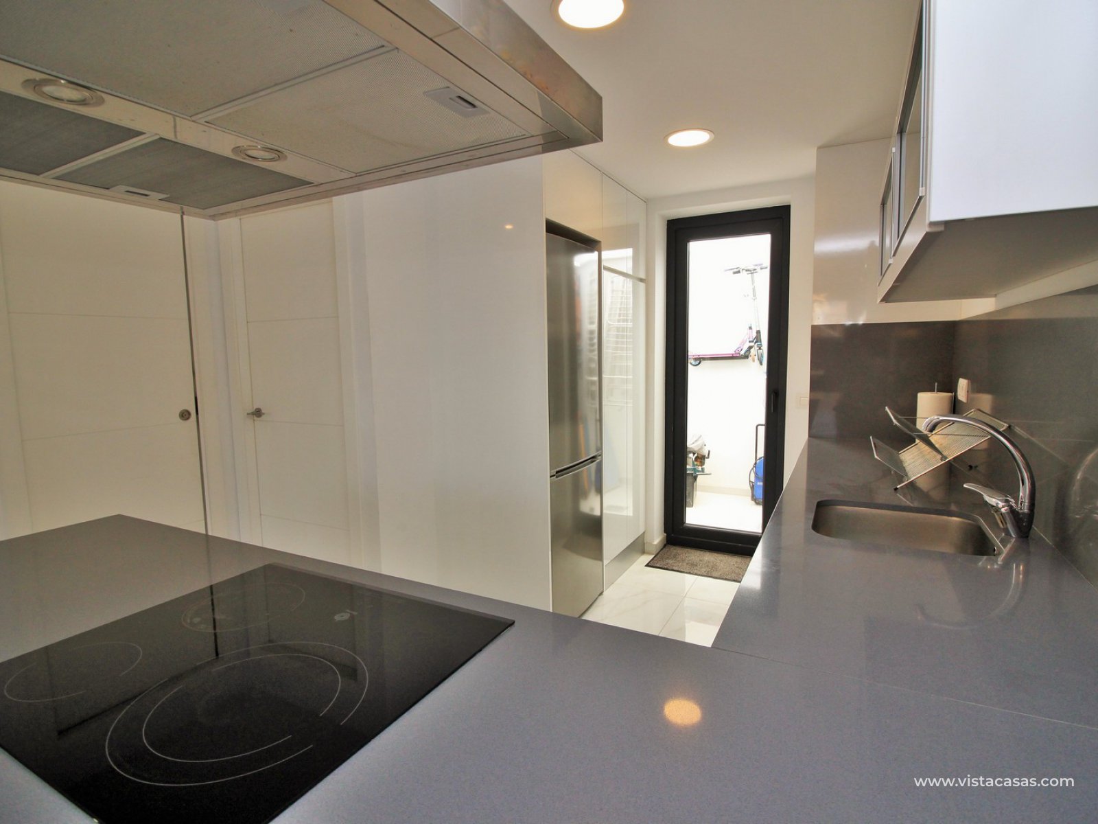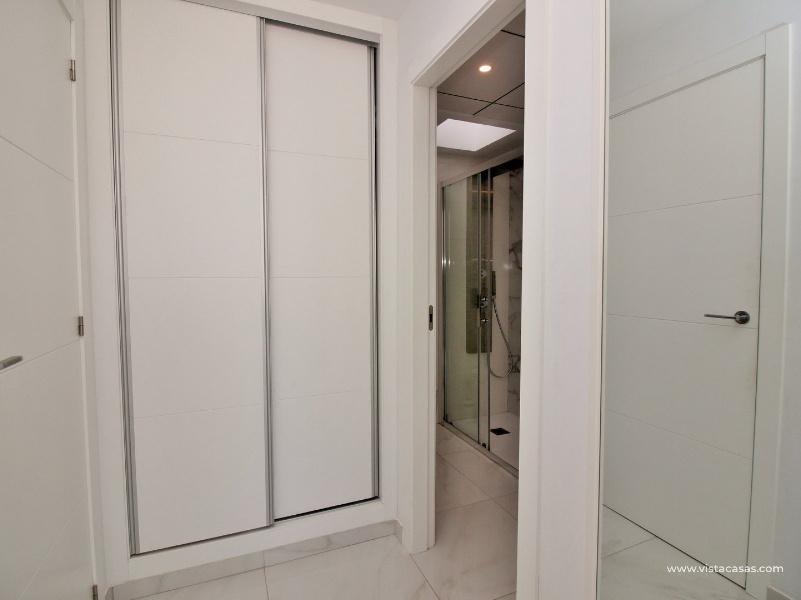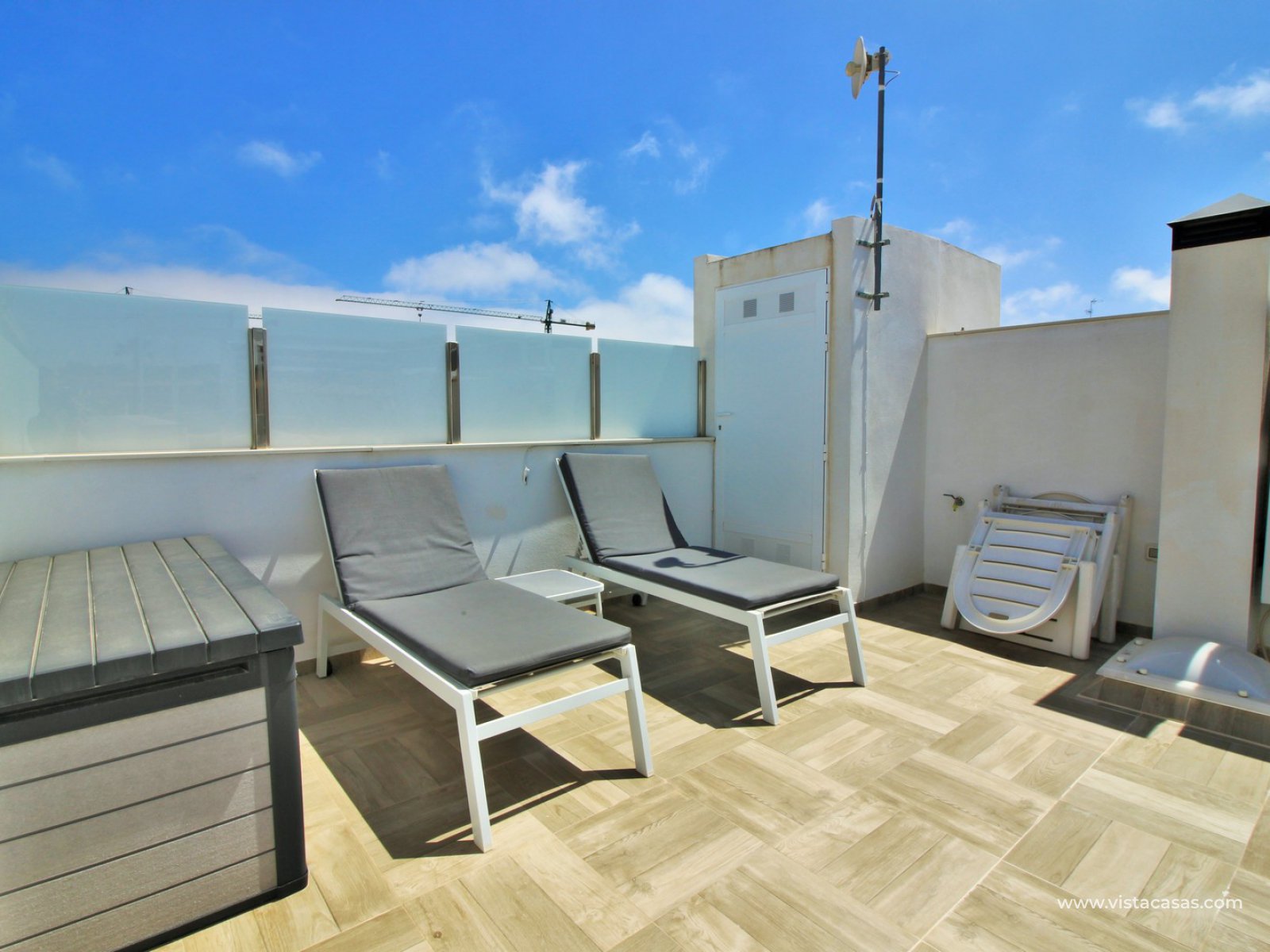 The living accommodation on the ground floor comprises of a very spacious lounge-dining area with American style kitchen to the rear with covered utility area, a twin bedroom with fitted wardrobes, and a bathroom with walk-in shower. Upstairs there are 2 spacious double bedrooms which both offer en-suite bathrooms with walk-in showers. The master bedroom offers double fitted wardrobes, plus a Juliet balcony with access up to the roof solarium. The rear double bedroom offers fitted wardrobes, plus access to a private terrace, perfect for the midday sun. From the landing and master bedroom you can access the large 37m2 roof solarium with storage cupboard. The owners have installed privacy glass on the solarium, plus a retractable awning.