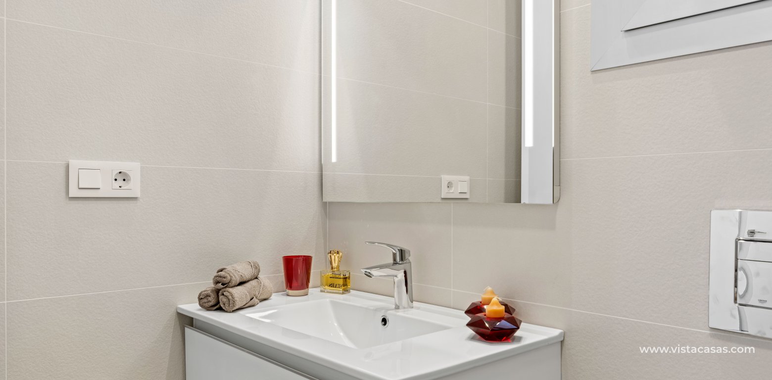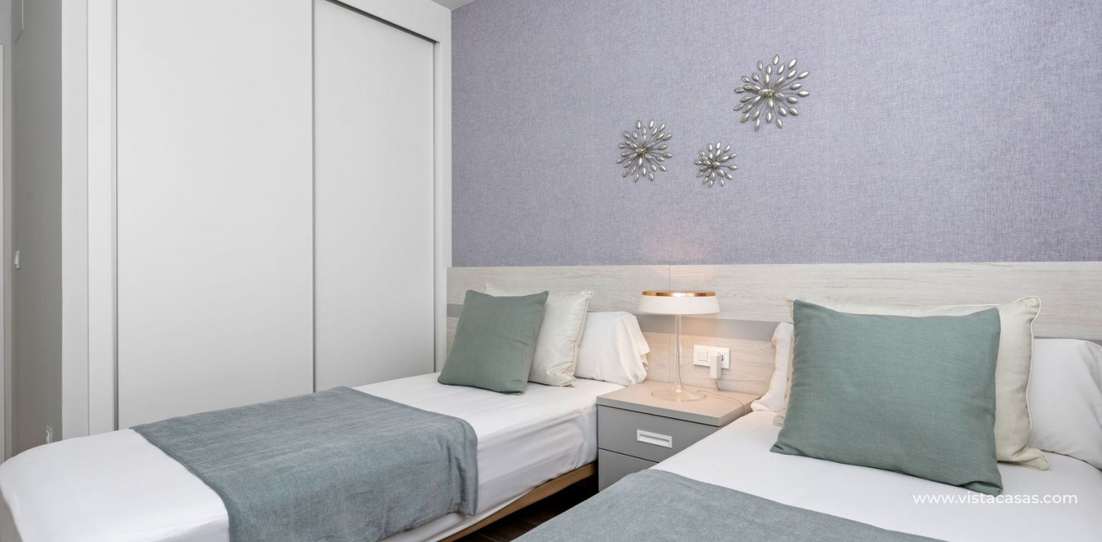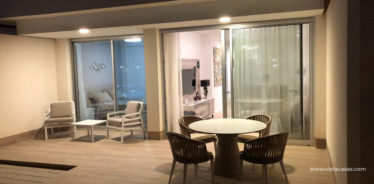KEY READY, new build apartments in Los Dolses, Villamartin. The apartments have 2 bedrooms and 2 bathrooms, a spacious lounge and dining area, fully fitted kitchen with appliances included, utility room which has the aero thermic, energy saving, boiler system installed, a master bedroom with an en suite bathroom and a twin bedroom and guest bathroom. The apartments come with fully installed Mitsubishi ducted air conditioning, a home-remote demotic system, internal ceiling spotlights, fully fitted bathrooms with under floor heating, electric window and door shutters and a parking space. The complex offers a big communal swimming pool, green areas, sauna, playground and bio gym. In the surroundings there is a wide selection of nice restaurants, shops and coffee-shops and bars. Within 2km you can reach the biggest shopping centre in southern Spain, Zenia Boulevard, several golf courses and the best beaches that Orihuela Costa offers.