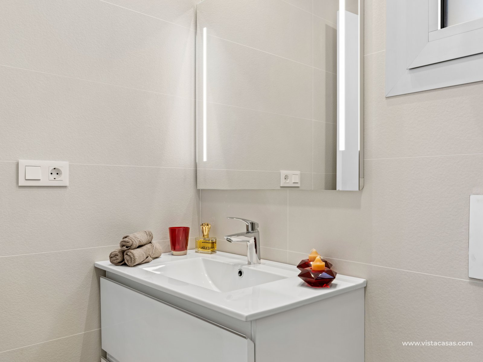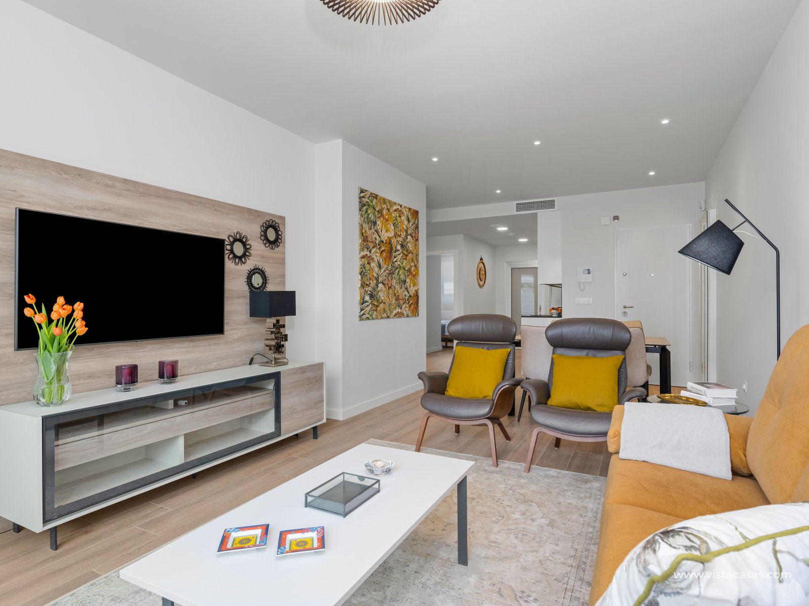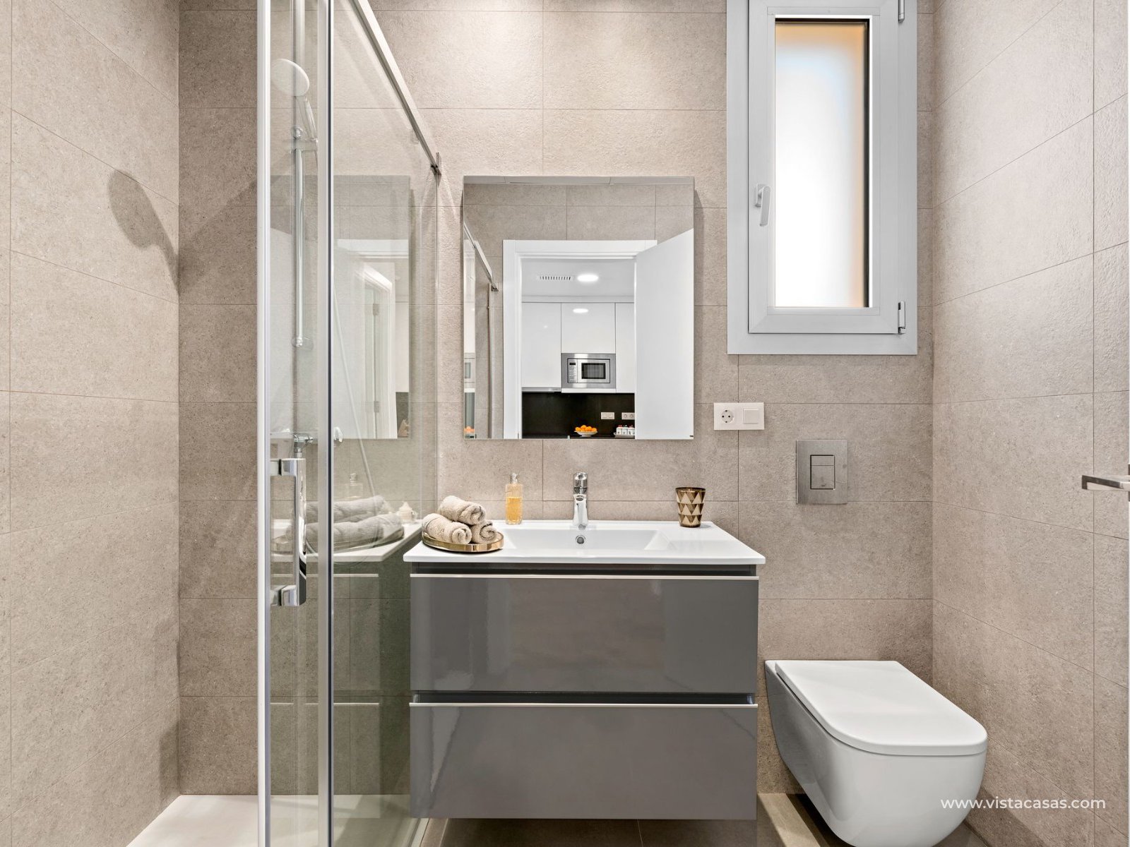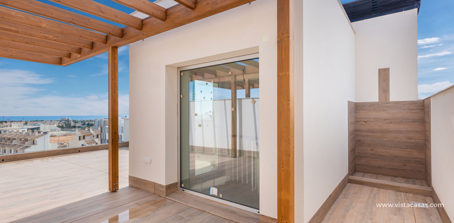 KEY READY, new build apartments in Los Dolses, Villamartin. The apartments have 2 bedrooms and 2 bathrooms, a spacious lounge and dining area, fully fitted kitchen with appliances included, utility room which has the aero thermic, energy saving, boiler system installed, a master bedroom with an en suite bathroom and a twin bedroom and guest bathroom. The apartments come with fully installed Mitsubishi ducted air conditioning, a home-remote demotic system, internal ceiling spotlights, fully fitted bathrooms with under floor heating, electric window and door shutters and a parking space. The complex offers a big communal swimming pool, green areas, sauna, playground and bio gym. In the surroundings there is a wide selection of nice restaurants, shops and coffee-shops and bars. Within 2km you can reach the biggest shopping centre in southern Spain, Zenia Boulevard, several golf courses and the best beaches that Orihuela Costa offers.