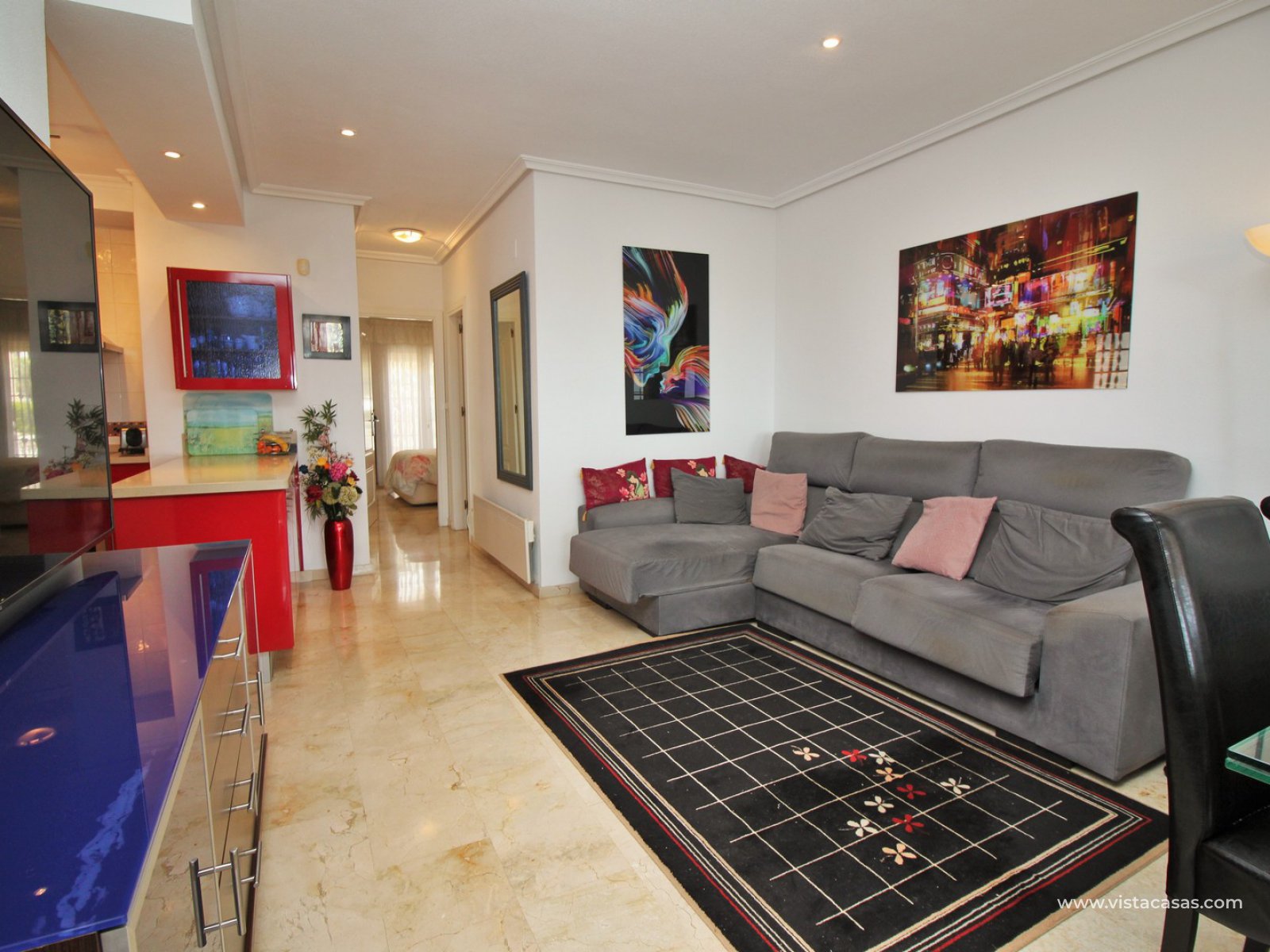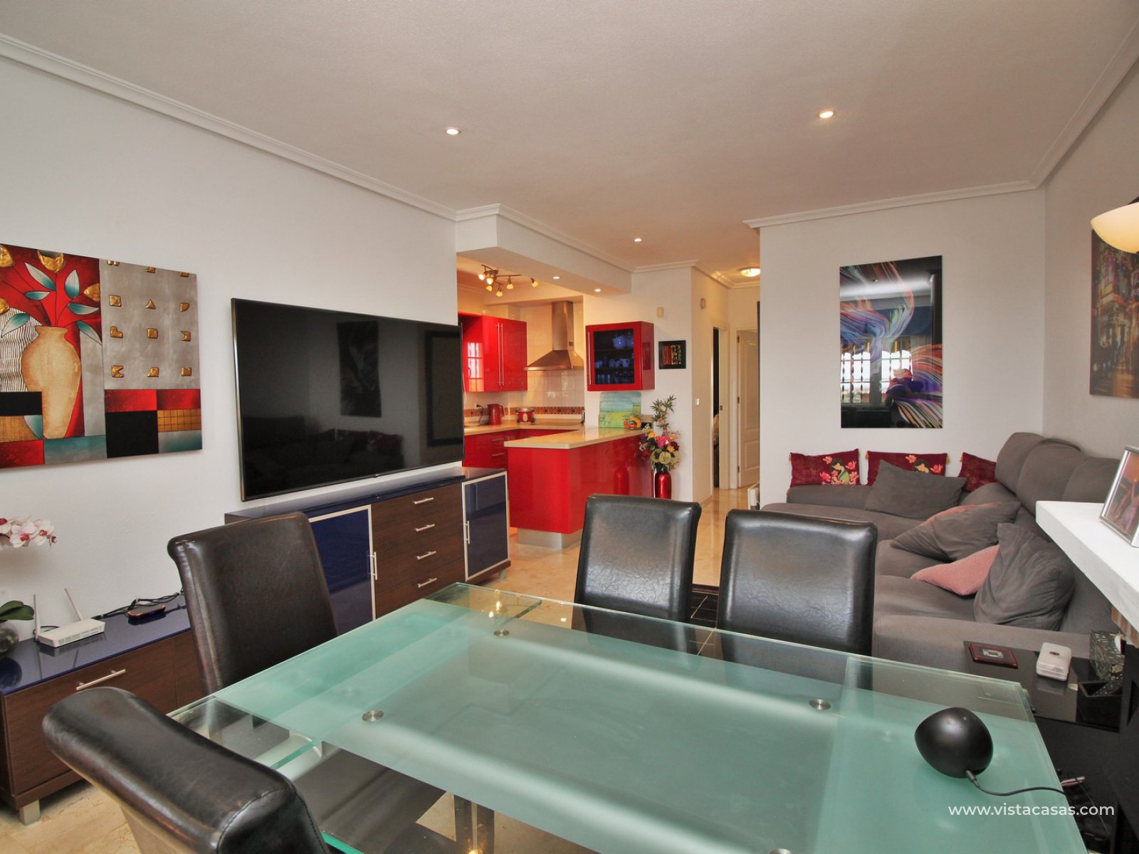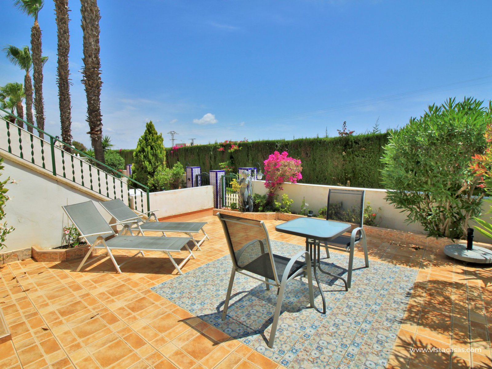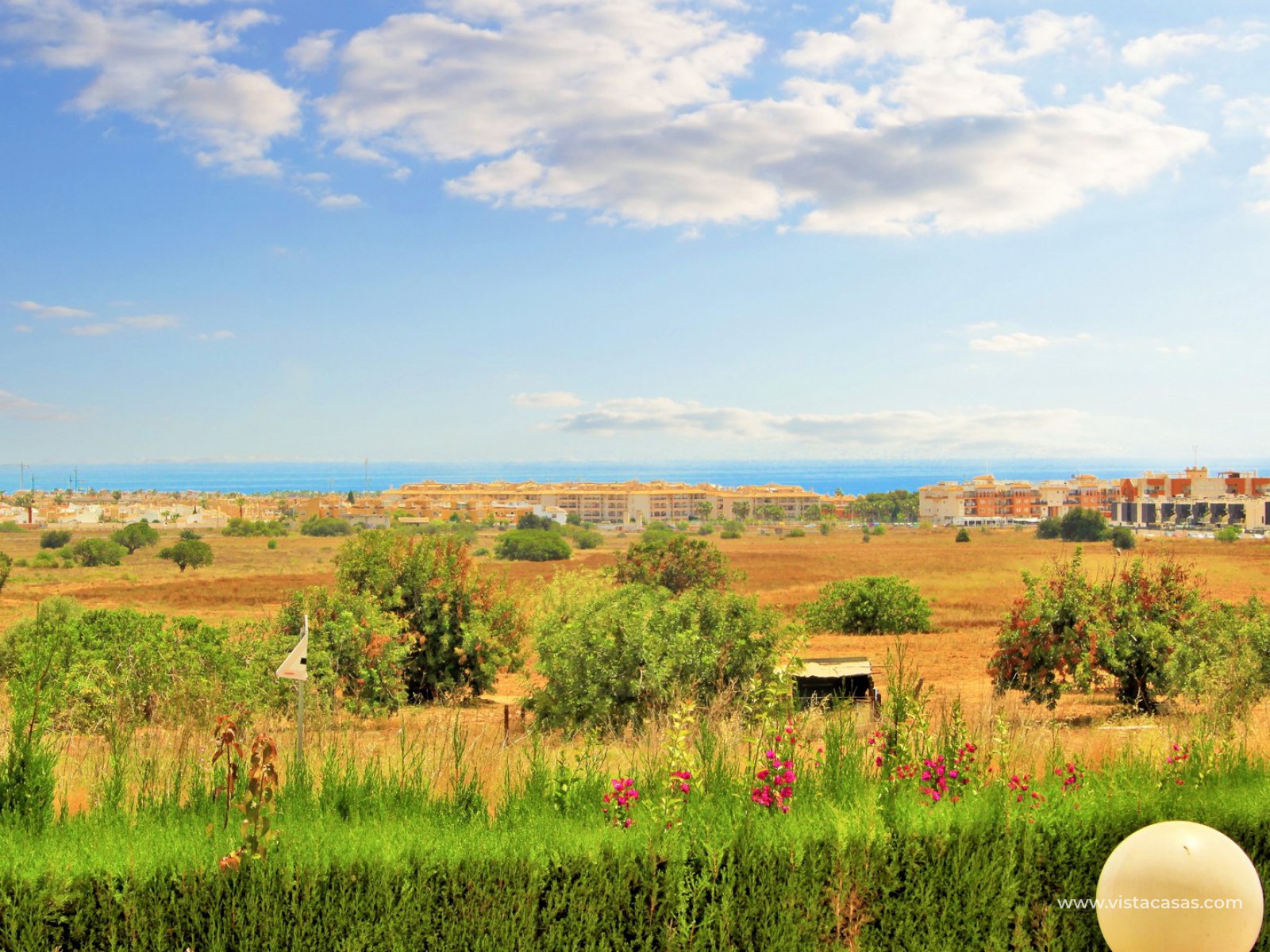 LOCATION, LOCATION! Fantastic 2 bedroom ground floor apartment with sea views for sale in the highly sought-after area of Las Violetas in R4, Villamartin. This beautiful property has great outdoor space including a good sized tiled garden, and a raised terrace with great sea views. Comprising of a bright lounge-dining area with feature fireplace, open kitchen with utility area, 2 bedrooms with fitted wardrobes and a family bathroom with walk-in shower. The master bedroom benefits from an en-suite bathroom. Part of a well kept community with a lovely communal pool and chill out areas. Sold furnished with air-conditioning.