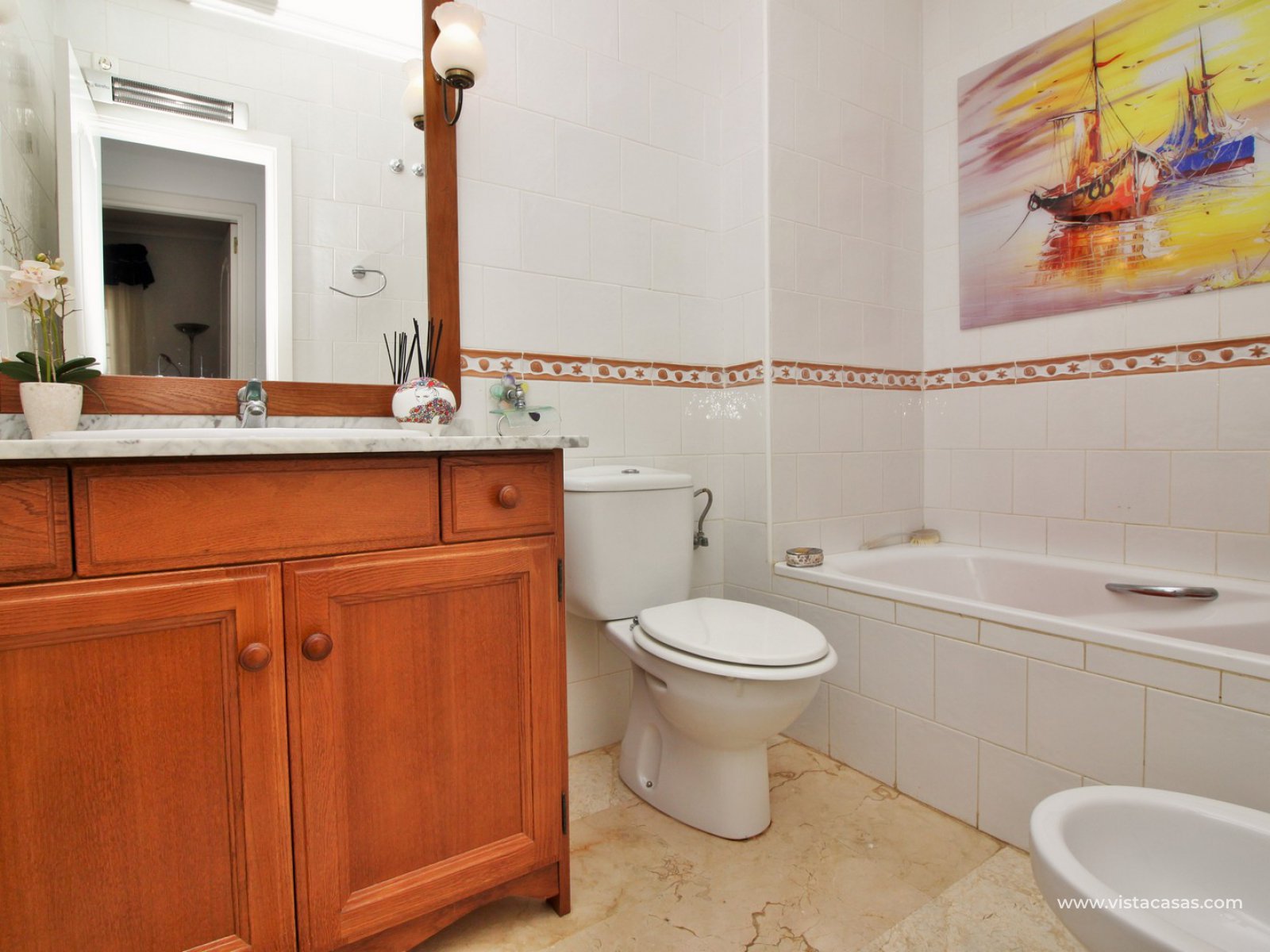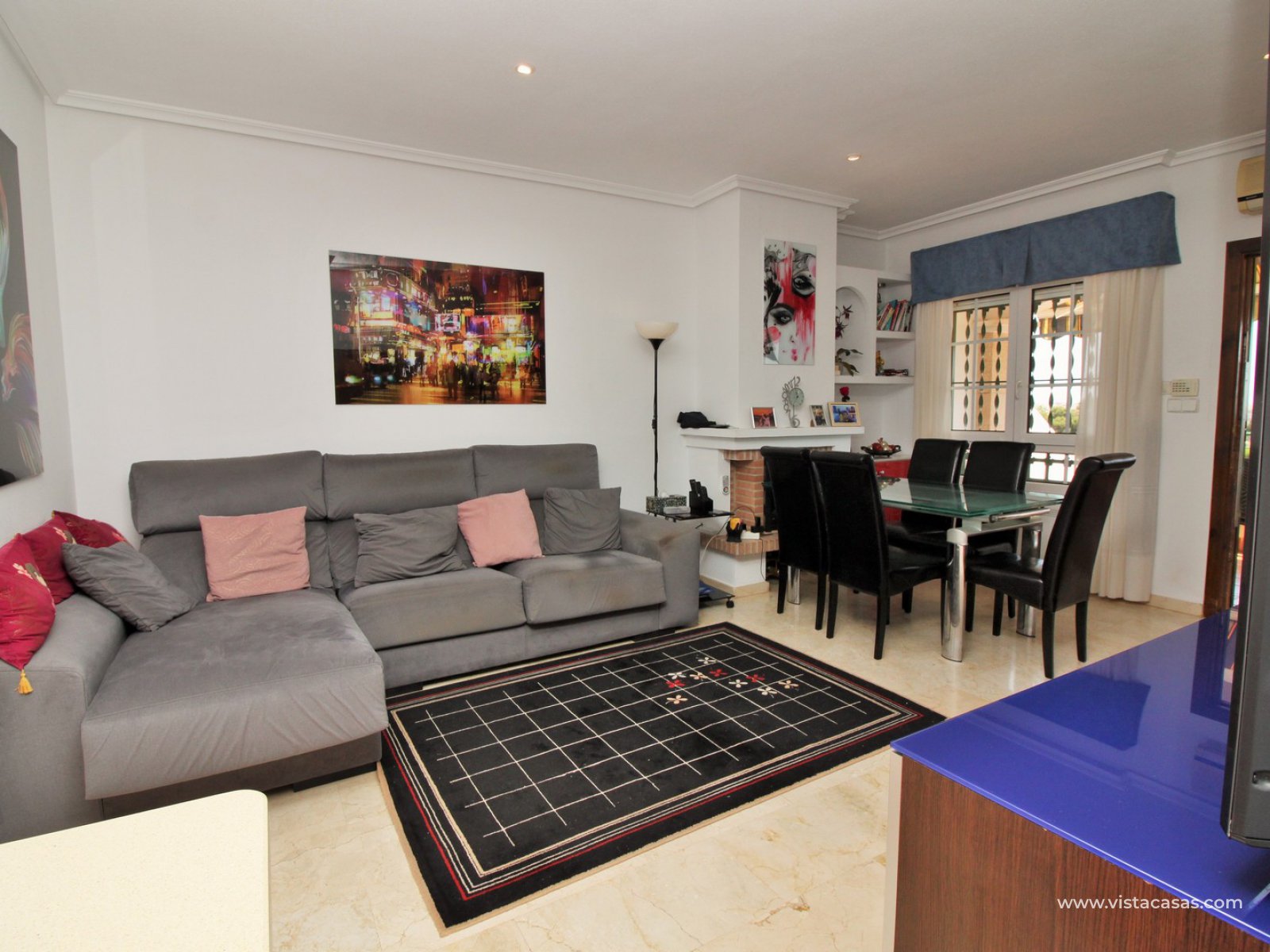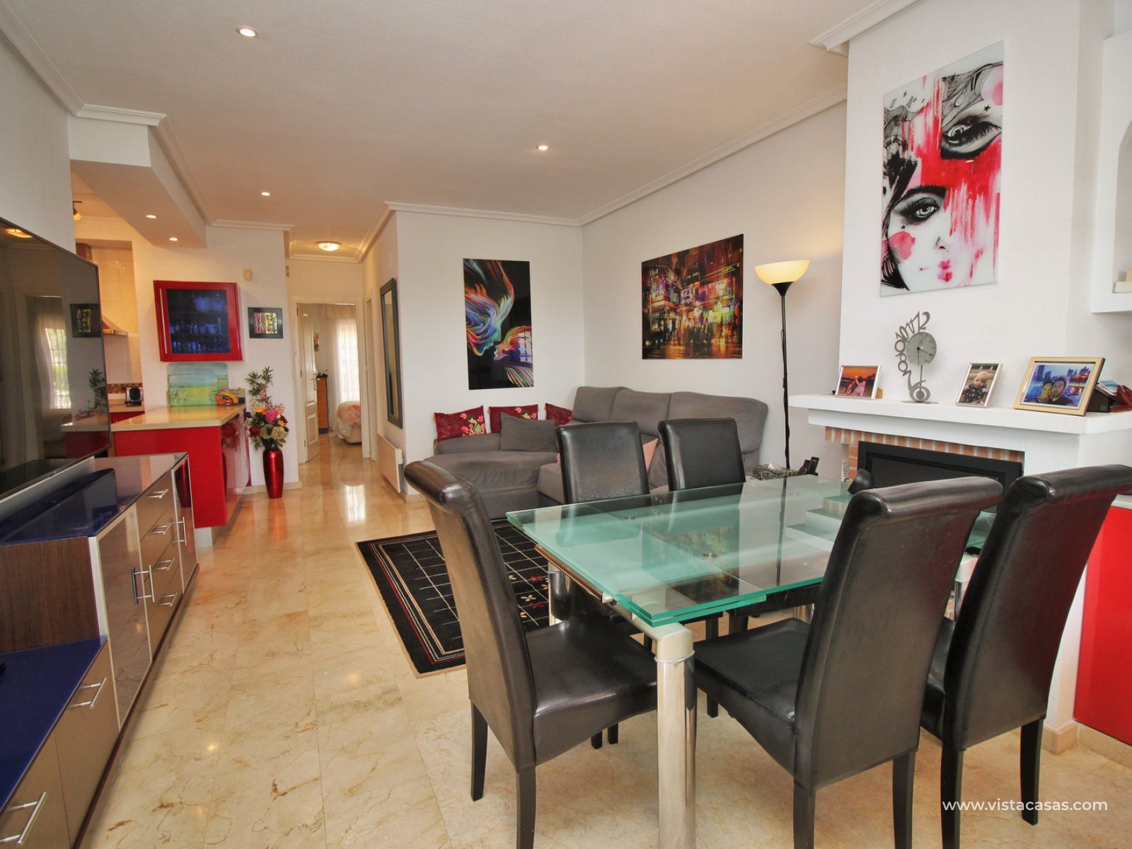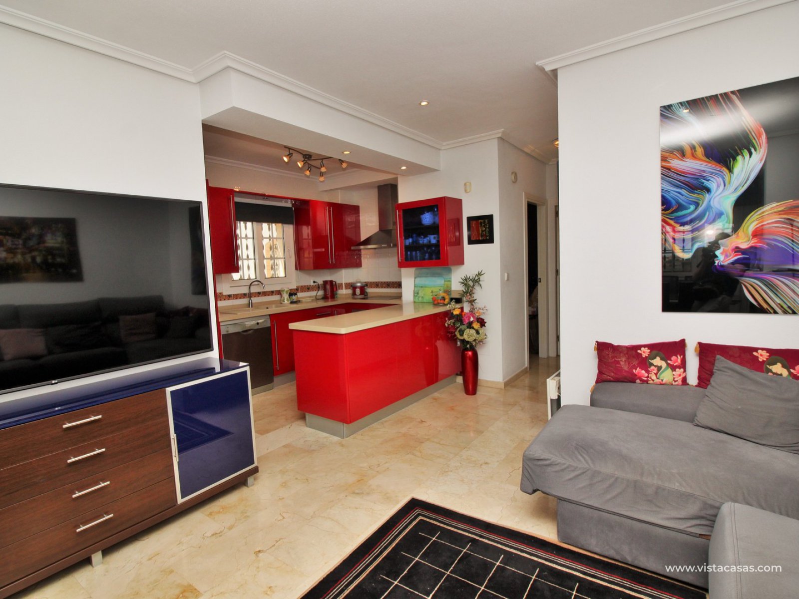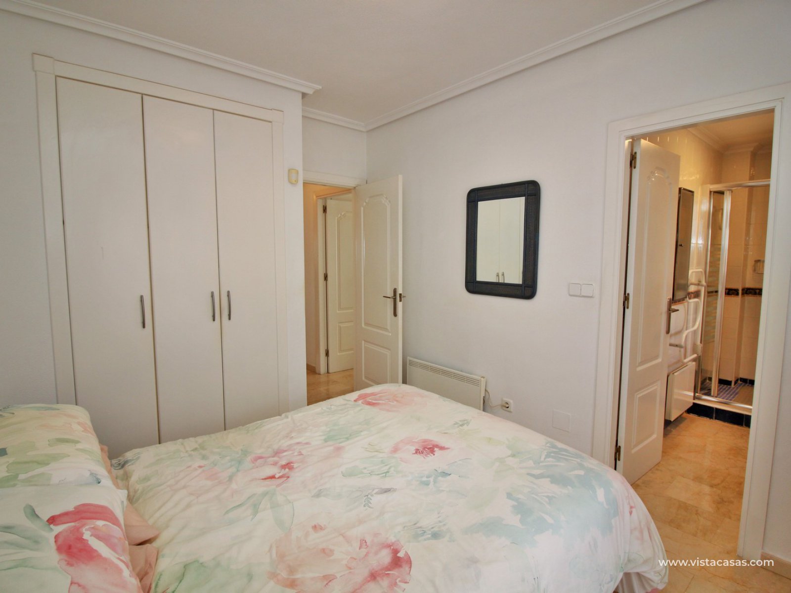 LOCATION, LOCATION! Fantastic 2 bedroom ground floor apartment with sea views for sale in the highly sought-after area of Las Violetas in R4, Villamartin. This beautiful property has great outdoor space including a good sized tiled garden, and a raised terrace with great sea views. Comprising of a bright lounge-dining area with feature fireplace, open kitchen with utility area, 2 bedrooms with fitted wardrobes and a family bathroom with walk-in shower. The master bedroom benefits from an en-suite bathroom. Part of a well kept community with a lovely communal pool and chill out areas. Sold furnished with air-conditioning.