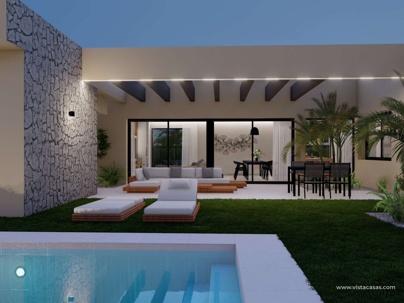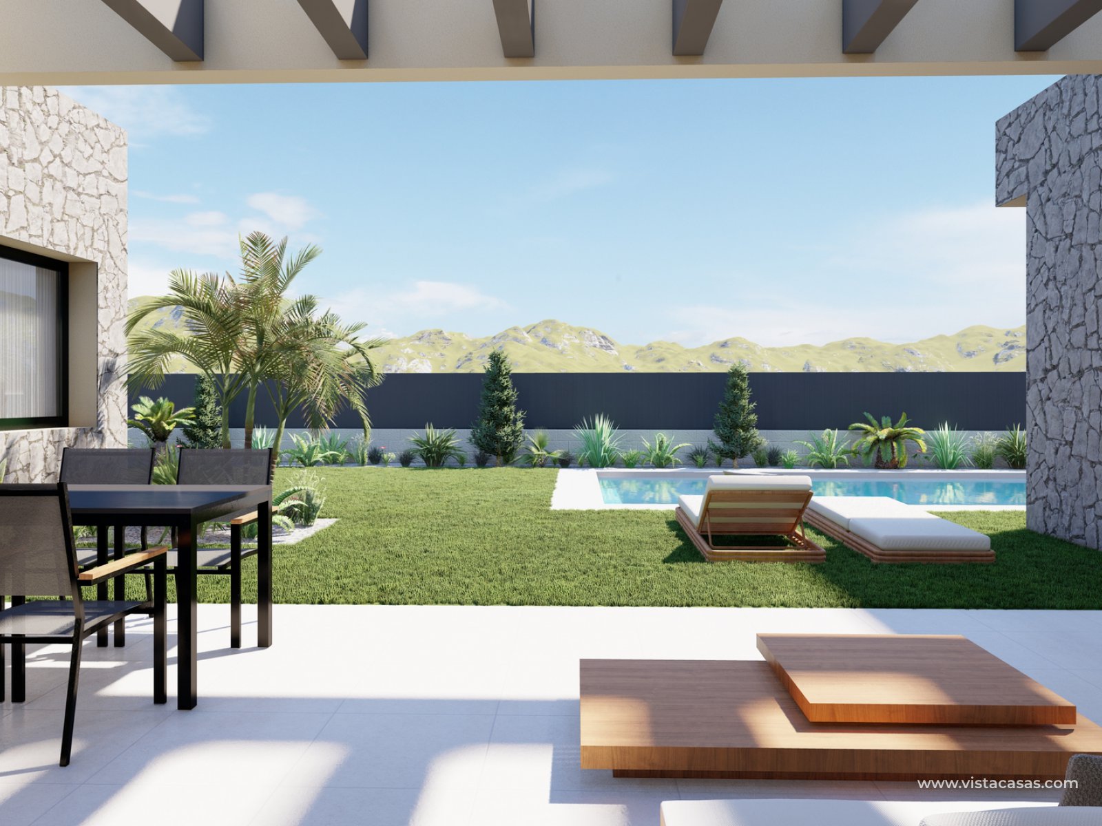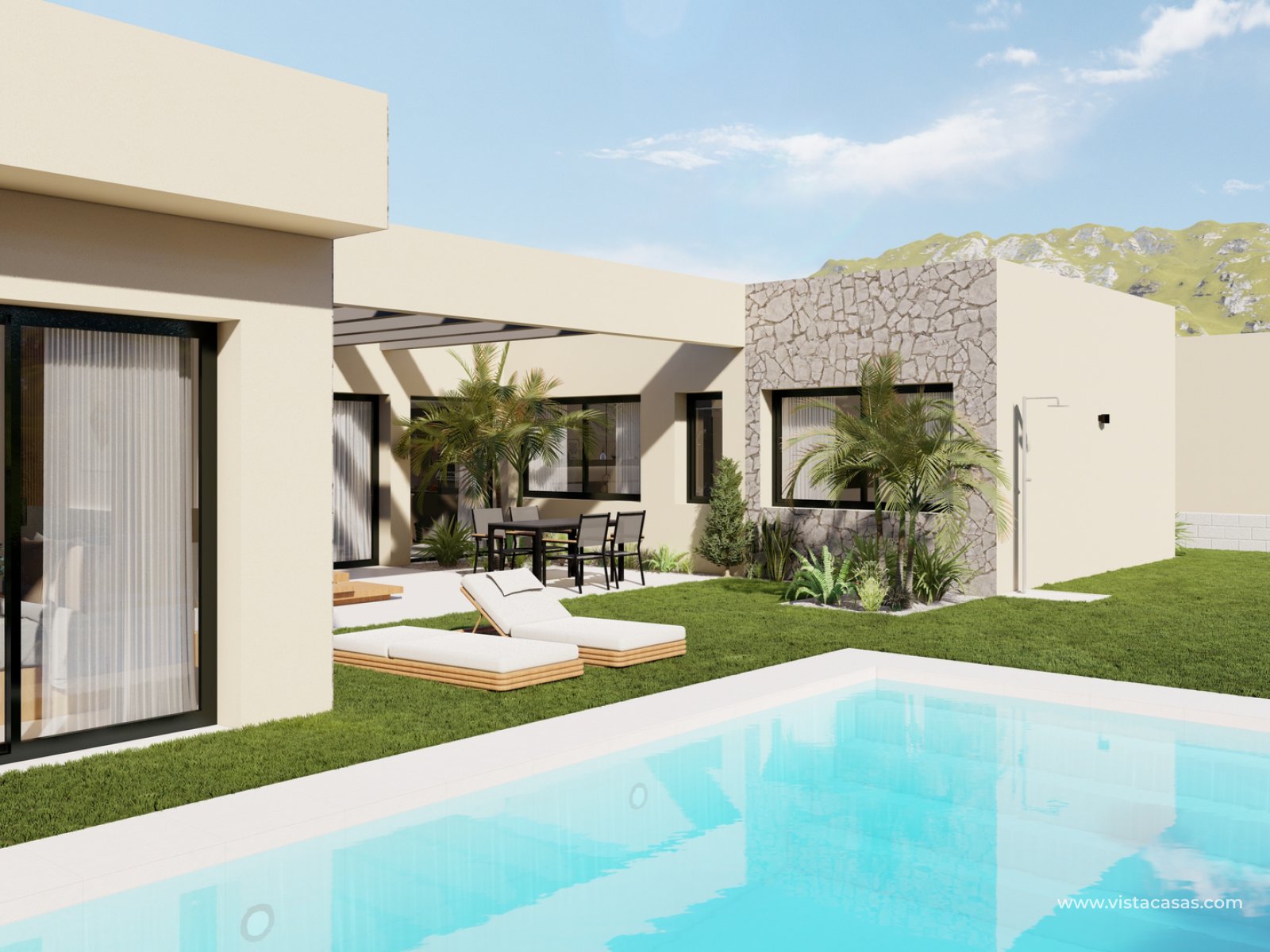 The villas are single level and have a spacious living area,  lounge/dining area and fully equipped kitchen, 4 bedrooms and 4 bathrooms, an 8x4 metre pool and spacious plot with private parking.