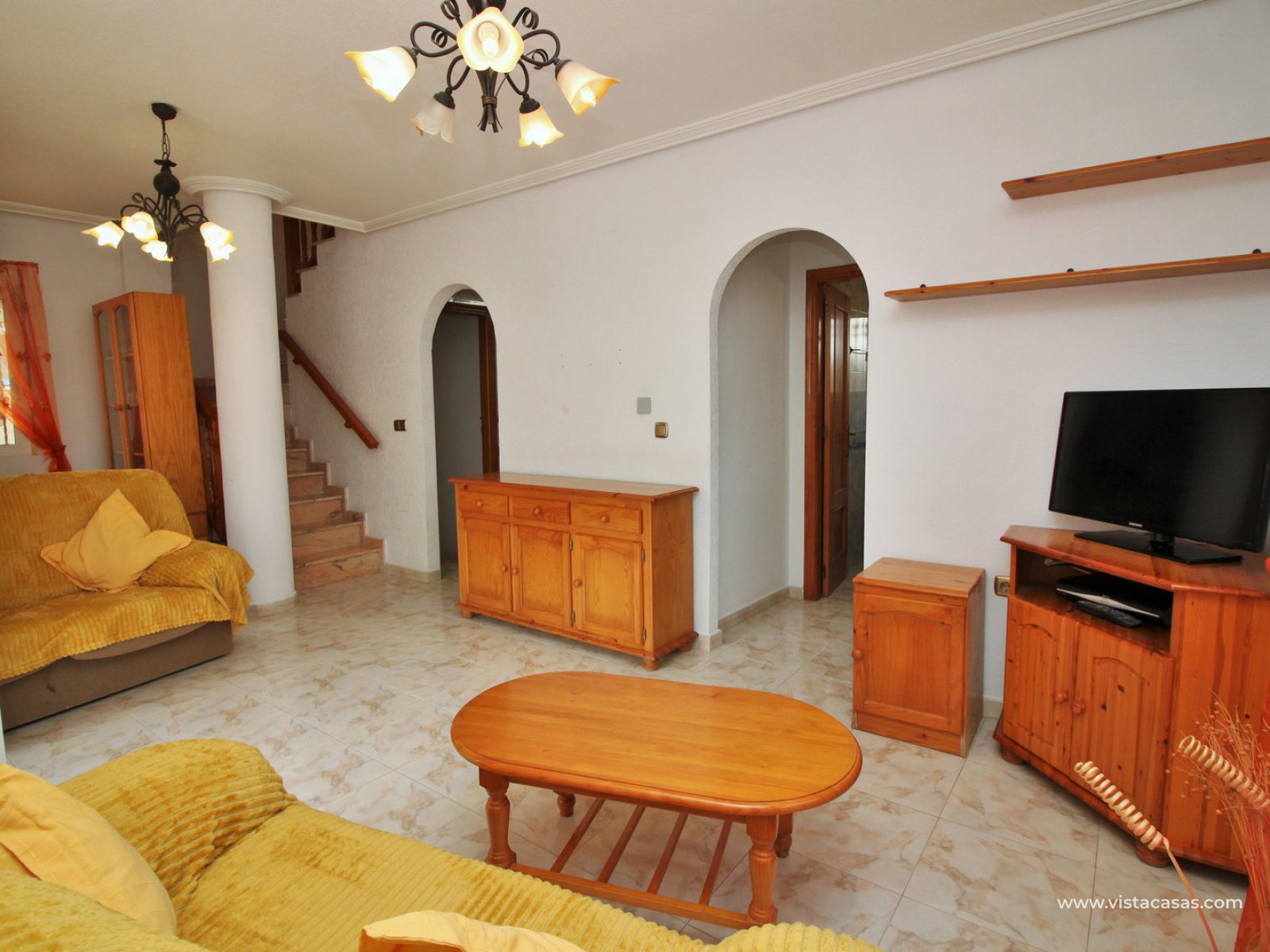 The living accommodation is divided into 3 levels with the ground floor comprising of a bright and spacious lounge-dining area, separate kitchen, double bedroom with fitted wardrobes and a bathroom with walk-in shower. Upstairs there are 2 double bedrooms with fitted wardrobes and a large family bathroom. The master bedroom also offers a private balcony. Internal stairs from the landing leads to the sunny roof solarium which offers lovely views of the sea and a glimpse of the Villamartin golf course. The garage is accessible via the kitchen and offers a good space for storage, plus an additional bathroom with walk-in shower. The villa has lots of outdoor space, with massive potential, and is for sale furnished as seen with air-conditioning. Part of a community with use of a communal pool just nearby.
