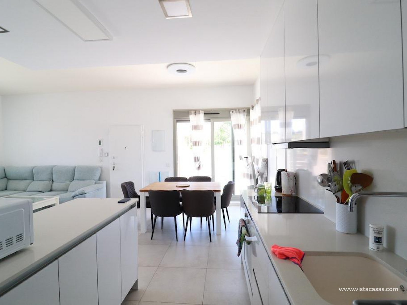 Residencial Vistabella, San Miguel de Salinas, corner villa with views of the sea and the salt lakes facing the park and facing South with a 405 m2 plot and a house on a 100 m2 floor with 3 bedrooms, 2 bathrooms, kitchen with its island open to the living room, gallery and a garage with direct access to the 153 m2 house, the house has a 60 m2 solarium, private pool and is sold furnished and with air conditioning.