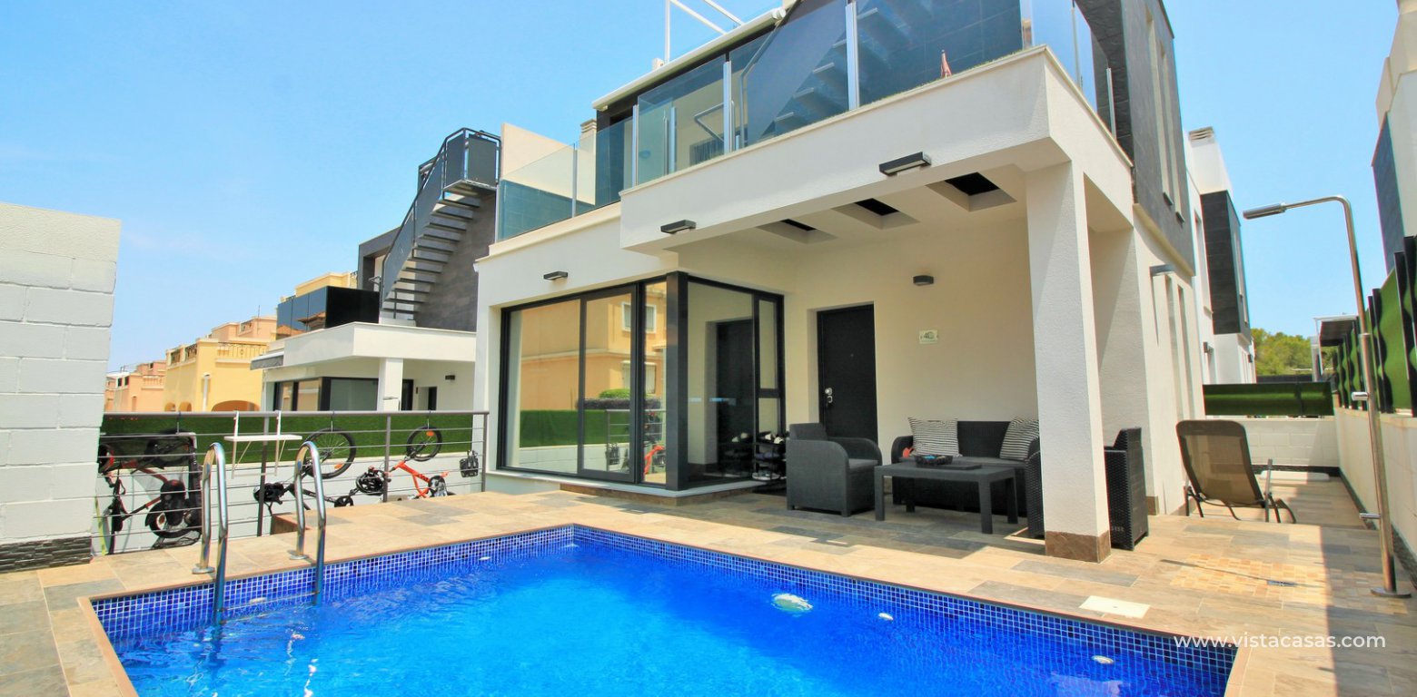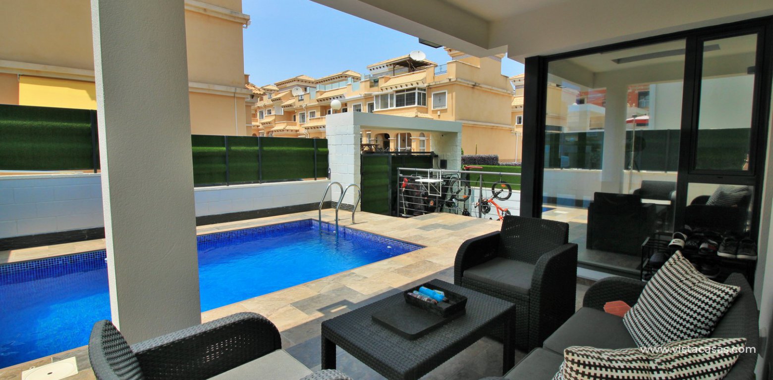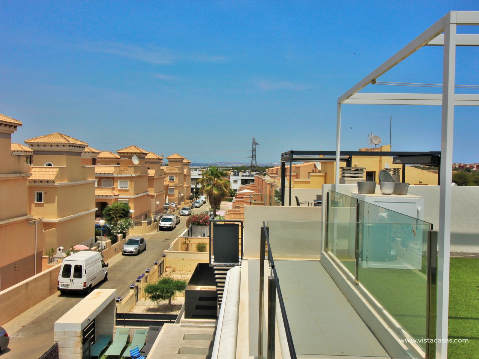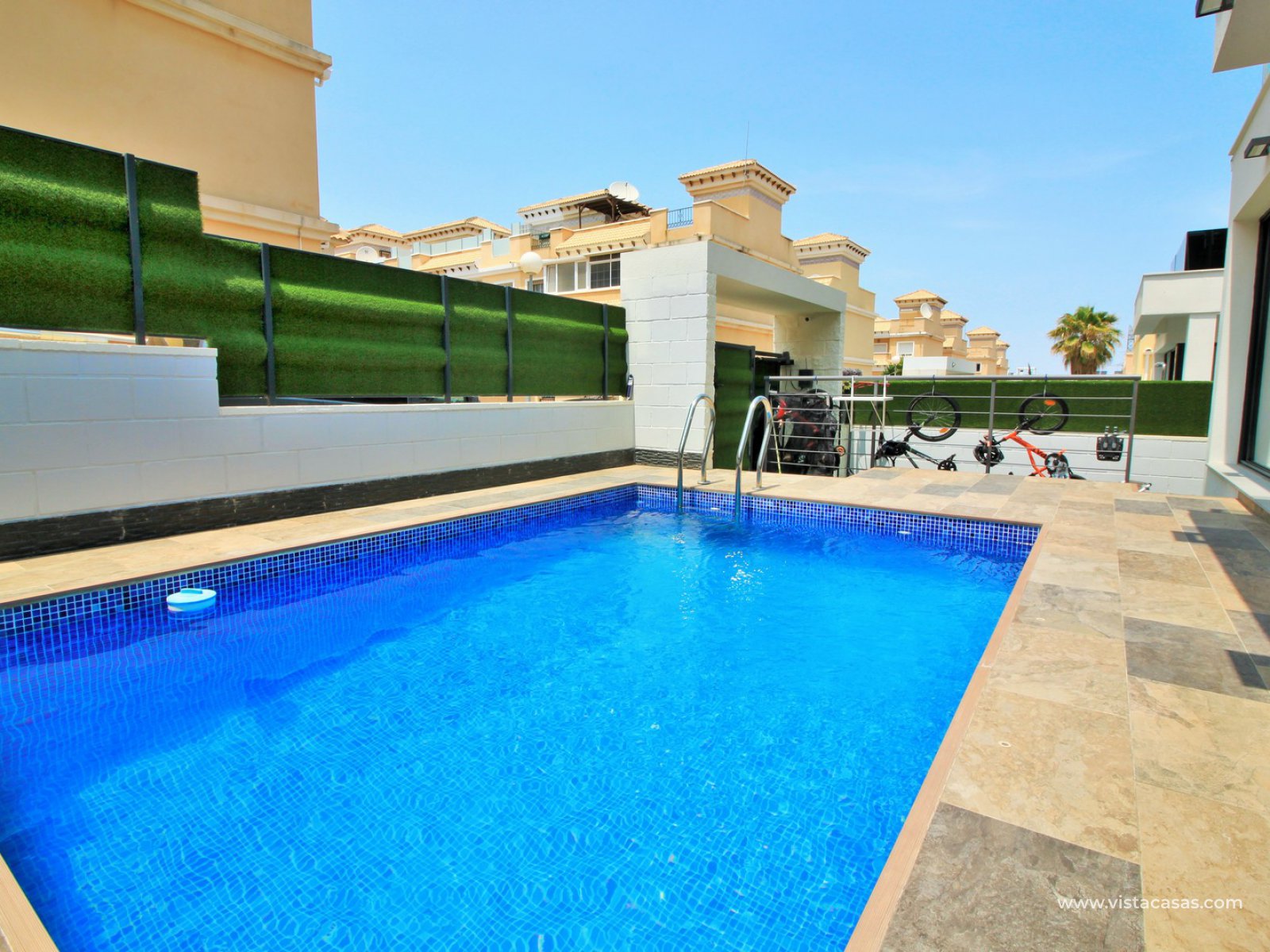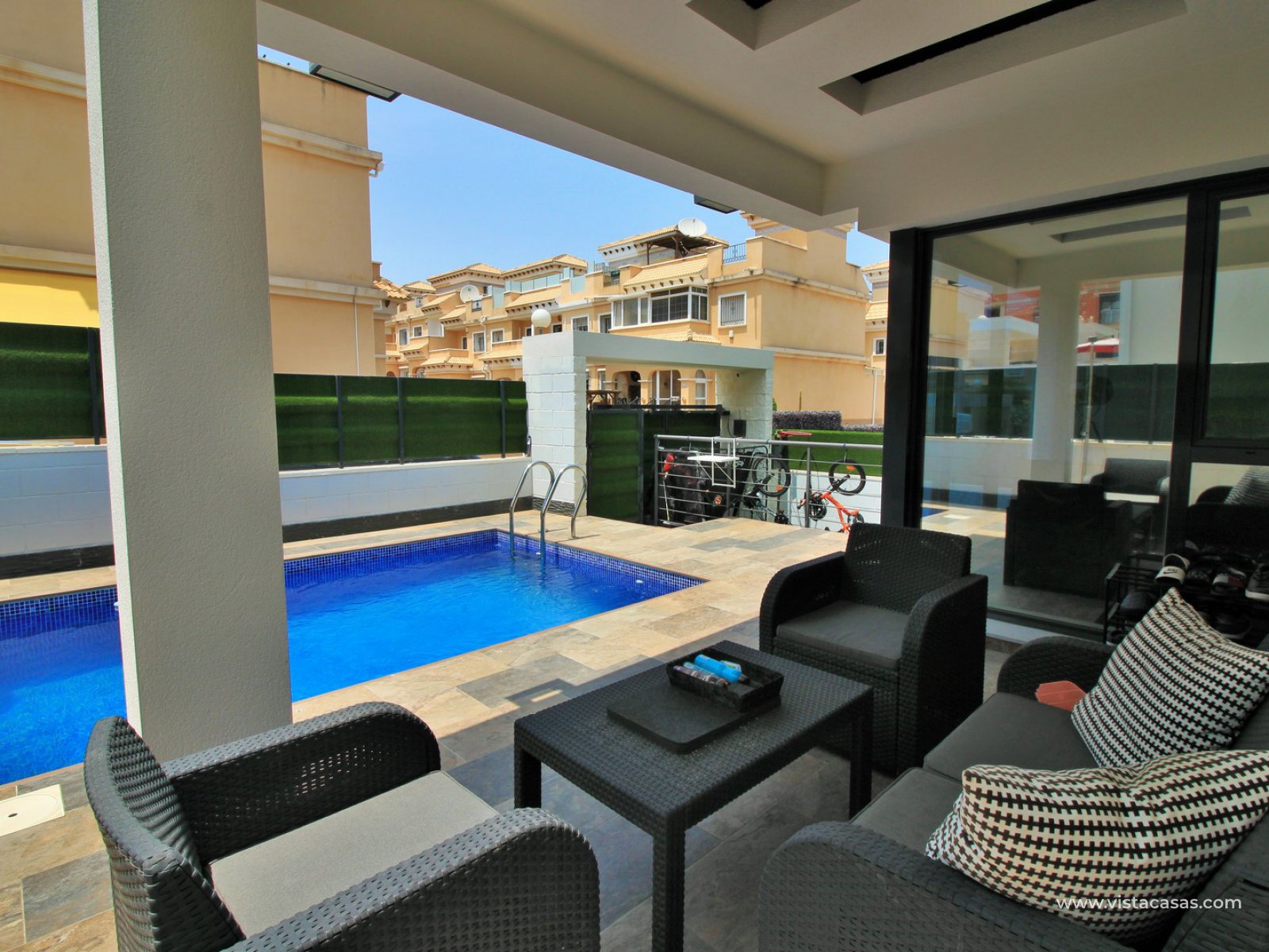 The living accommodation is divided over 3 levels with the ground floor comprising of a lounge area with large picture windows, breakfast bar area, a modern fully fitted kitchen with built-in appliances to the rear, 1 double bedroom with fitted wardrobes, and a bathroom with walk-in shower. On the upper level are a further 2 double bedrooms with fitted wardrobes and a family bathroom. The master bedroom offers a beautiful en-suite bathroom with walk-in shower, plus access to a West facing balcony, which is also accessible from the landing area. From the balcony, external stairs leads up to the large roof solarium with retractable awnings. From the solarium you can see the salt lakes of Torrevieja. The underbuild comprises of a a good sized lounge area, a large double bedroom with fitted wardrobes (currently used as a gym area) and a further single bedroom with fitted wardrobes (currently in use as an office space), and a bathroom with walk-in shower. Sold furnished with ducted air-conditioning throughout the property. Outside offers a lovely private swimming pool with front terrace area, to the back of the property is a storage/utility cupboard.