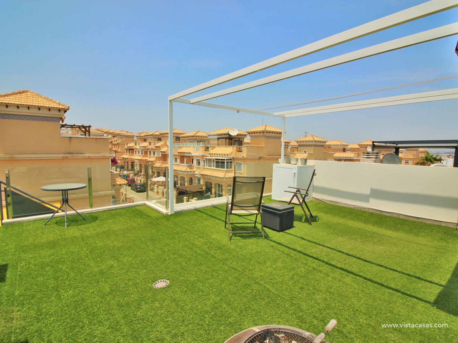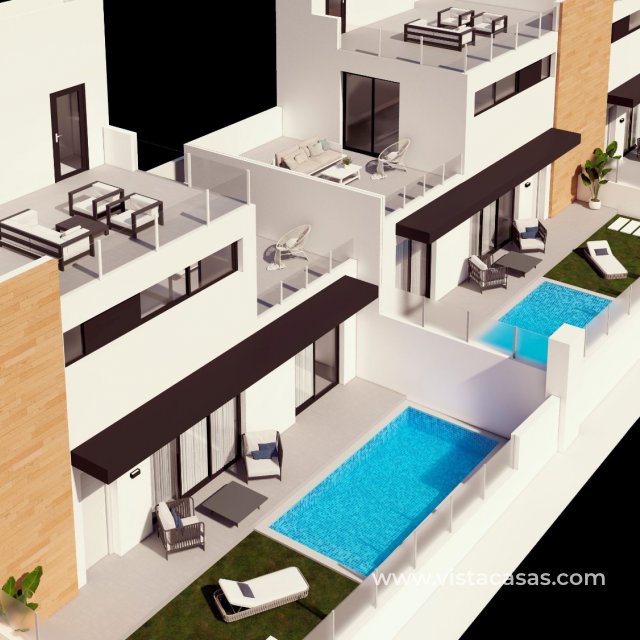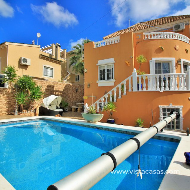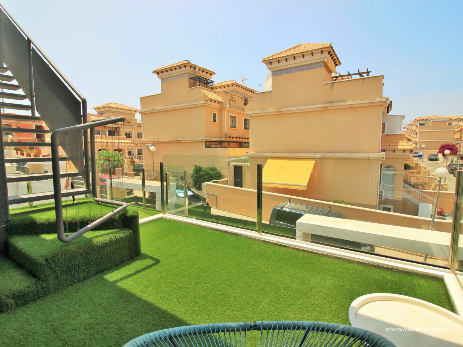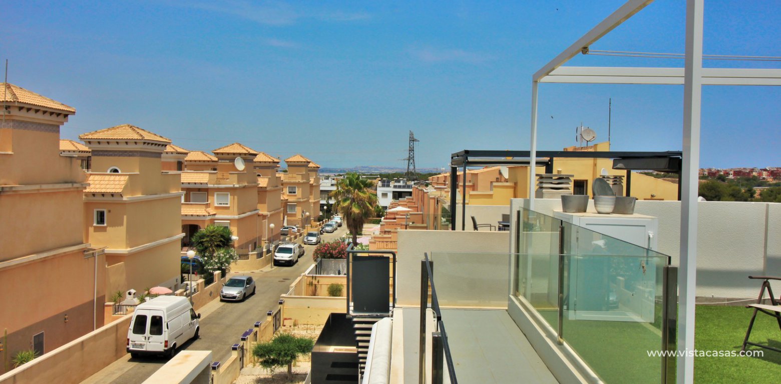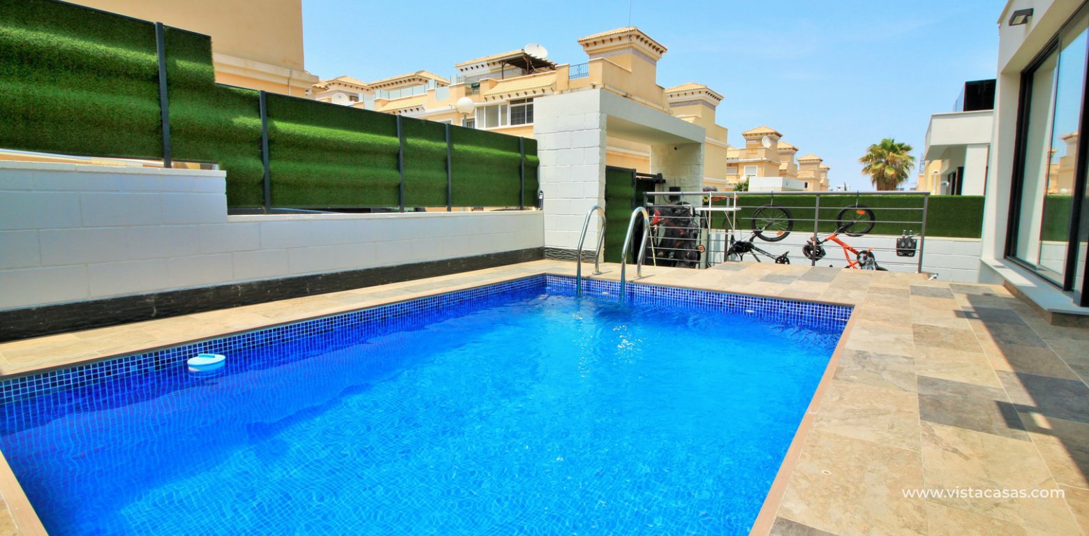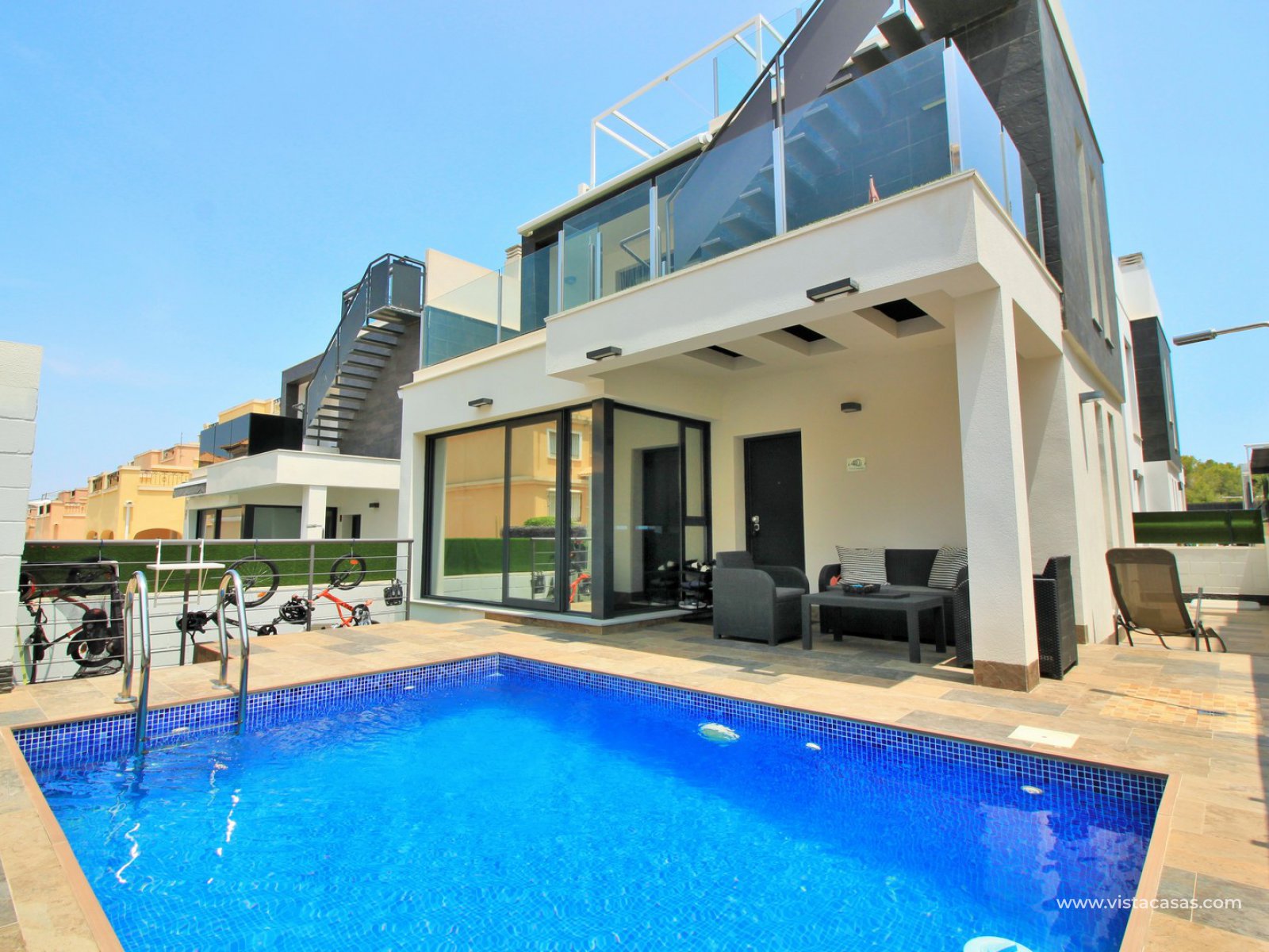 The living accommodation is divided over 3 levels with the ground floor comprising of a lounge area with large picture windows, breakfast bar area, a modern fully fitted kitchen with built-in appliances to the rear, 1 double bedroom with fitted wardrobes, and a bathroom with walk-in shower. On the upper level are a further 2 double bedrooms with fitted wardrobes and a family bathroom. The master bedroom offers a beautiful en-suite bathroom with walk-in shower, plus access to a West facing balcony, which is also accessible from the landing area. From the balcony, external stairs leads up to the large roof solarium with retractable awnings. From the solarium you can see the salt lakes of Torrevieja. The underbuild comprises of a a good sized lounge area, a large double bedroom with fitted wardrobes (currently used as a gym area) and a further single bedroom with fitted wardrobes (currently in use as an office space), and a bathroom with walk-in shower. Sold furnished with ducted air-conditioning throughout the property. Outside offers a lovely private swimming pool with front terrace area, to the back of the property is a storage/utility cupboard.