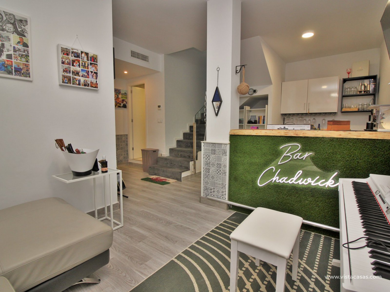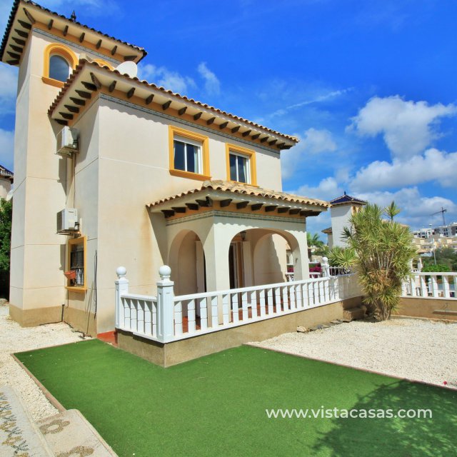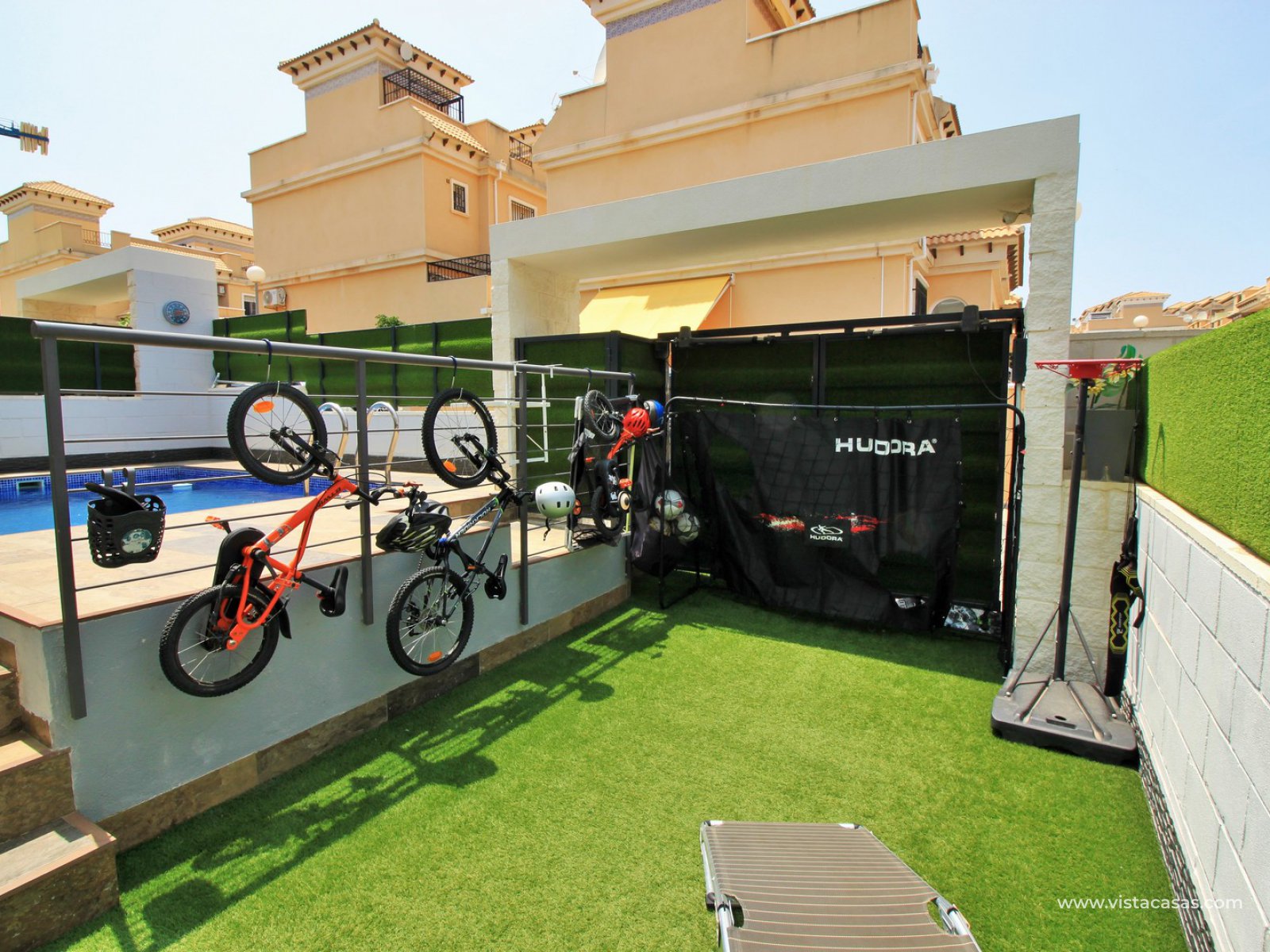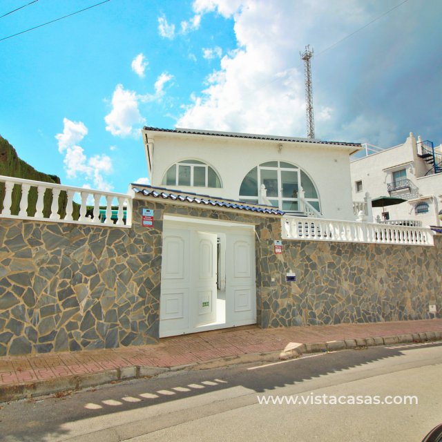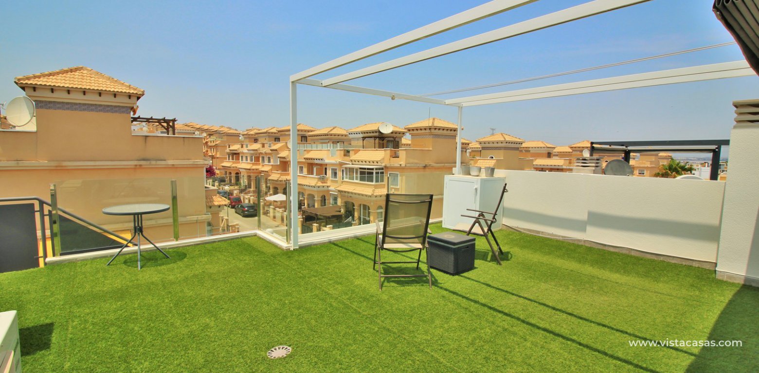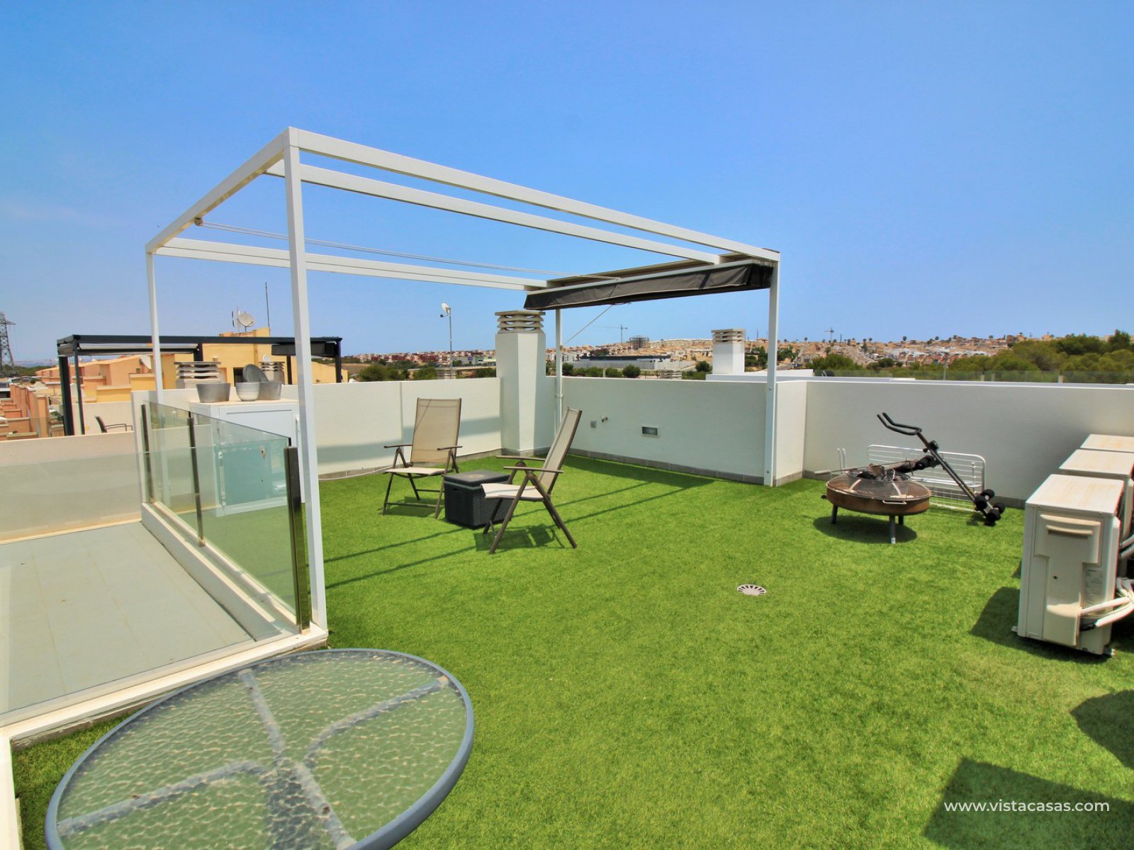 The living accommodation is divided over 3 levels with the ground floor comprising of a lounge area with large picture windows, breakfast bar area, a modern fully fitted kitchen with built-in appliances to the rear, 1 double bedroom with fitted wardrobes, and a bathroom with walk-in shower. On the upper level are a further 2 double bedrooms with fitted wardrobes and a family bathroom. The master bedroom offers a beautiful en-suite bathroom with walk-in shower, plus access to a West facing balcony, which is also accessible from the landing area. From the balcony, external stairs leads up to the large roof solarium with retractable awnings. From the solarium you can see the salt lakes of Torrevieja. The underbuild comprises of a a good sized lounge area, a large double bedroom with fitted wardrobes (currently used as a gym area) and a further single bedroom with fitted wardrobes (currently in use as an office space), and a bathroom with walk-in shower. Sold furnished with ducted air-conditioning throughout the property. Outside offers a lovely private swimming pool with front terrace area, to the back of the property is a storage/utility cupboard.