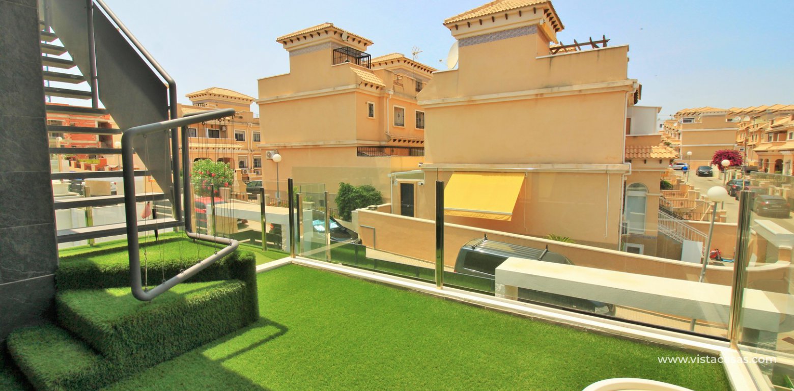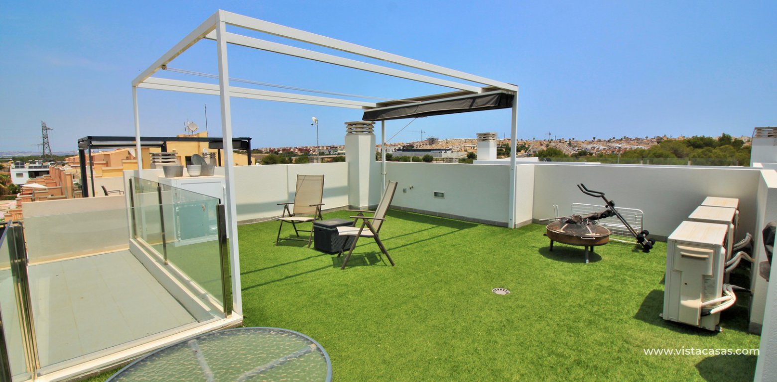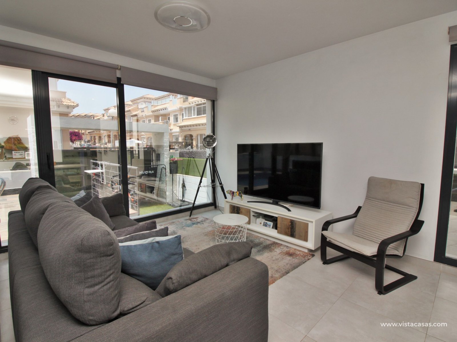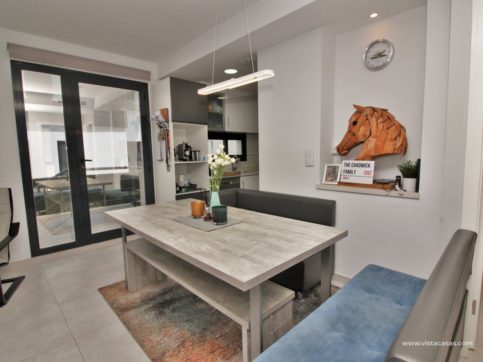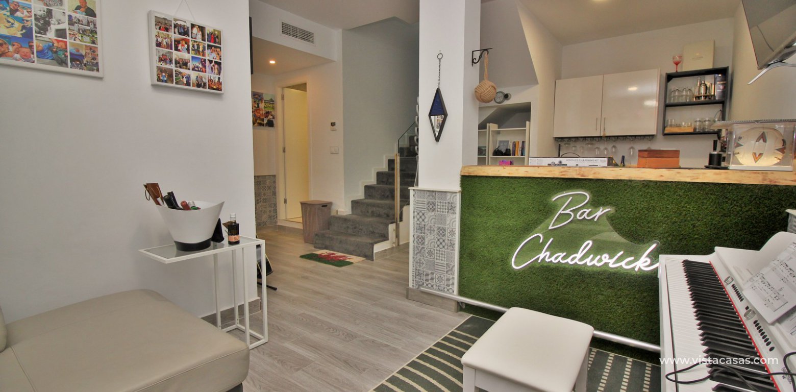 The living accommodation is divided over 3 levels with the ground floor comprising of a lounge area with large picture windows, breakfast bar area, a modern fully fitted kitchen with built-in appliances to the rear, 1 double bedroom with fitted wardrobes, and a bathroom with walk-in shower. On the upper level are a further 2 double bedrooms with fitted wardrobes and a family bathroom. The master bedroom offers a beautiful en-suite bathroom with walk-in shower, plus access to a West facing balcony, which is also accessible from the landing area. From the balcony, external stairs leads up to the large roof solarium with retractable awnings. From the solarium you can see the salt lakes of Torrevieja. The underbuild comprises of a a good sized lounge area, a large double bedroom with fitted wardrobes (currently used as a gym area) and a further single bedroom with fitted wardrobes (currently in use as an office space), and a bathroom with walk-in shower. Sold furnished with ducted air-conditioning throughout the property. Outside offers a lovely private swimming pool with front terrace area, to the back of the property is a storage/utility cupboard.