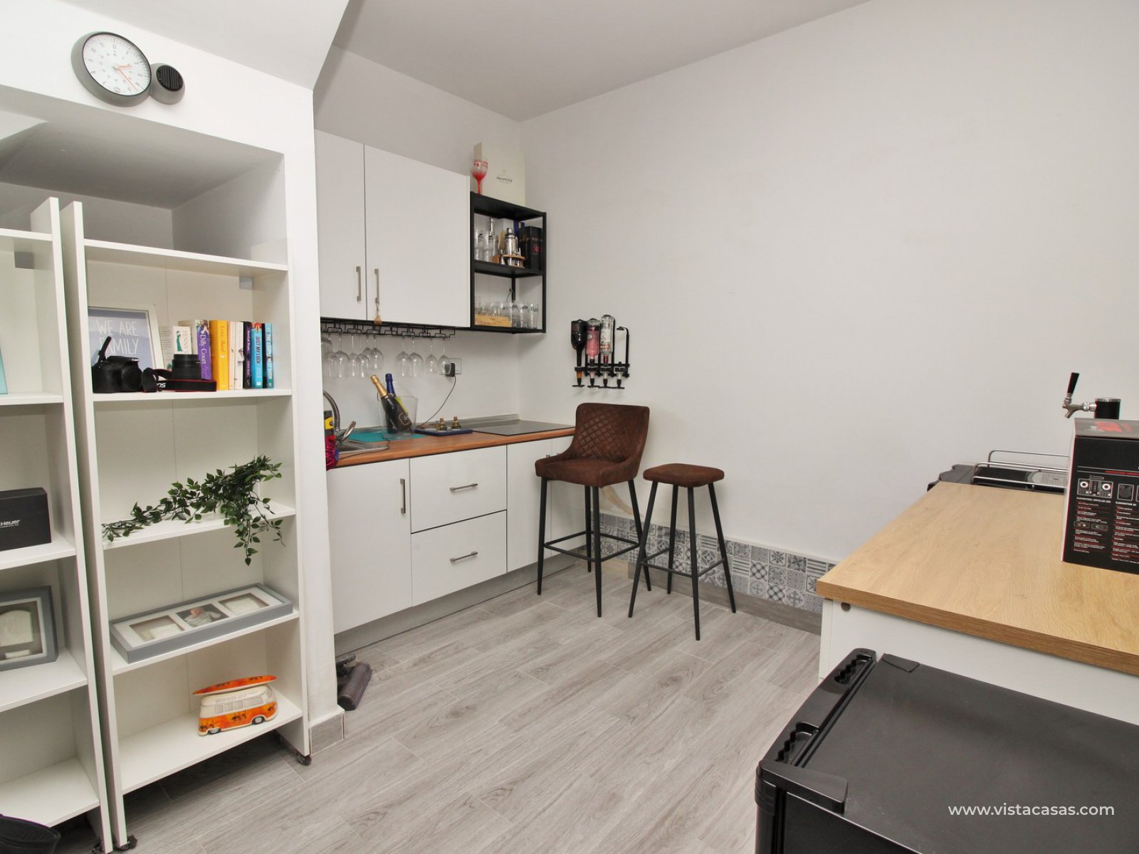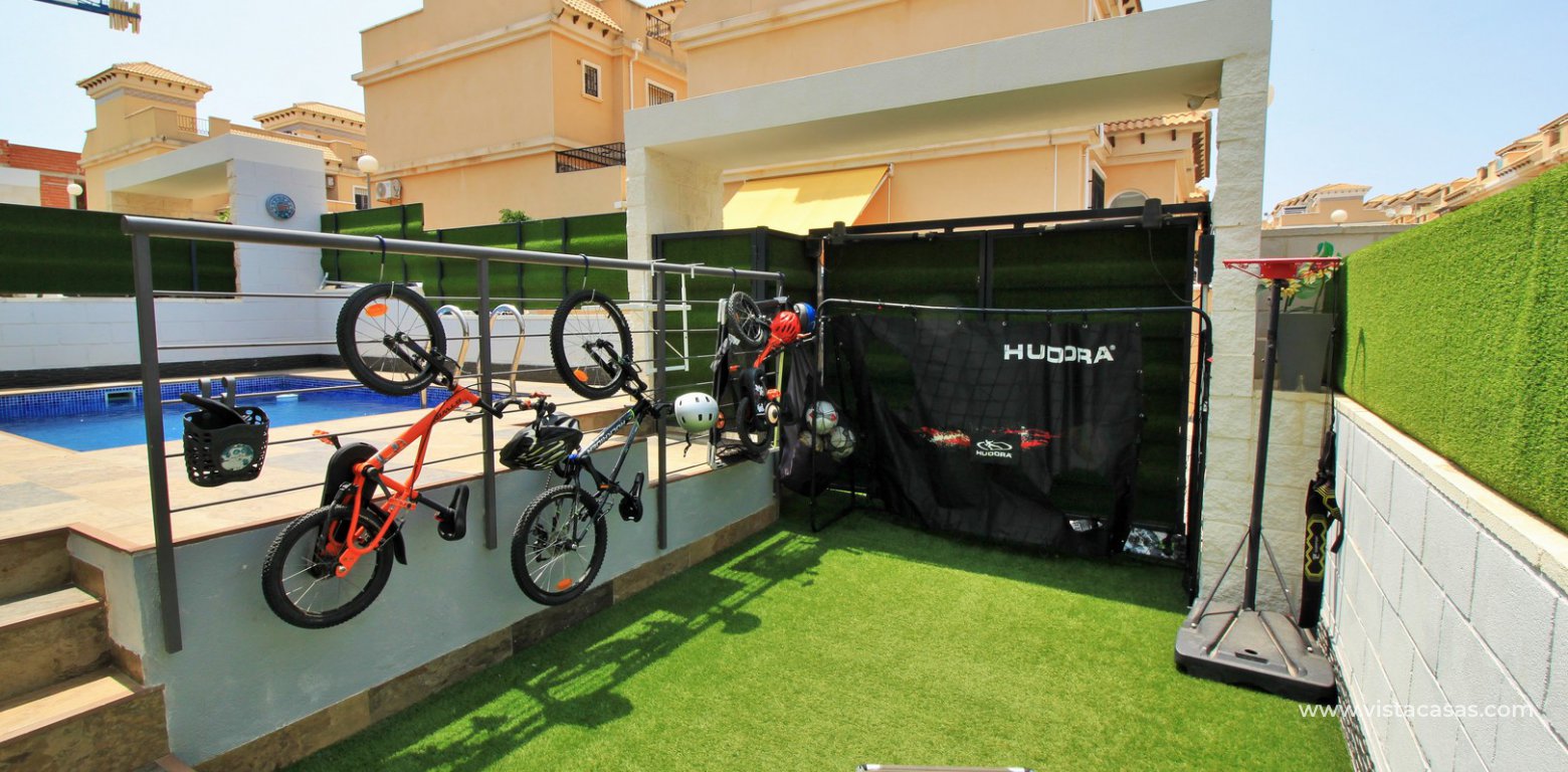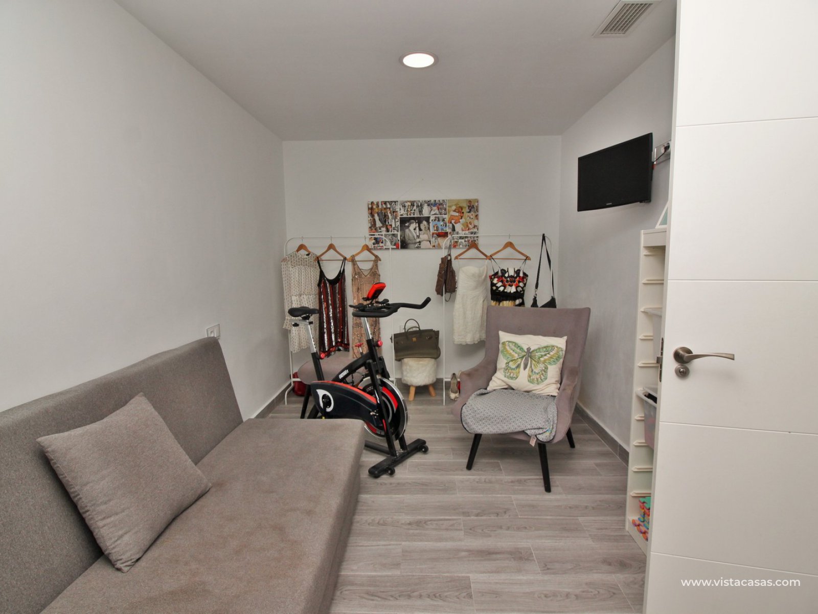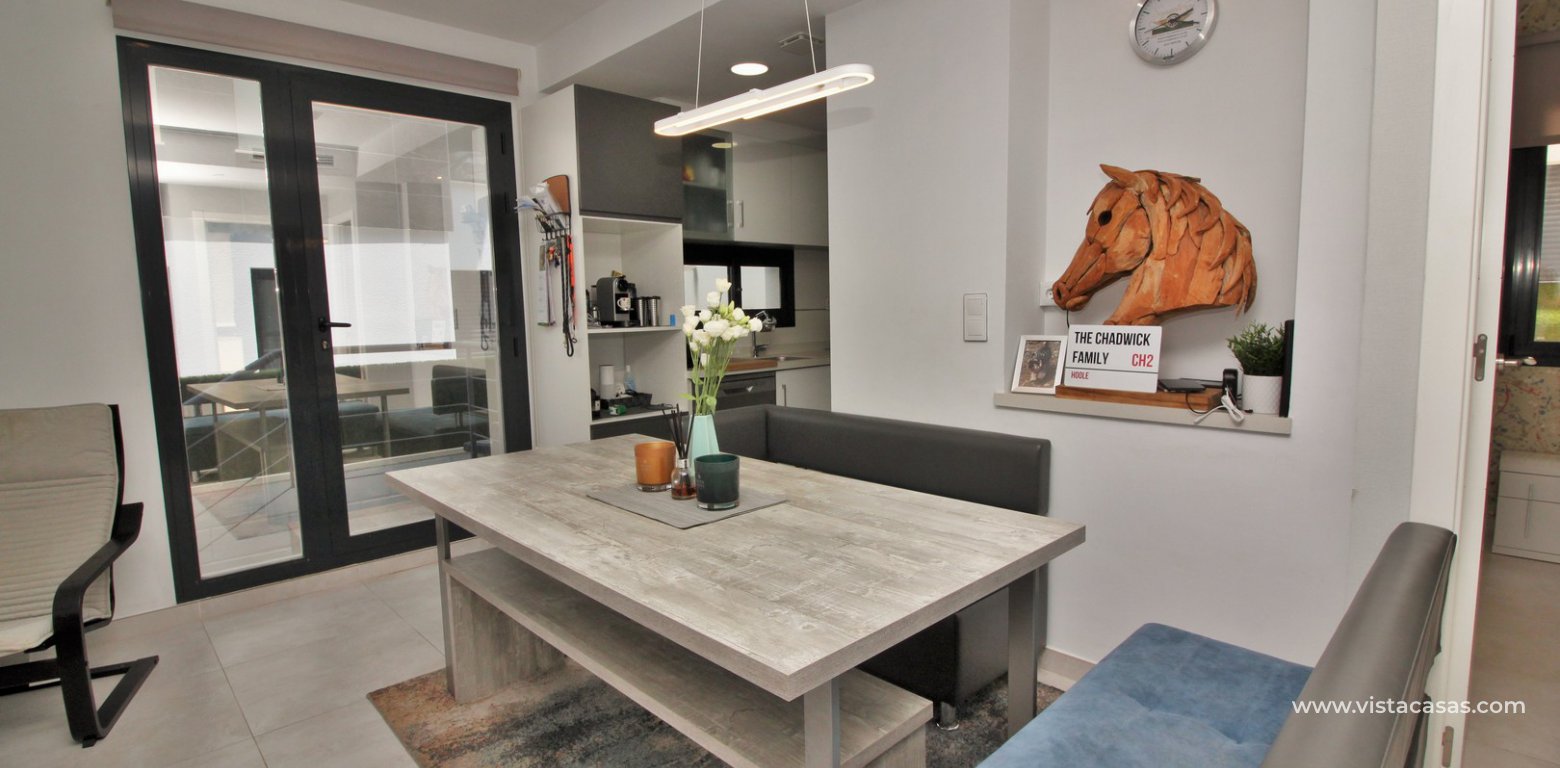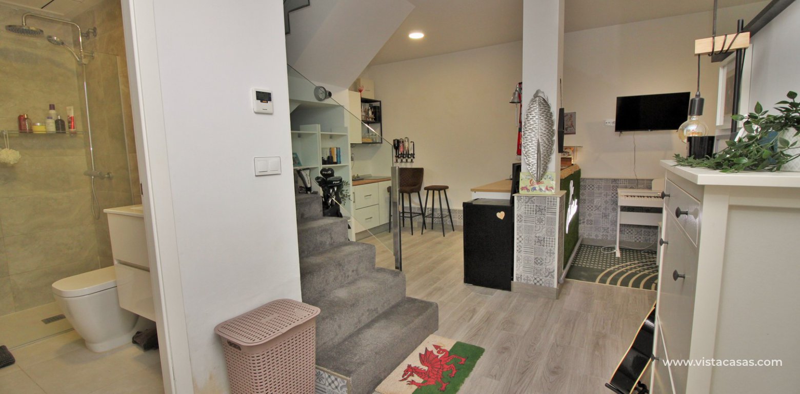 The living accommodation is divided over 3 levels with the ground floor comprising of a lounge area with large picture windows, breakfast bar area, a modern fully fitted kitchen with built-in appliances to the rear, 1 double bedroom with fitted wardrobes, and a bathroom with walk-in shower. On the upper level are a further 2 double bedrooms with fitted wardrobes and a family bathroom. The master bedroom offers a beautiful en-suite bathroom with walk-in shower, plus access to a West facing balcony, which is also accessible from the landing area. From the balcony, external stairs leads up to the large roof solarium with retractable awnings. From the solarium you can see the salt lakes of Torrevieja. The underbuild comprises of a a good sized lounge area, a large double bedroom with fitted wardrobes (currently used as a gym area) and a further single bedroom with fitted wardrobes (currently in use as an office space), and a bathroom with walk-in shower. Sold furnished with ducted air-conditioning throughout the property. Outside offers a lovely private swimming pool with front terrace area, to the back of the property is a storage/utility cupboard.