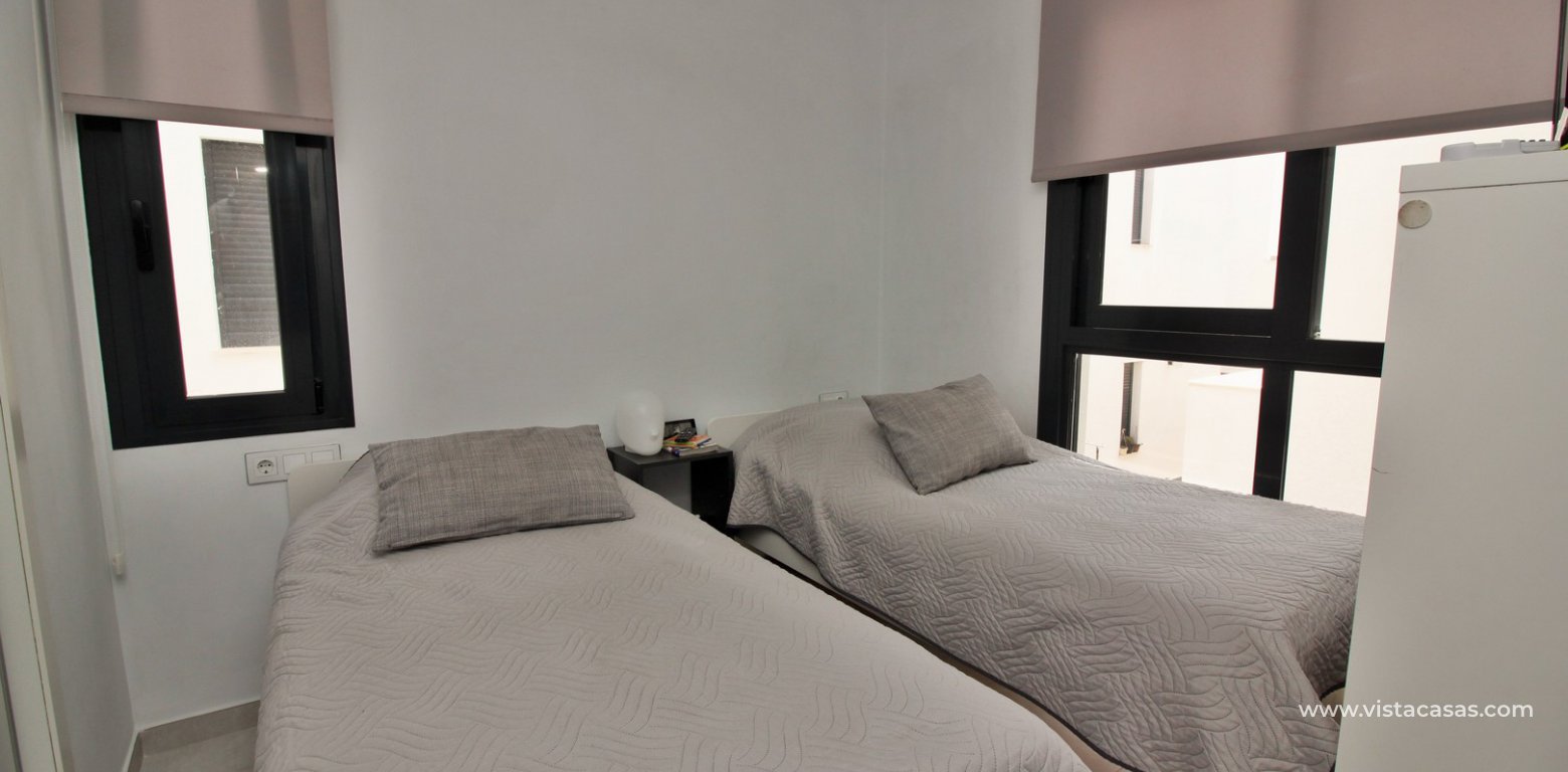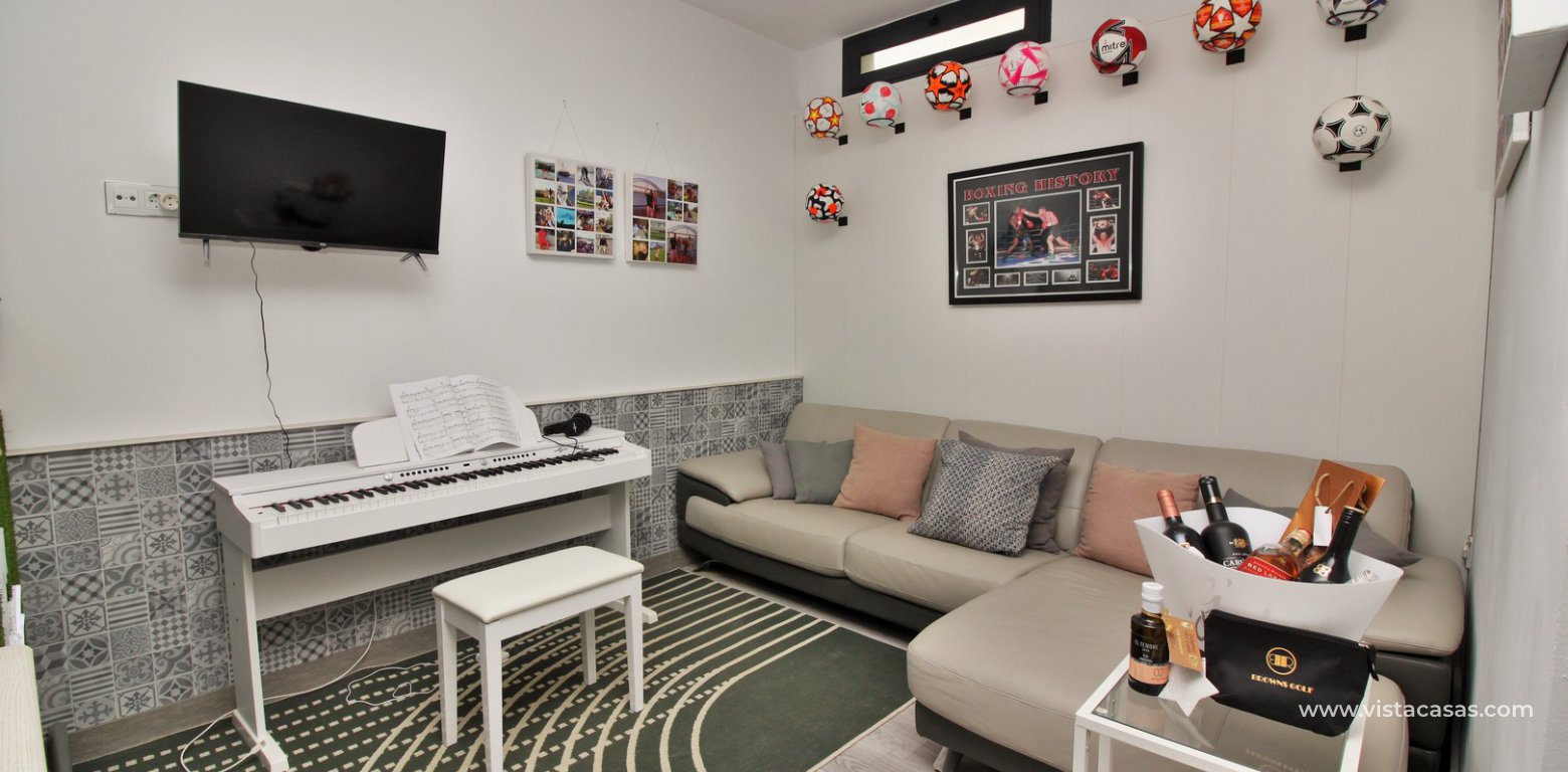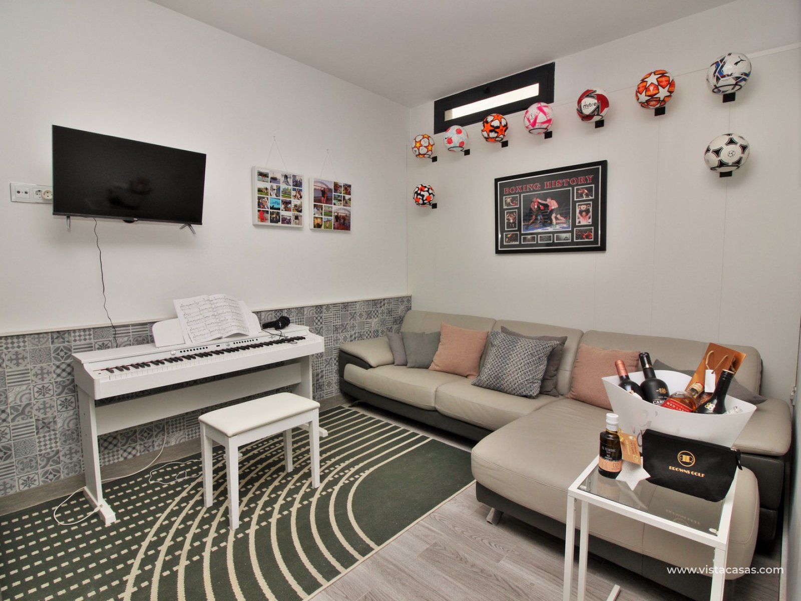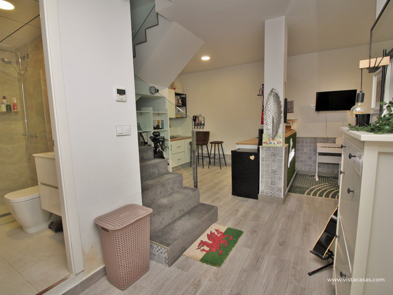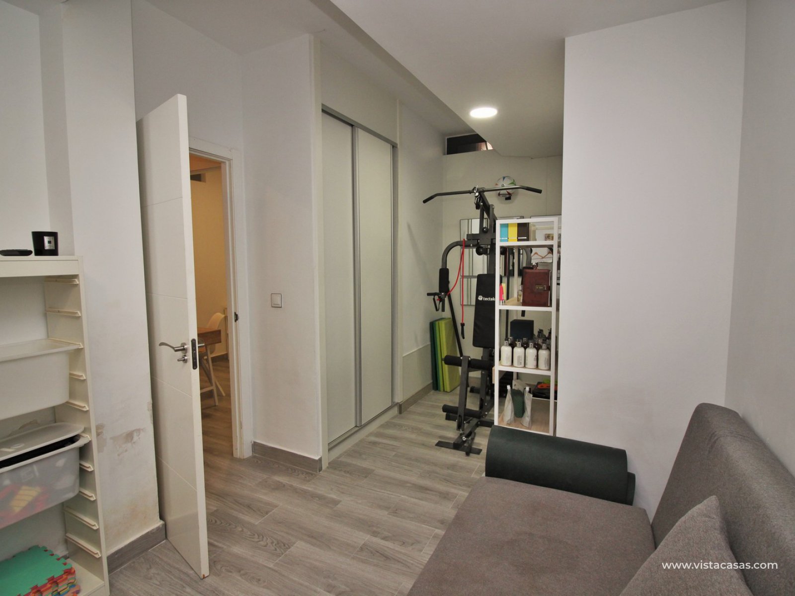 The living accommodation is divided over 3 levels with the ground floor comprising of a lounge area with large picture windows, breakfast bar area, a modern fully fitted kitchen with built-in appliances to the rear, 1 double bedroom with fitted wardrobes, and a bathroom with walk-in shower. On the upper level are a further 2 double bedrooms with fitted wardrobes and a family bathroom. The master bedroom offers a beautiful en-suite bathroom with walk-in shower, plus access to a West facing balcony, which is also accessible from the landing area. From the balcony, external stairs leads up to the large roof solarium with retractable awnings. From the solarium you can see the salt lakes of Torrevieja. The underbuild comprises of a a good sized lounge area, a large double bedroom with fitted wardrobes (currently used as a gym area) and a further single bedroom with fitted wardrobes (currently in use as an office space), and a bathroom with walk-in shower. Sold furnished with ducted air-conditioning throughout the property. Outside offers a lovely private swimming pool with front terrace area, to the back of the property is a storage/utility cupboard.