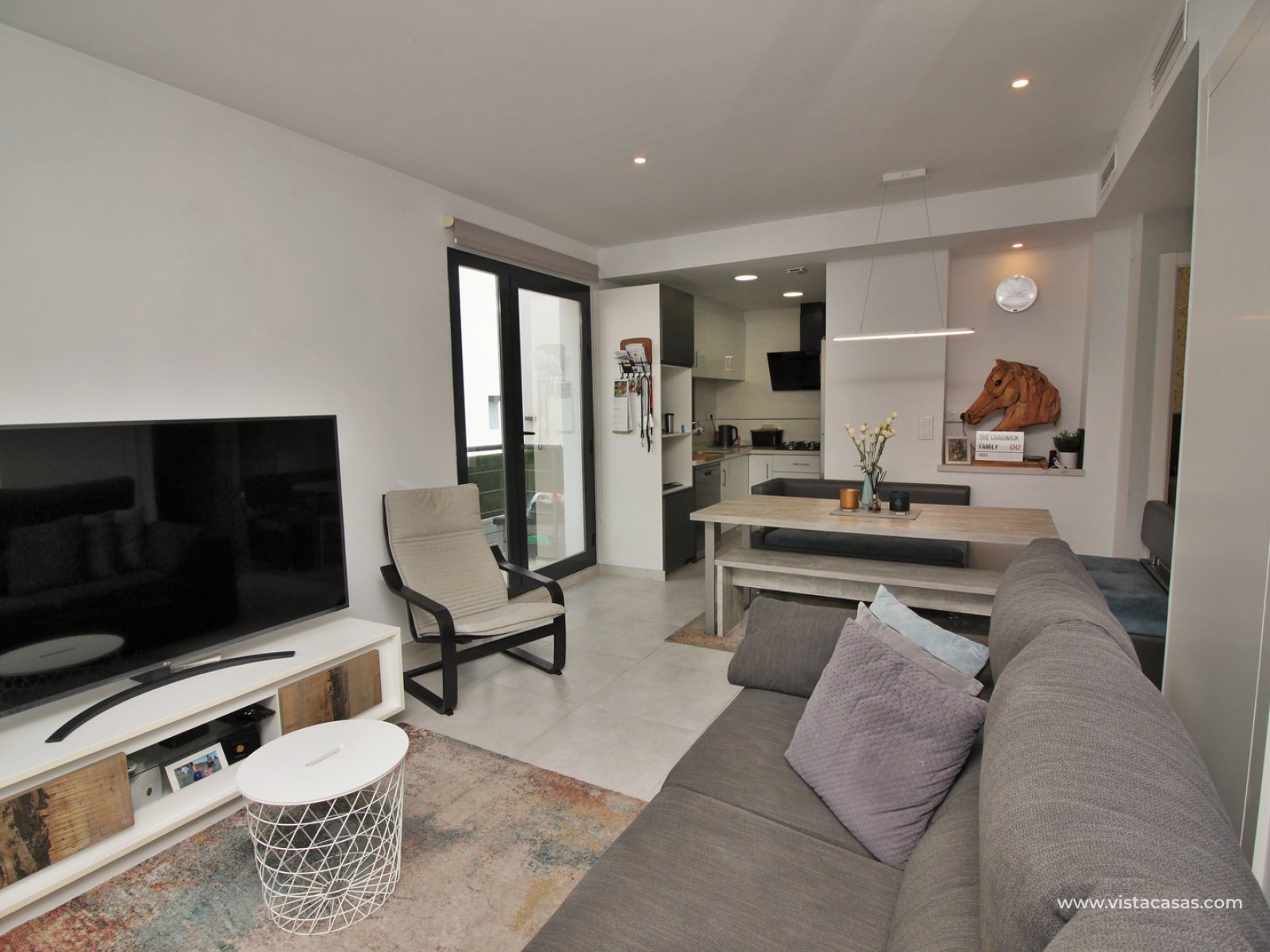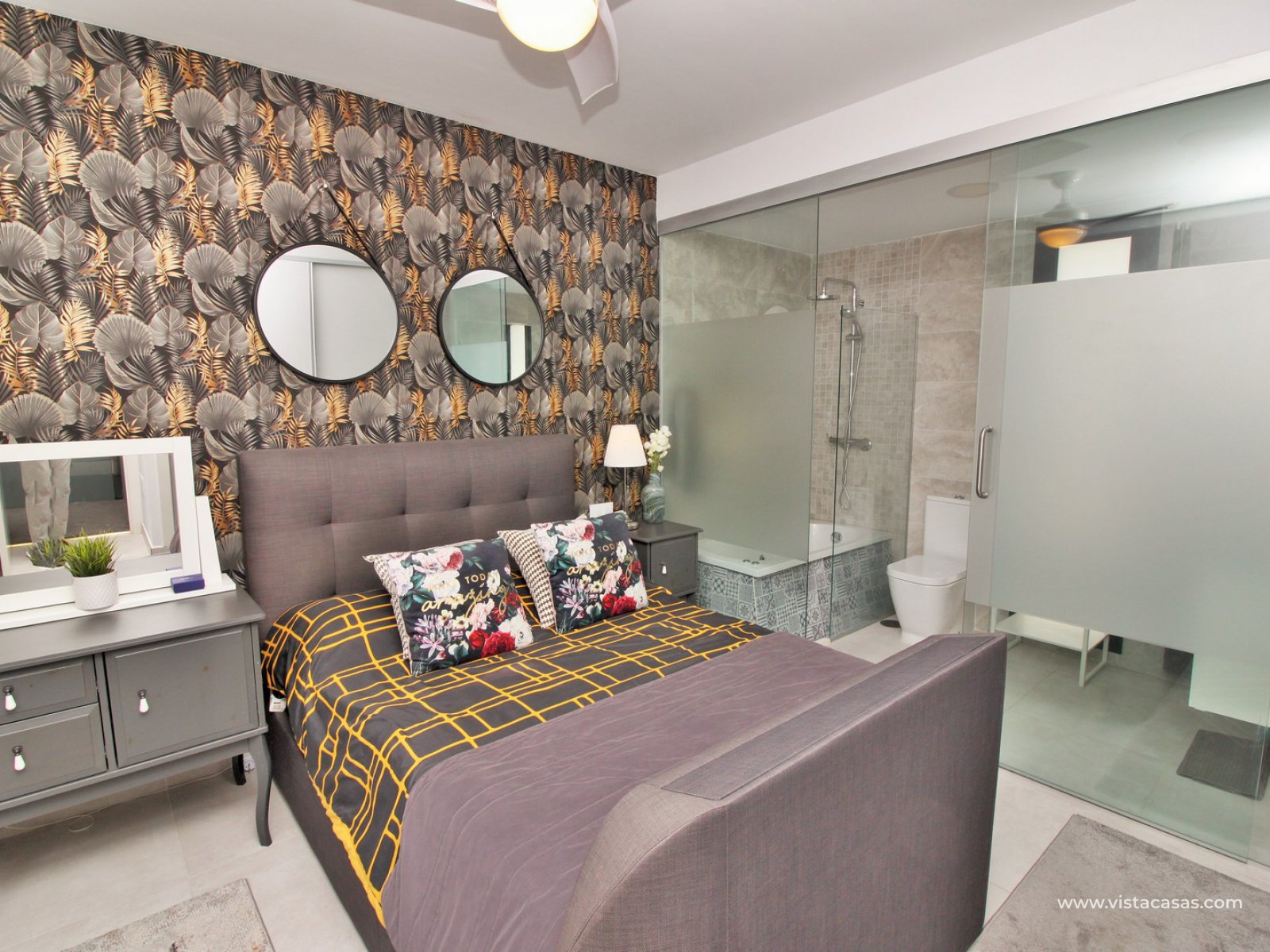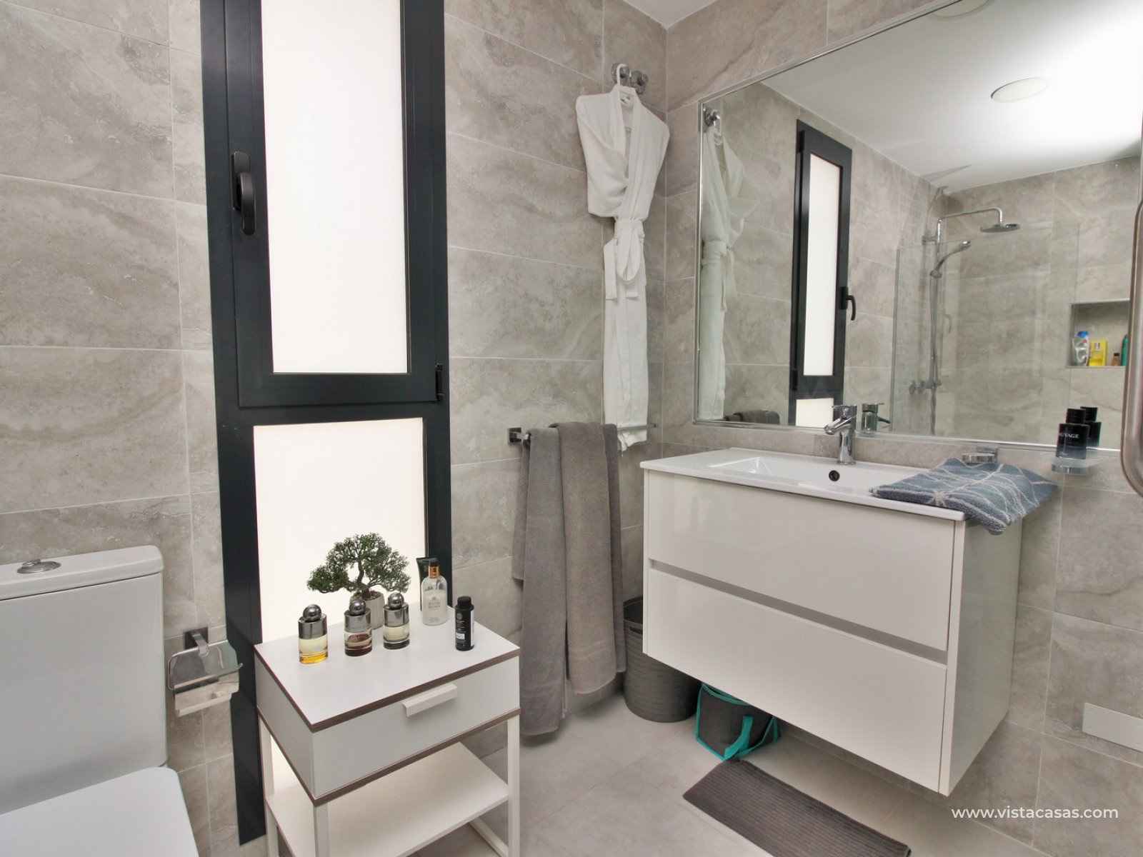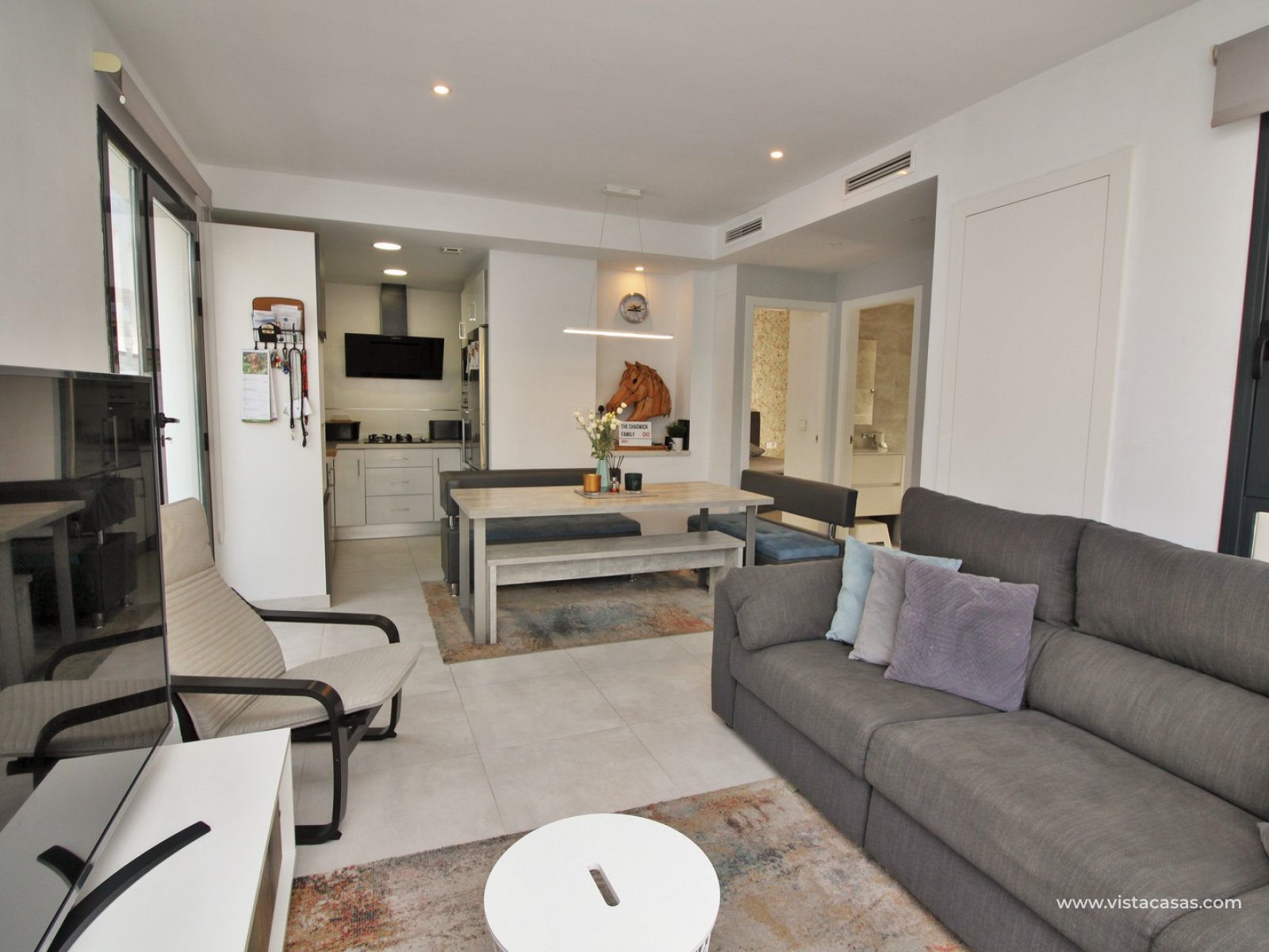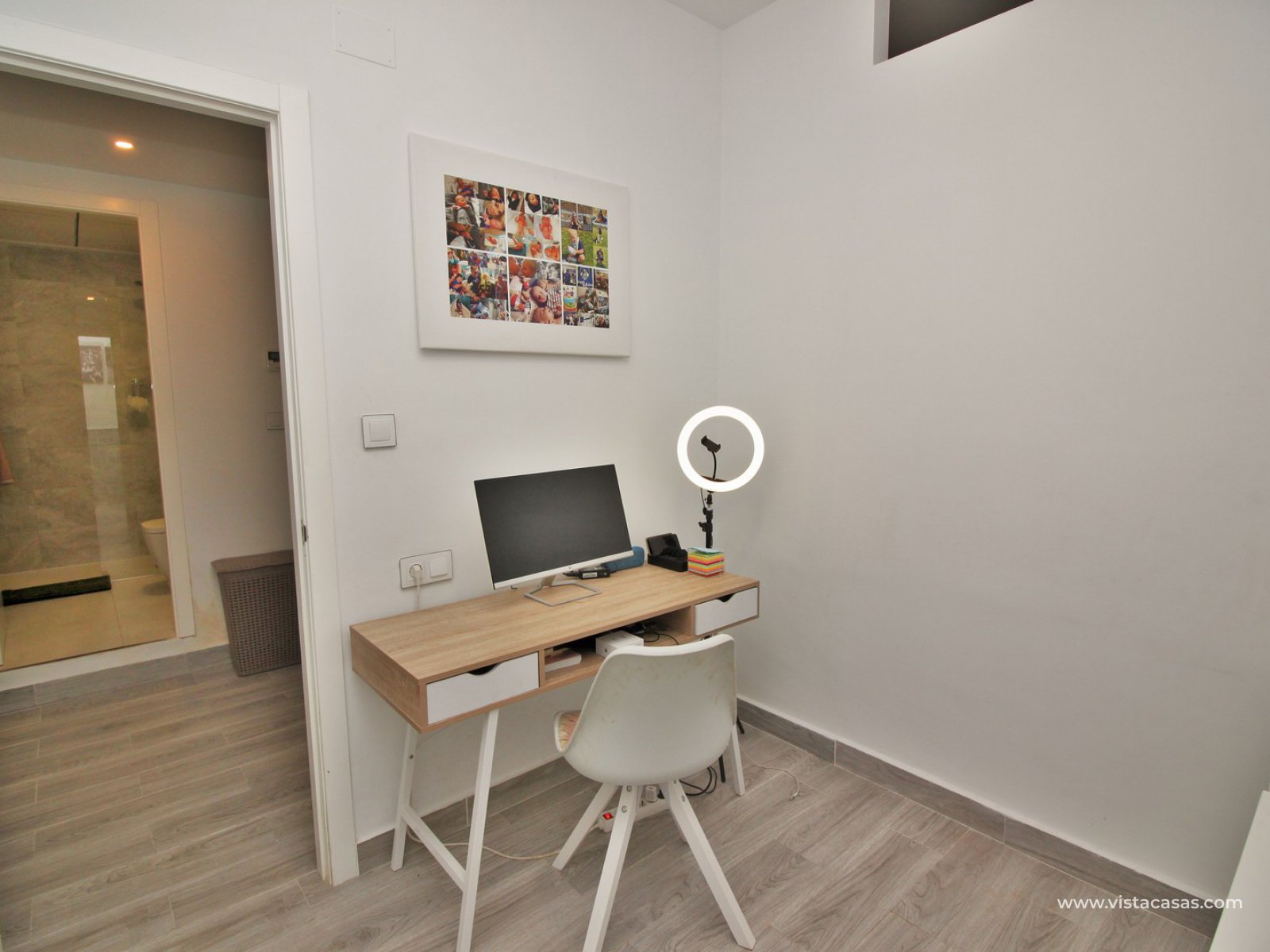 The living accommodation is divided over 3 levels with the ground floor comprising of a lounge area with large picture windows, breakfast bar area, a modern fully fitted kitchen with built-in appliances to the rear, 1 double bedroom with fitted wardrobes, and a bathroom with walk-in shower. On the upper level are a further 2 double bedrooms with fitted wardrobes and a family bathroom. The master bedroom offers a beautiful en-suite bathroom with walk-in shower, plus access to a West facing balcony, which is also accessible from the landing area. From the balcony, external stairs leads up to the large roof solarium with retractable awnings. From the solarium you can see the salt lakes of Torrevieja. The underbuild comprises of a a good sized lounge area, a large double bedroom with fitted wardrobes (currently used as a gym area) and a further single bedroom with fitted wardrobes (currently in use as an office space), and a bathroom with walk-in shower. Sold furnished with ducted air-conditioning throughout the property. Outside offers a lovely private swimming pool with front terrace area, to the back of the property is a storage/utility cupboard.