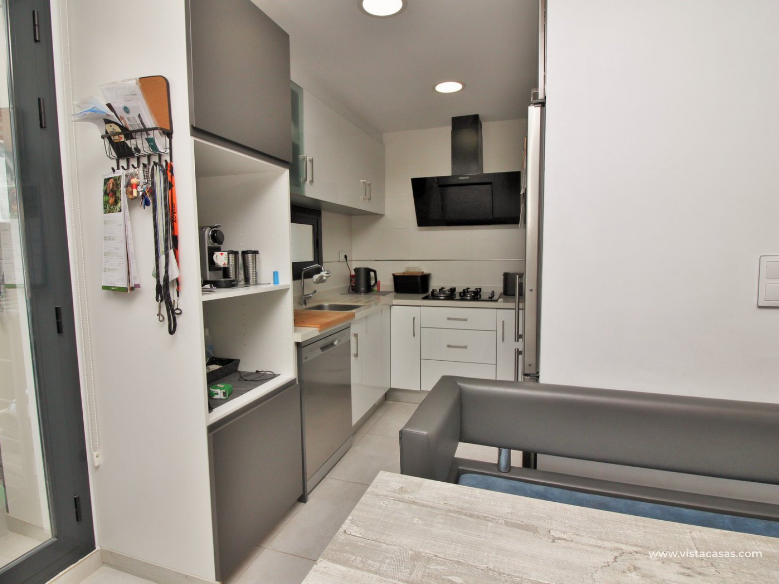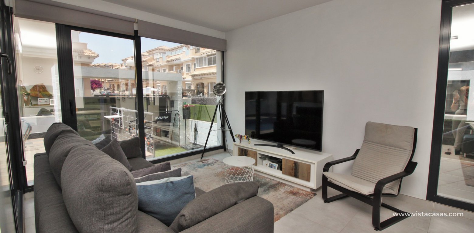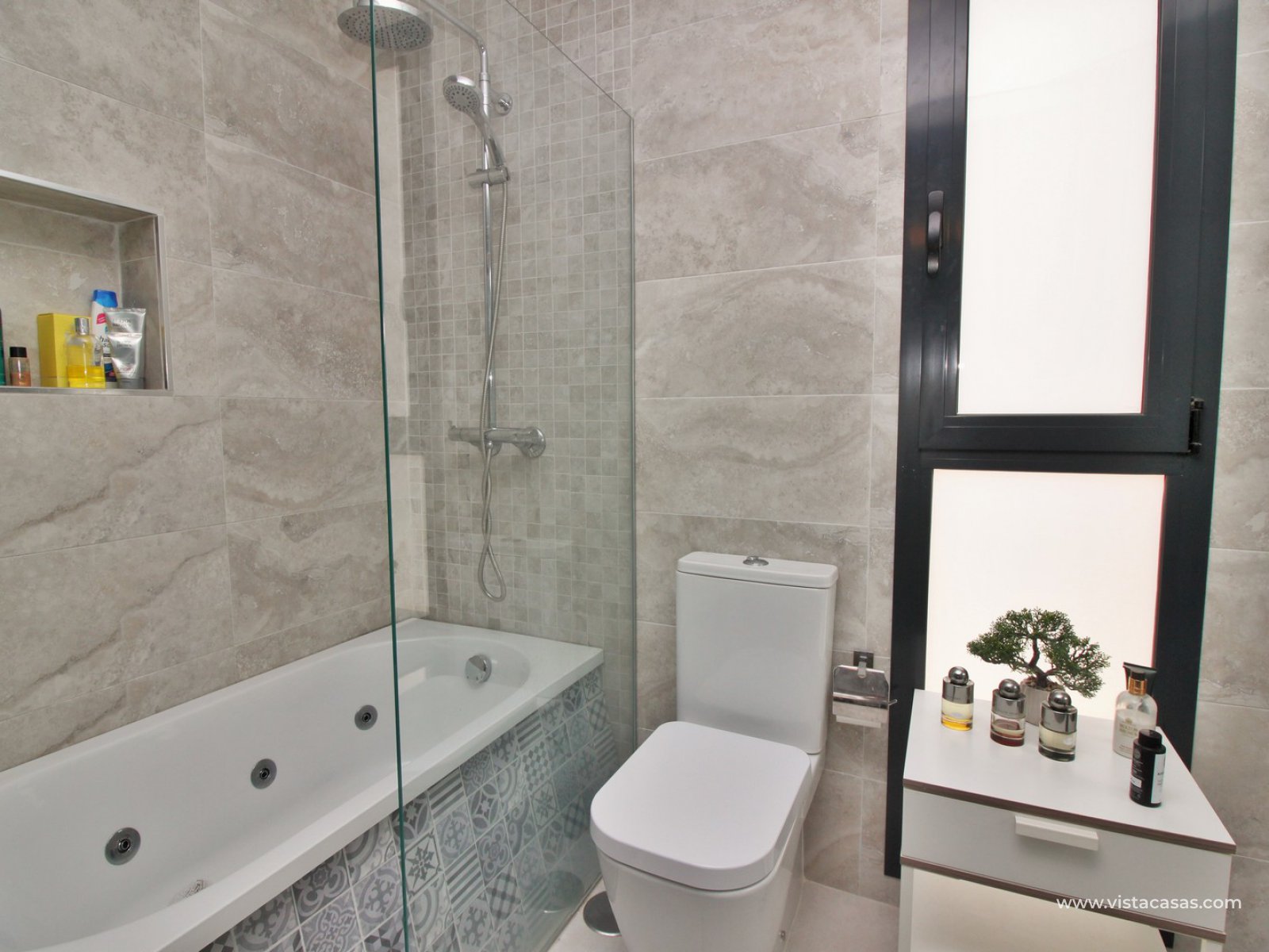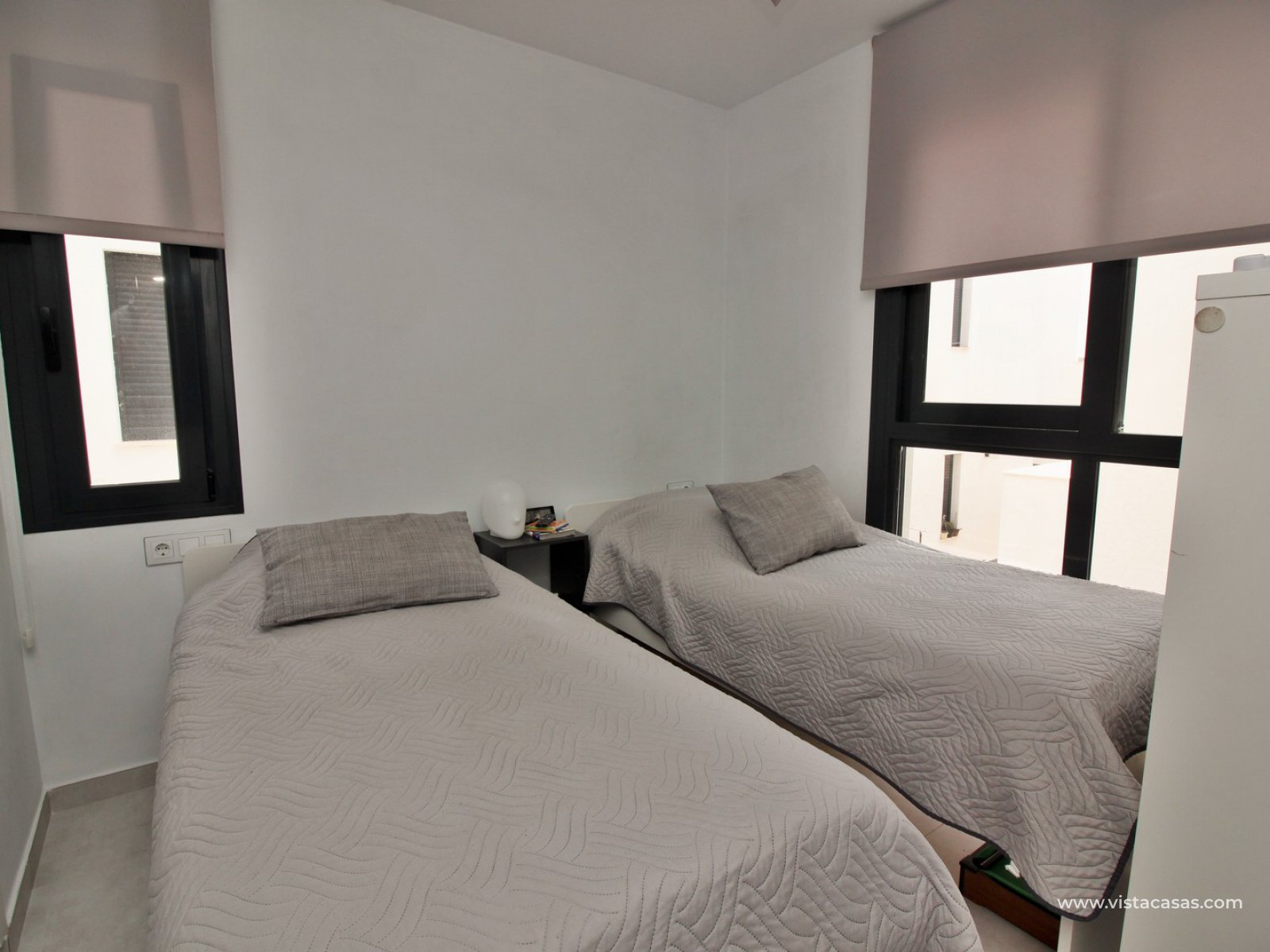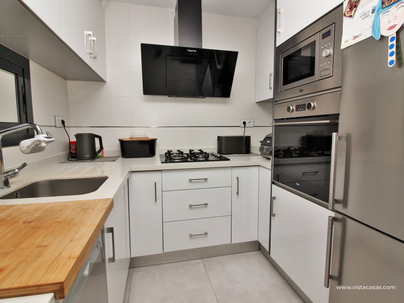 The living accommodation is divided over 3 levels with the ground floor comprising of a lounge area with large picture windows, breakfast bar area, a modern fully fitted kitchen with built-in appliances to the rear, 1 double bedroom with fitted wardrobes, and a bathroom with walk-in shower. On the upper level are a further 2 double bedrooms with fitted wardrobes and a family bathroom. The master bedroom offers a beautiful en-suite bathroom with walk-in shower, plus access to a West facing balcony, which is also accessible from the landing area. From the balcony, external stairs leads up to the large roof solarium with retractable awnings. From the solarium you can see the salt lakes of Torrevieja. The underbuild comprises of a a good sized lounge area, a large double bedroom with fitted wardrobes (currently used as a gym area) and a further single bedroom with fitted wardrobes (currently in use as an office space), and a bathroom with walk-in shower. Sold furnished with ducted air-conditioning throughout the property. Outside offers a lovely private swimming pool with front terrace area, to the back of the property is a storage/utility cupboard.