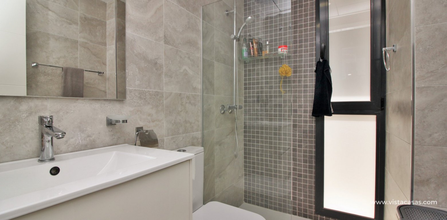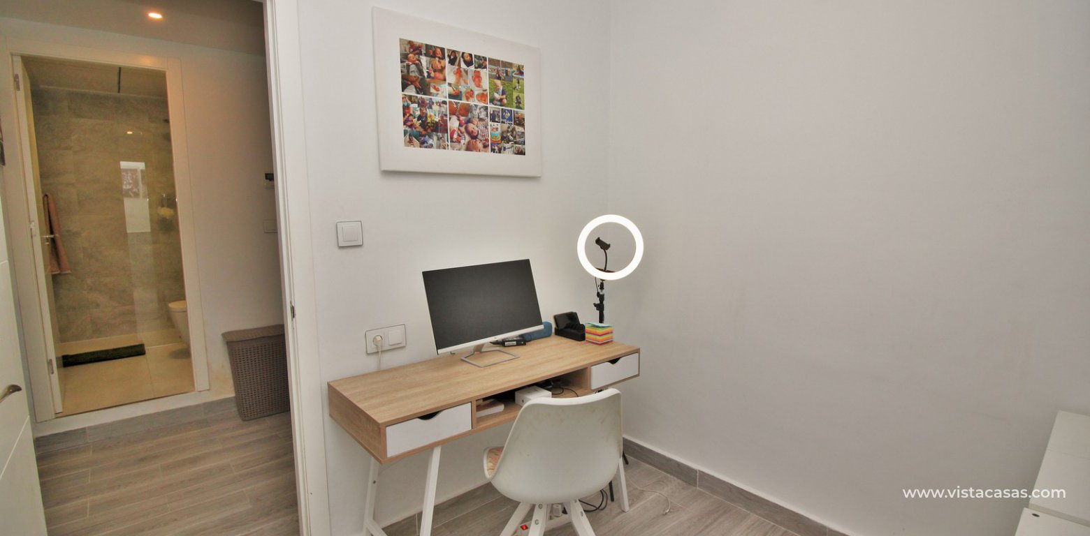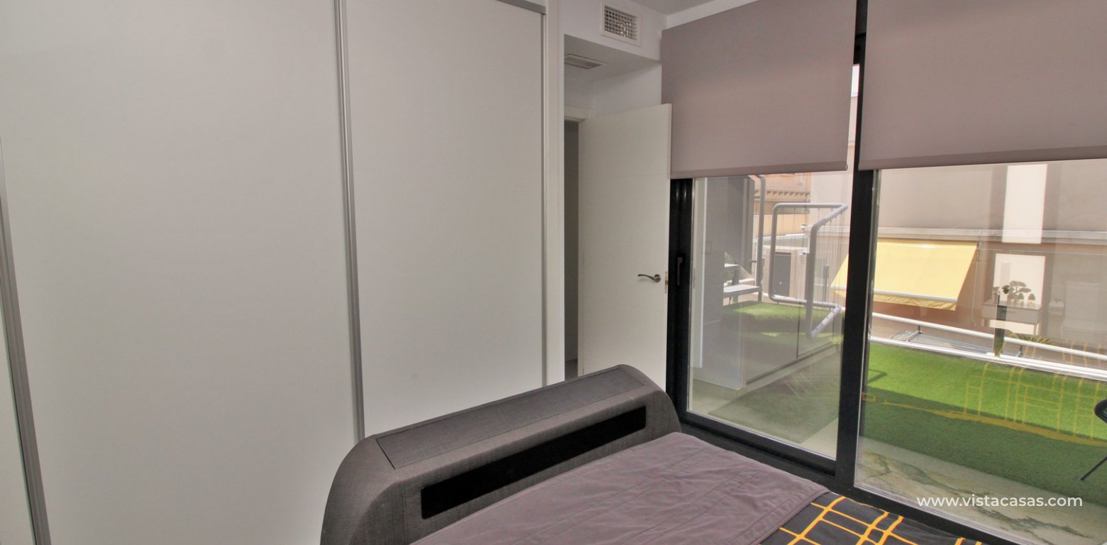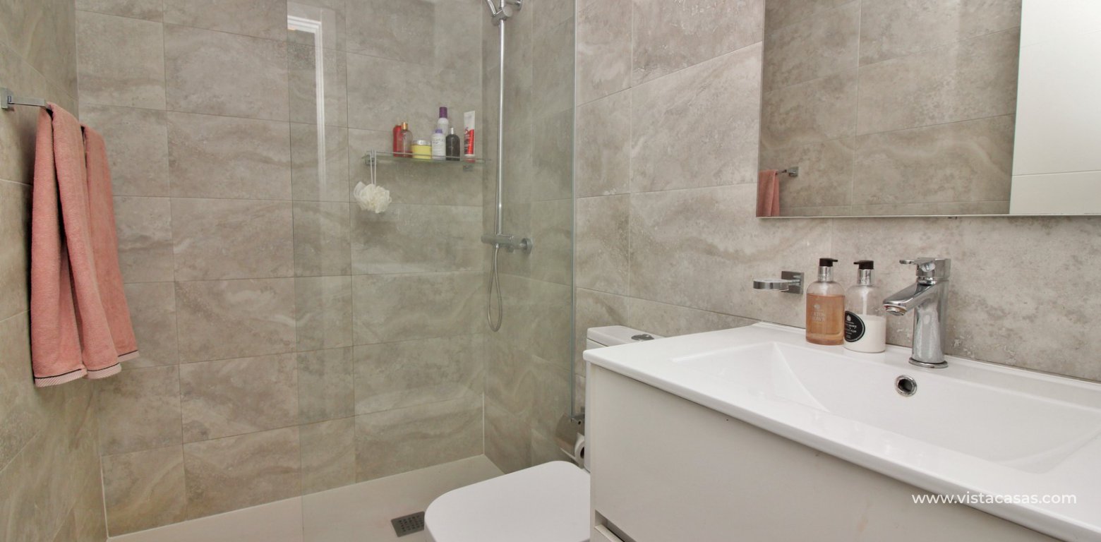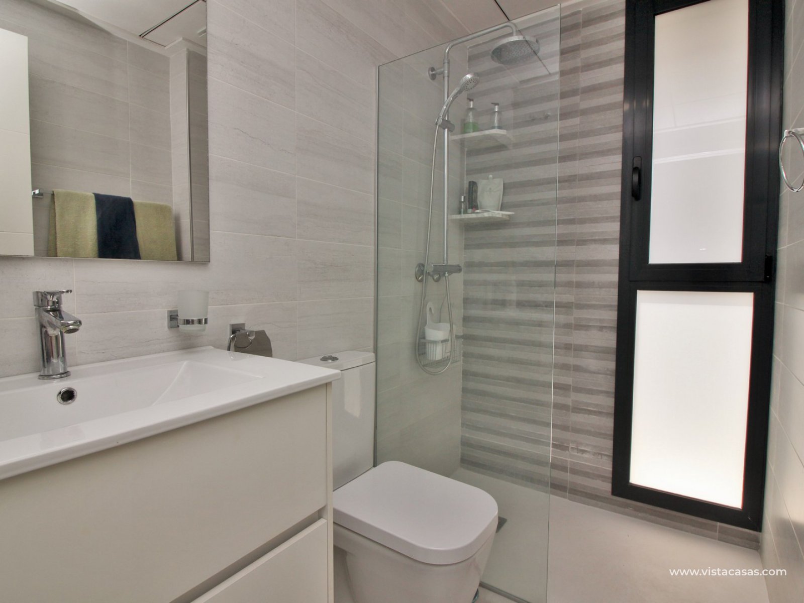 The living accommodation is divided over 3 levels with the ground floor comprising of a lounge area with large picture windows, breakfast bar area, a modern fully fitted kitchen with built-in appliances to the rear, 1 double bedroom with fitted wardrobes, and a bathroom with walk-in shower. On the upper level are a further 2 double bedrooms with fitted wardrobes and a family bathroom. The master bedroom offers a beautiful en-suite bathroom with walk-in shower, plus access to a West facing balcony, which is also accessible from the landing area. From the balcony, external stairs leads up to the large roof solarium with retractable awnings. From the solarium you can see the salt lakes of Torrevieja. The underbuild comprises of a a good sized lounge area, a large double bedroom with fitted wardrobes (currently used as a gym area) and a further single bedroom with fitted wardrobes (currently in use as an office space), and a bathroom with walk-in shower. Sold furnished with ducted air-conditioning throughout the property. Outside offers a lovely private swimming pool with front terrace area, to the back of the property is a storage/utility cupboard.