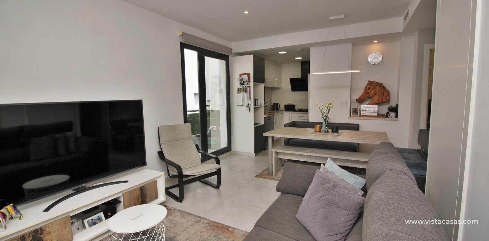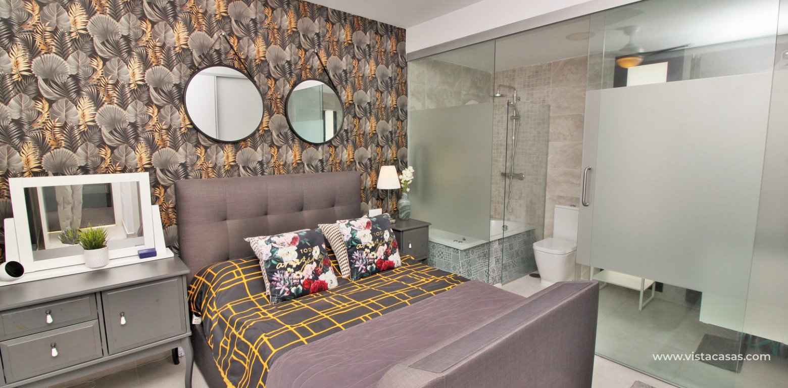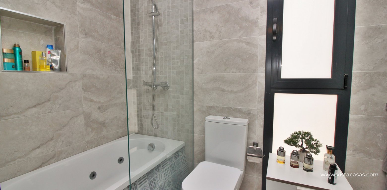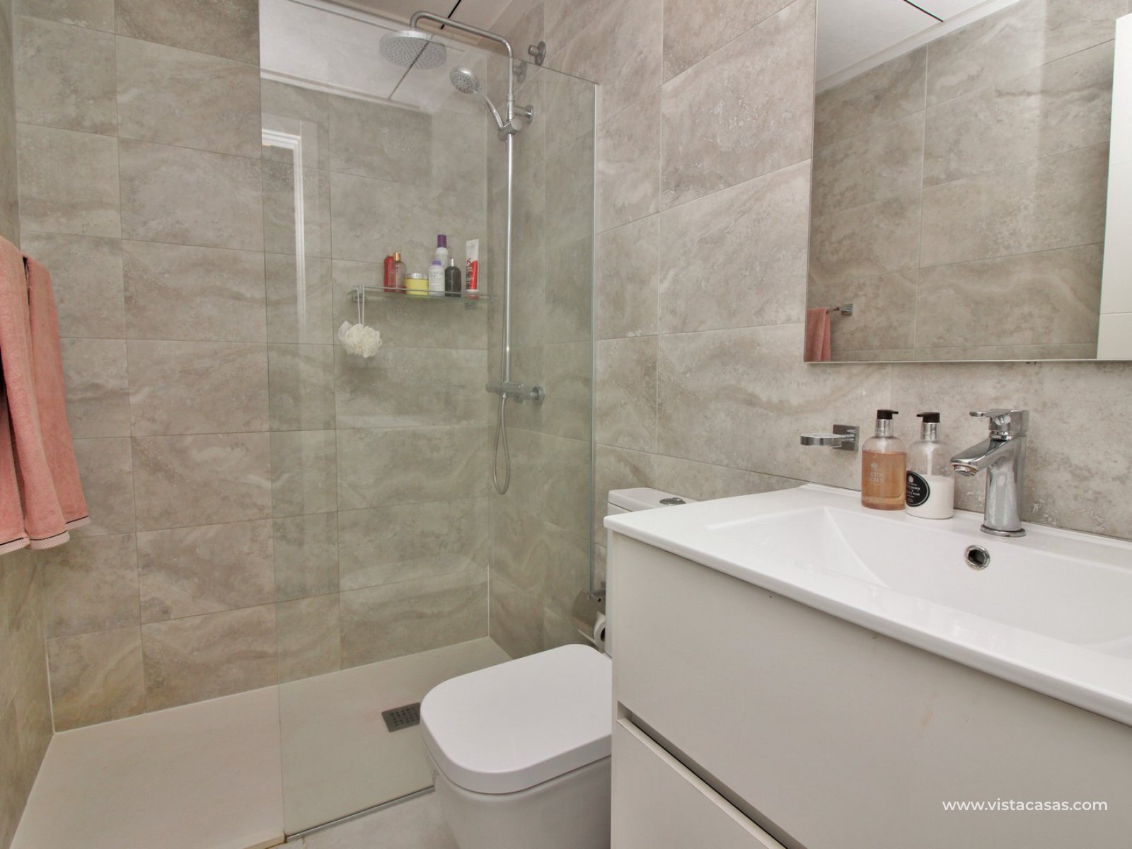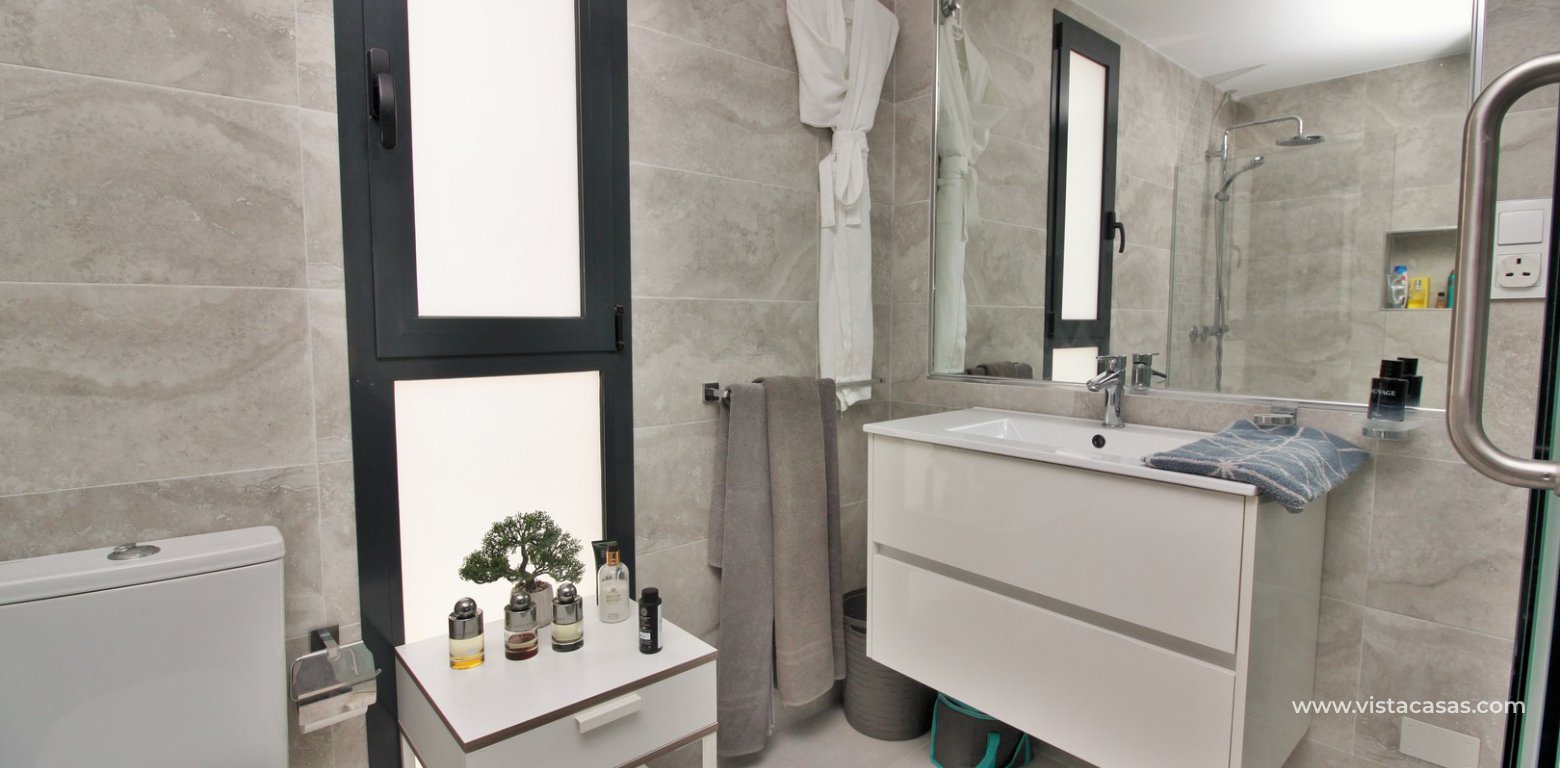 The living accommodation is divided over 3 levels with the ground floor comprising of a lounge area with large picture windows, breakfast bar area, a modern fully fitted kitchen with built-in appliances to the rear, 1 double bedroom with fitted wardrobes, and a bathroom with walk-in shower. On the upper level are a further 2 double bedrooms with fitted wardrobes and a family bathroom. The master bedroom offers a beautiful en-suite bathroom with walk-in shower, plus access to a West facing balcony, which is also accessible from the landing area. From the balcony, external stairs leads up to the large roof solarium with retractable awnings. From the solarium you can see the salt lakes of Torrevieja. The underbuild comprises of a a good sized lounge area, a large double bedroom with fitted wardrobes (currently used as a gym area) and a further single bedroom with fitted wardrobes (currently in use as an office space), and a bathroom with walk-in shower. Sold furnished with ducted air-conditioning throughout the property. Outside offers a lovely private swimming pool with front terrace area, to the back of the property is a storage/utility cupboard.