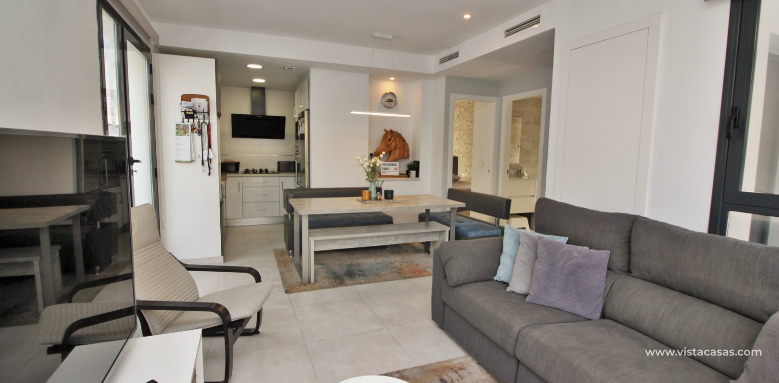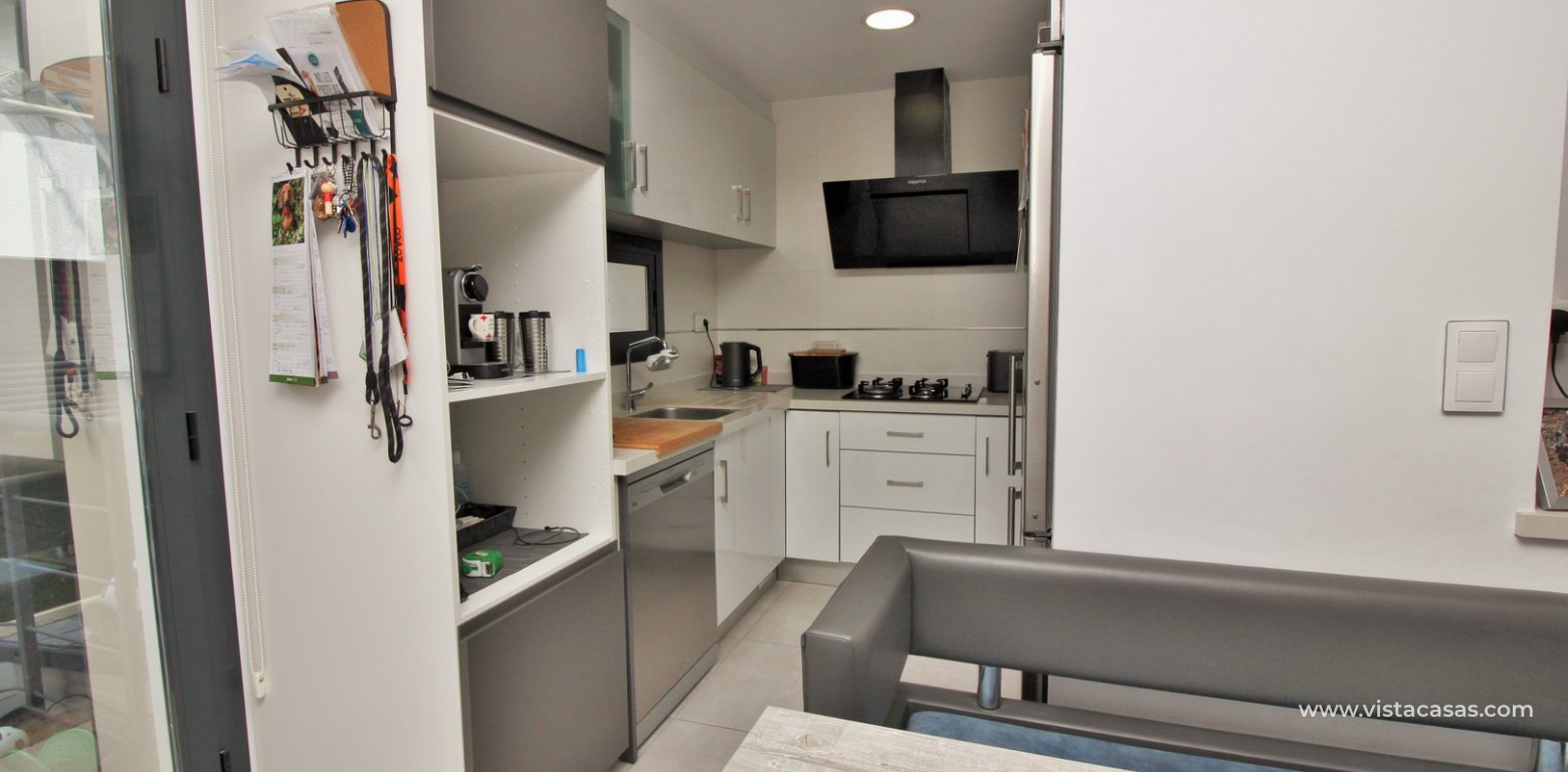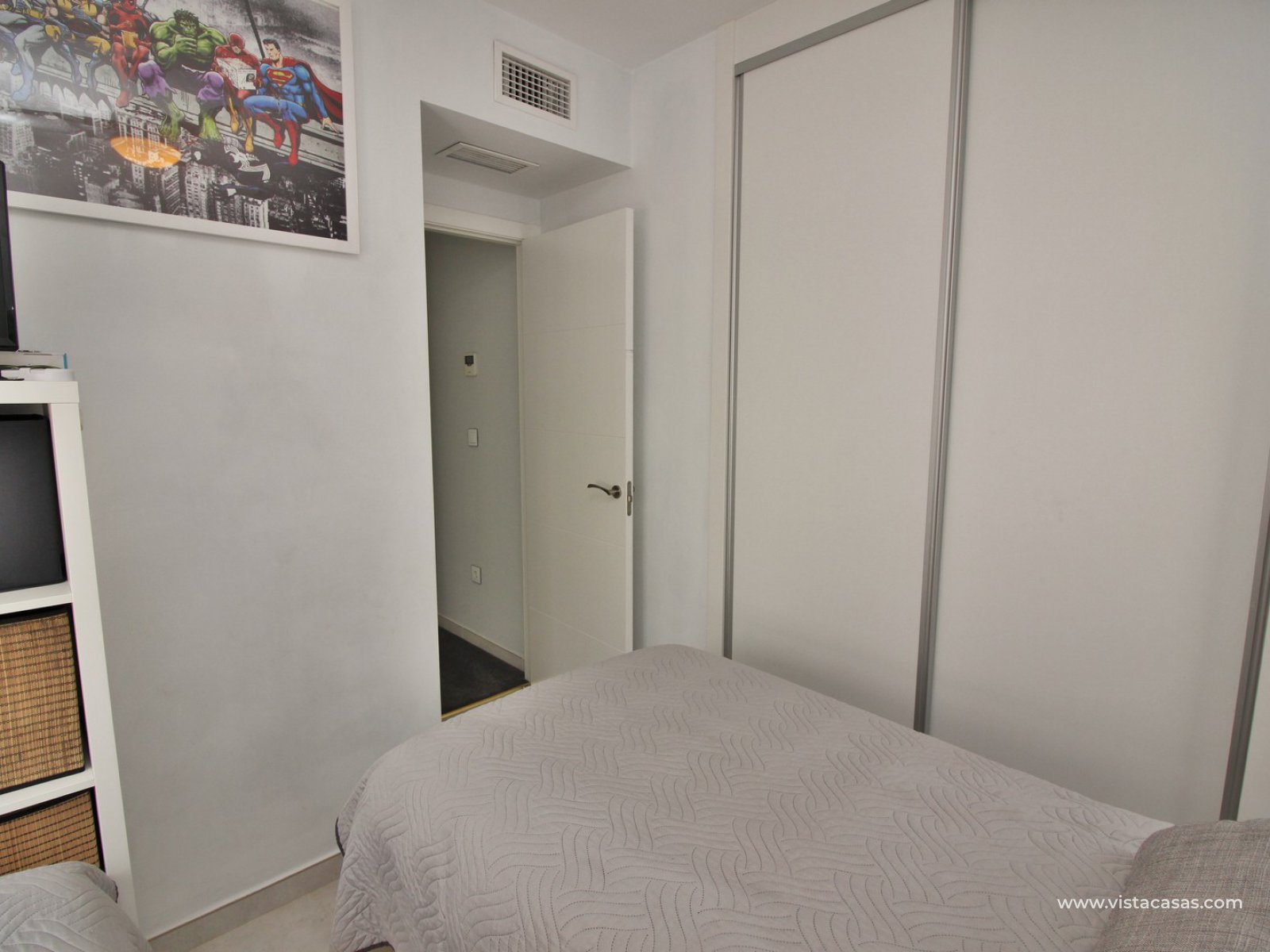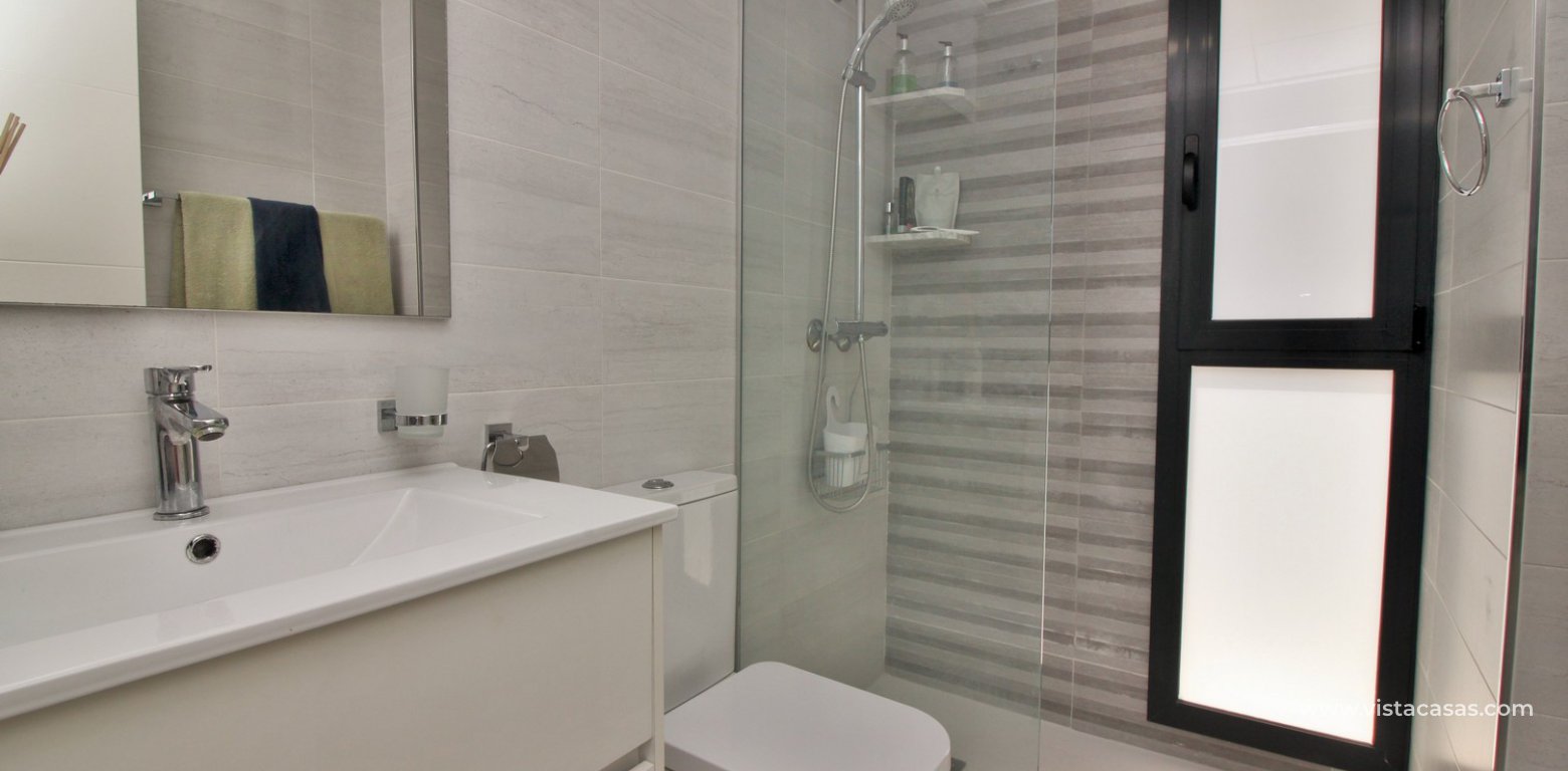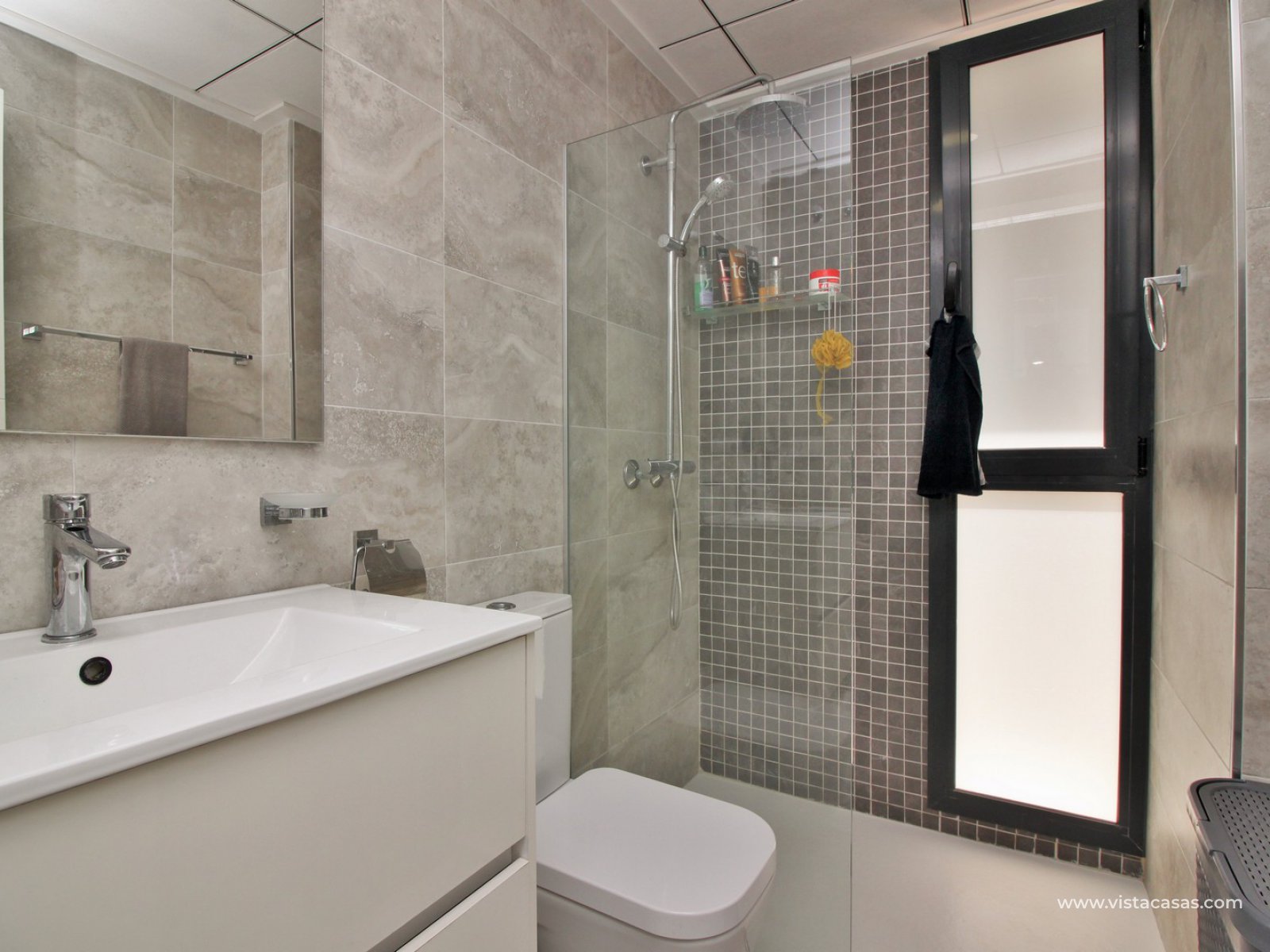 The living accommodation is divided over 3 levels with the ground floor comprising of a lounge area with large picture windows, breakfast bar area, a modern fully fitted kitchen with built-in appliances to the rear, 1 double bedroom with fitted wardrobes, and a bathroom with walk-in shower. On the upper level are a further 2 double bedrooms with fitted wardrobes and a family bathroom. The master bedroom offers a beautiful en-suite bathroom with walk-in shower, plus access to a West facing balcony, which is also accessible from the landing area. From the balcony, external stairs leads up to the large roof solarium with retractable awnings. From the solarium you can see the salt lakes of Torrevieja. The underbuild comprises of a a good sized lounge area, a large double bedroom with fitted wardrobes (currently used as a gym area) and a further single bedroom with fitted wardrobes (currently in use as an office space), and a bathroom with walk-in shower. Sold furnished with ducted air-conditioning throughout the property. Outside offers a lovely private swimming pool with front terrace area, to the back of the property is a storage/utility cupboard.