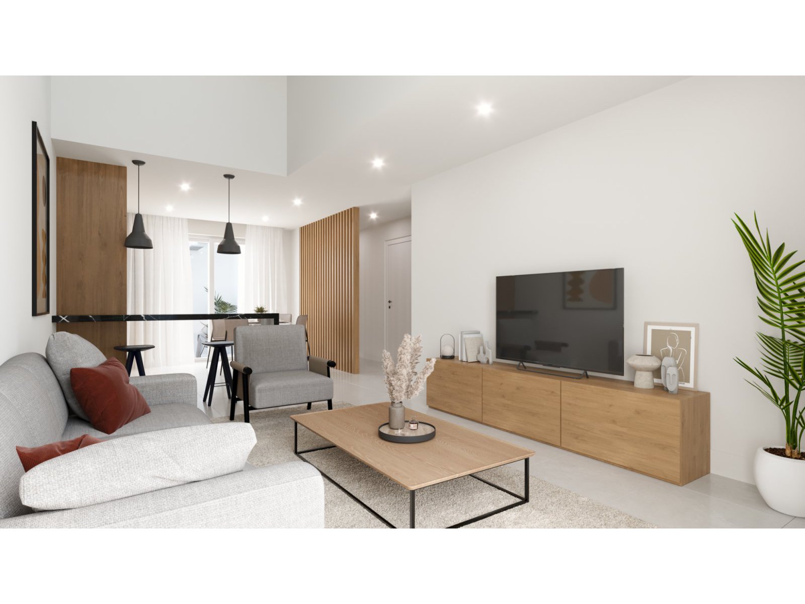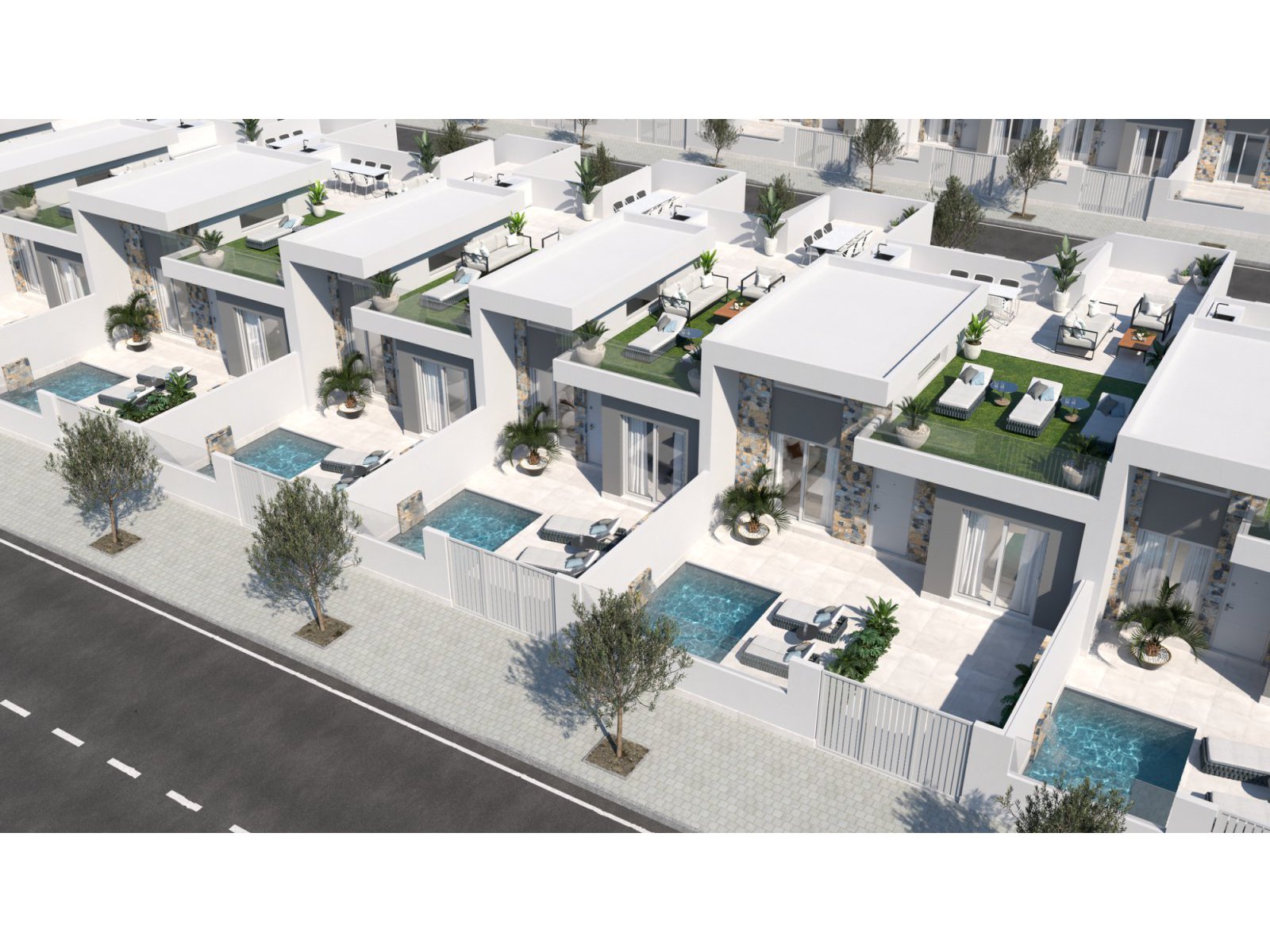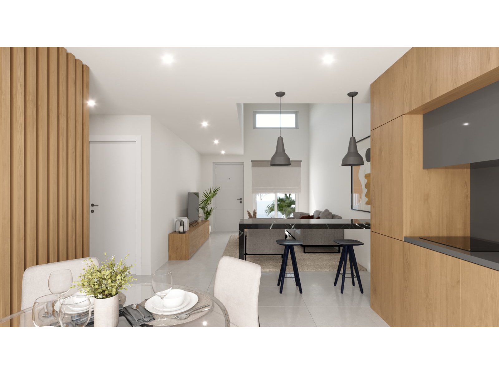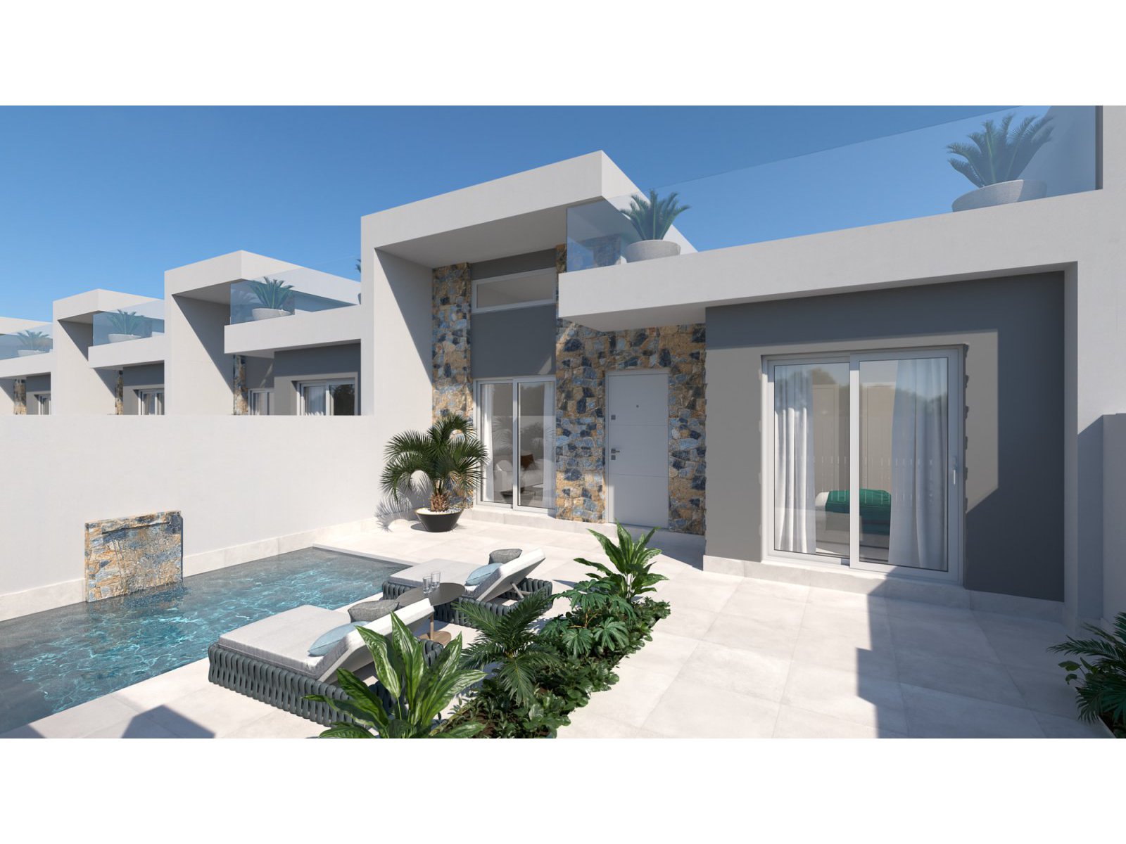 New build villa in Balsicas, a village in the inland area of Costa Cálida. The village offers a selection of daily services and a train station with a link to Murcia city centre. The neighbouring towns of San Javier and San Pedro del Pinatar are the closest coastal areas with beautiful sandy beaches. The project is close to several golf courses, and only 15 minutes’ drive to the fabulous beaches of the Mar Menor. The villa has 3 bedrooms and 2 bathrooms, plus a solarium. The open plan design combines the lounge, dining area and fully equipped kitchen with all kitchen appliances included in the price.The large windows in the lounge open onto the terrace and pool area.