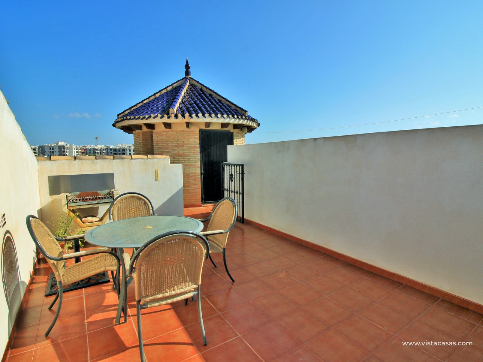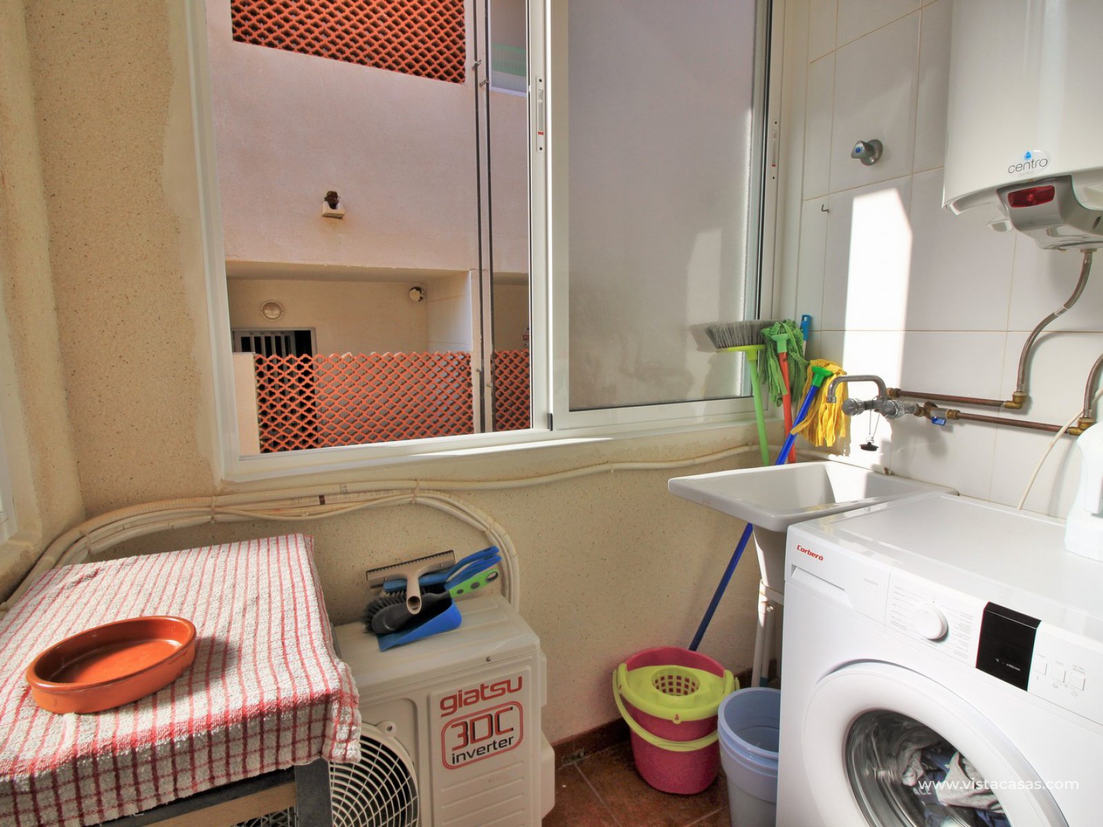 Comprising of a covered front balcony with glass curtains, a lounge-diner, 2 double bedrooms with fitted wardrobes and a family bathroom. To the rear is a good sized kitchen, which is fully equipped with white goods and has access to the rear utility area. There is also a lovely private roof solarium to enjoy all day sunshine, which also offers a storage room, plus glimpse sea views. Part of a community with the use of a communal pool just behind the apartment. The current owners have done many improvements to the property including new exterior doors, air-conditioning units in the lounge and master bedroom, plus opening up the rear utility area with large pvc windows, bringing in more natural light. The apartment is presented well with a bright and airy feel.