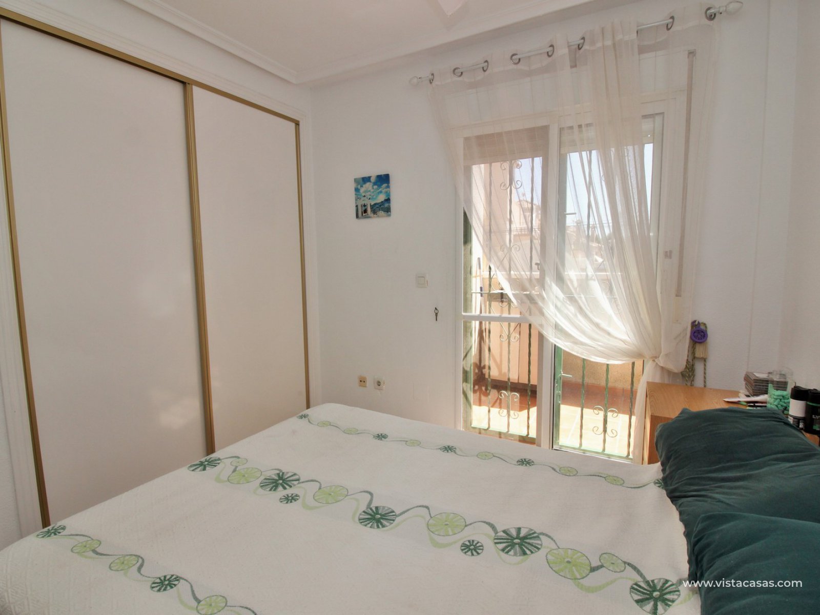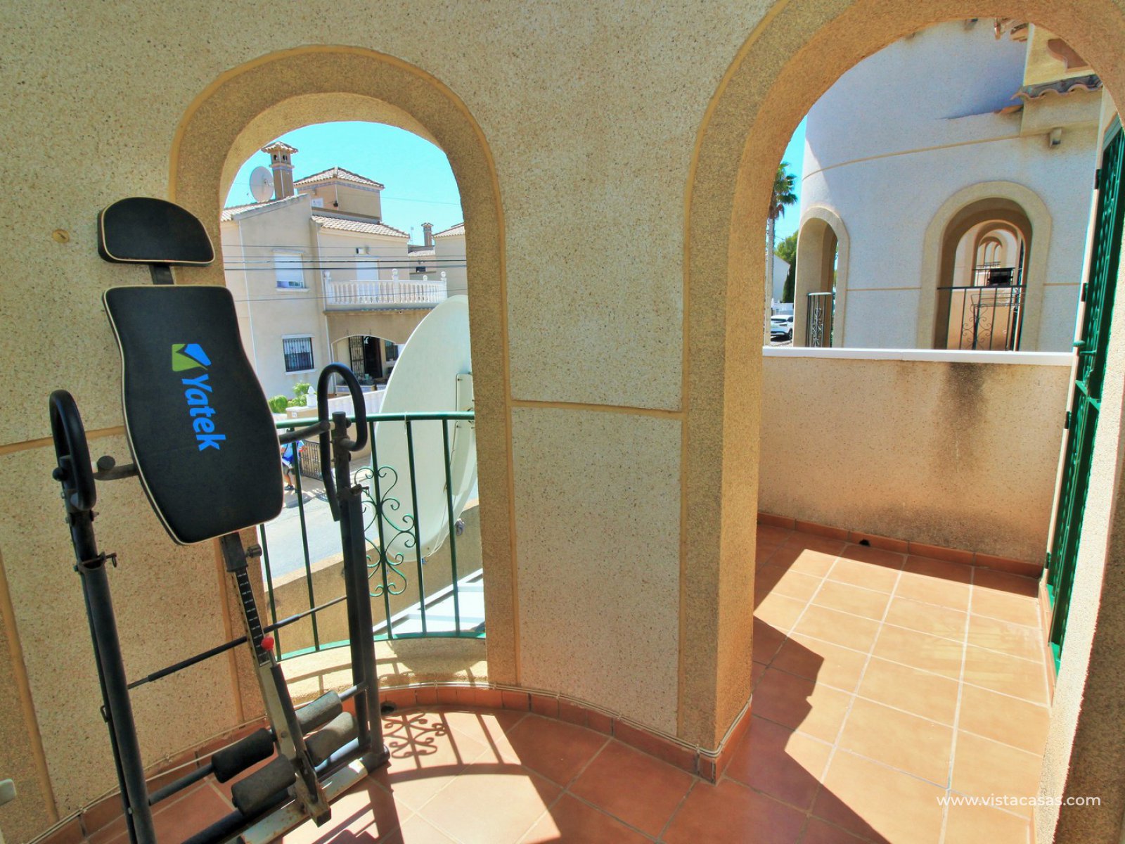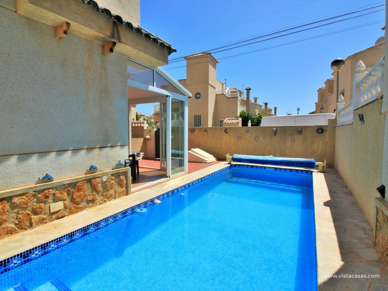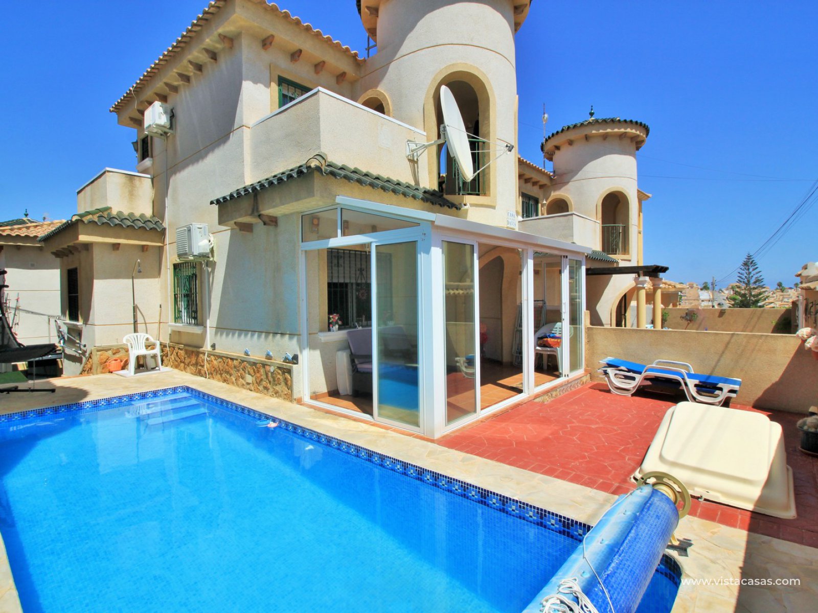 The ground floor living accommodation comprises of a lounge/dining area, renovated separate kitchen, 1 downstairs bedroom and a bathroom with walk-in shower. Upstairs are a further 2 double bedrooms with fitted wardrobes and a family bathroom. Both upstairs bedrooms offer private balconies, with the master bedroom offering a South facing balcony that is partially covered. Outside there is a front conservatory with sliding doors leading out to the private garden and pool area. Sold furnished with air-conditioning and solar panels for hot water.
